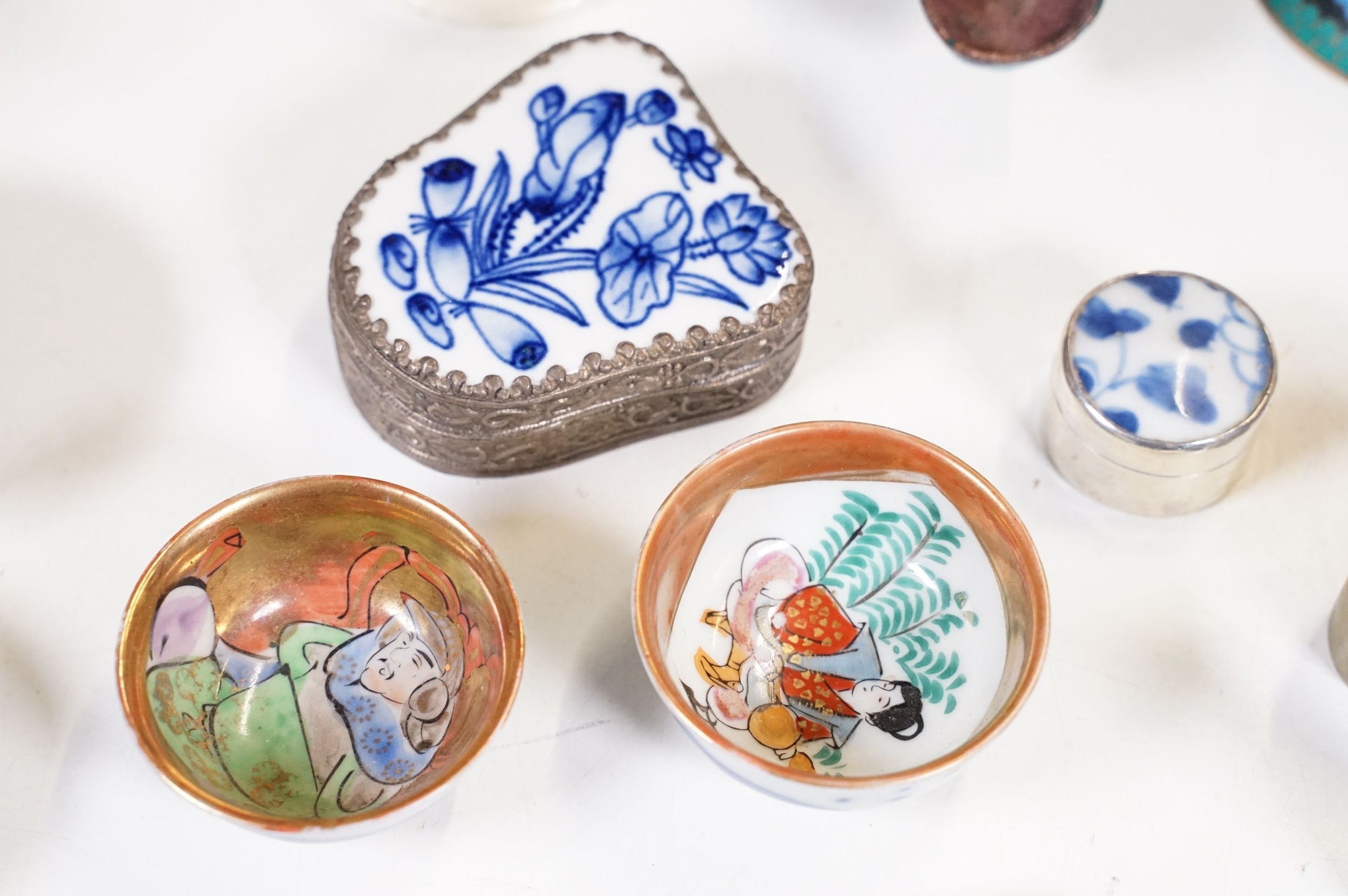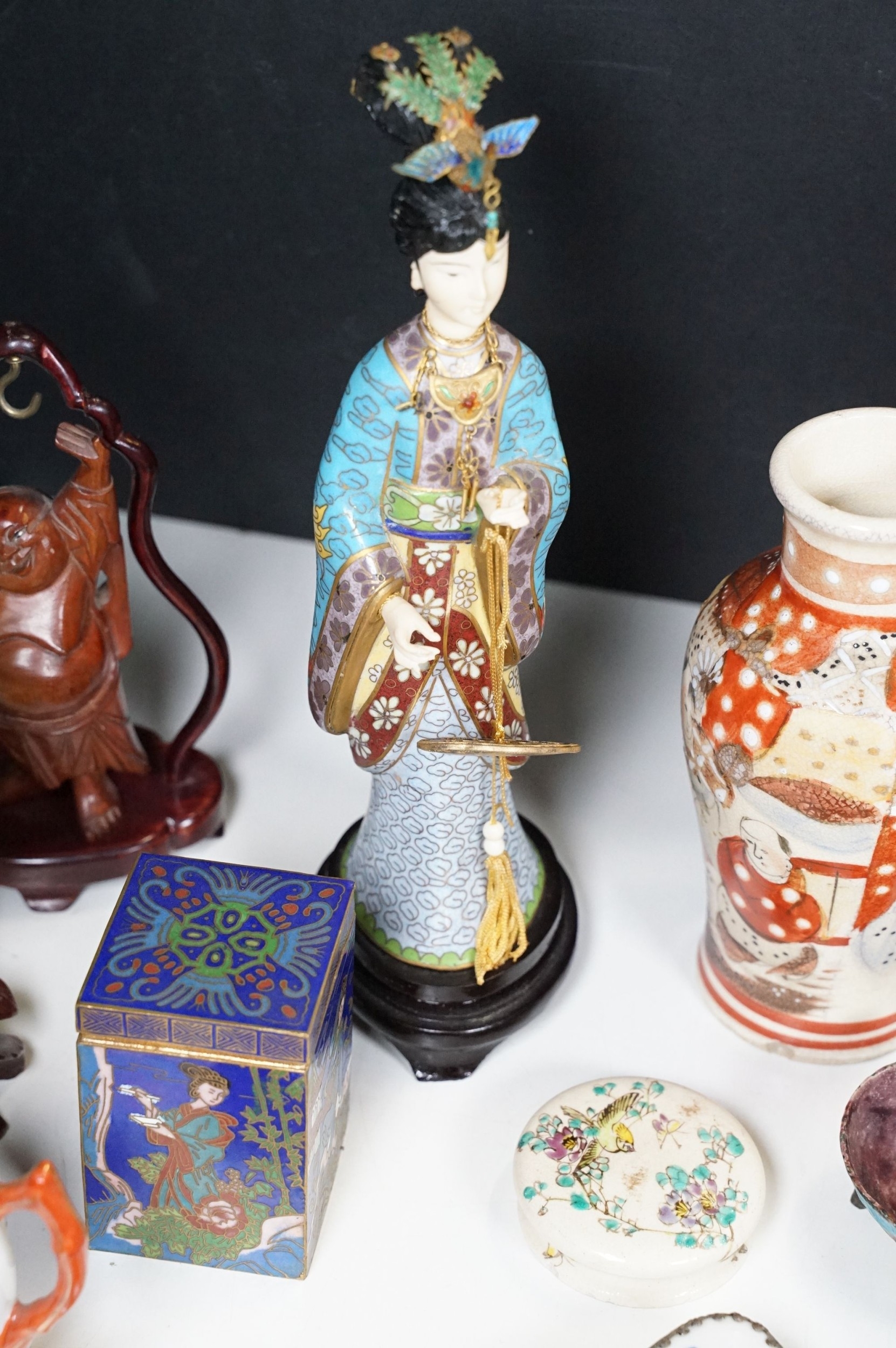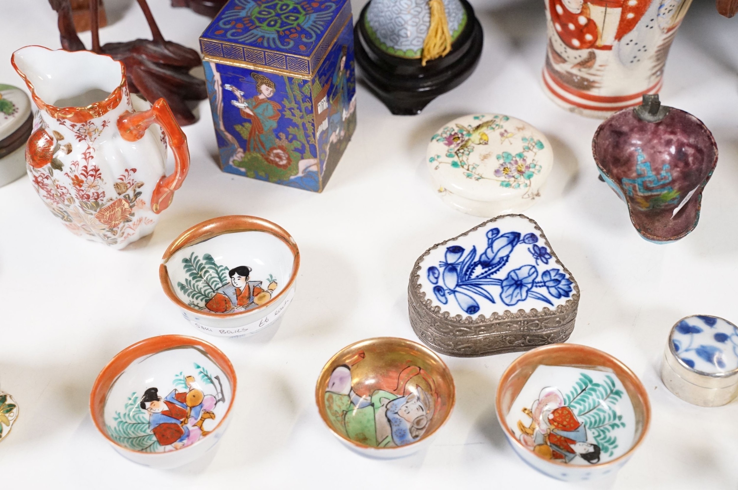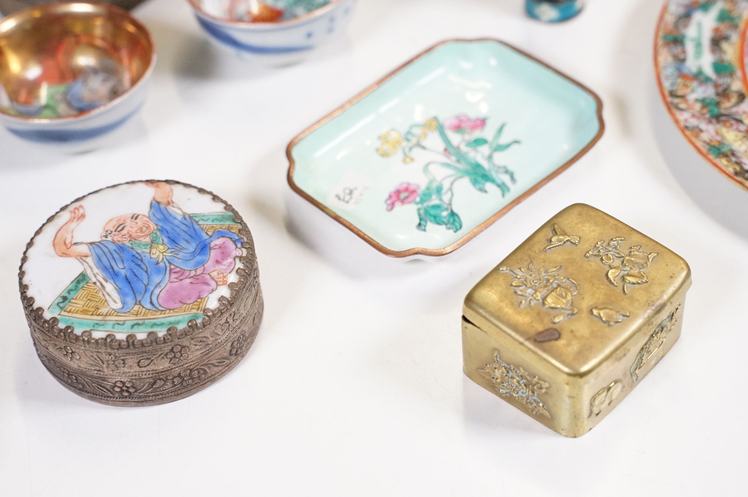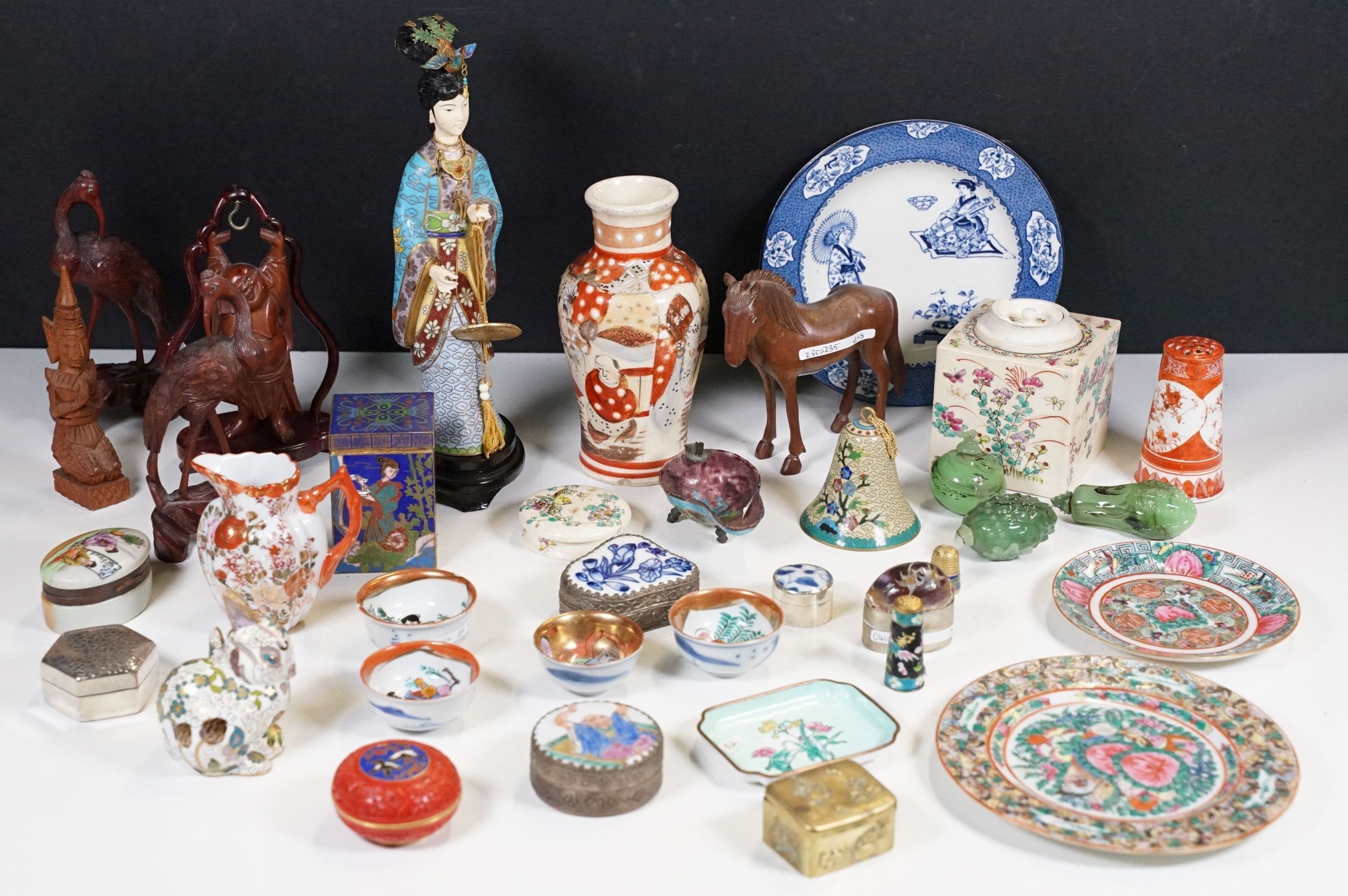 Assorted Chinese related items to include Satsuma vase, Kutani vase and jug, green glass scent bottles, silver 'plate shard' box marked 925, Famille Rose plates, trinket boxes, small bowls and cloisonné examples in varying forms (1 box)
