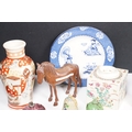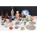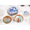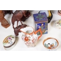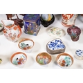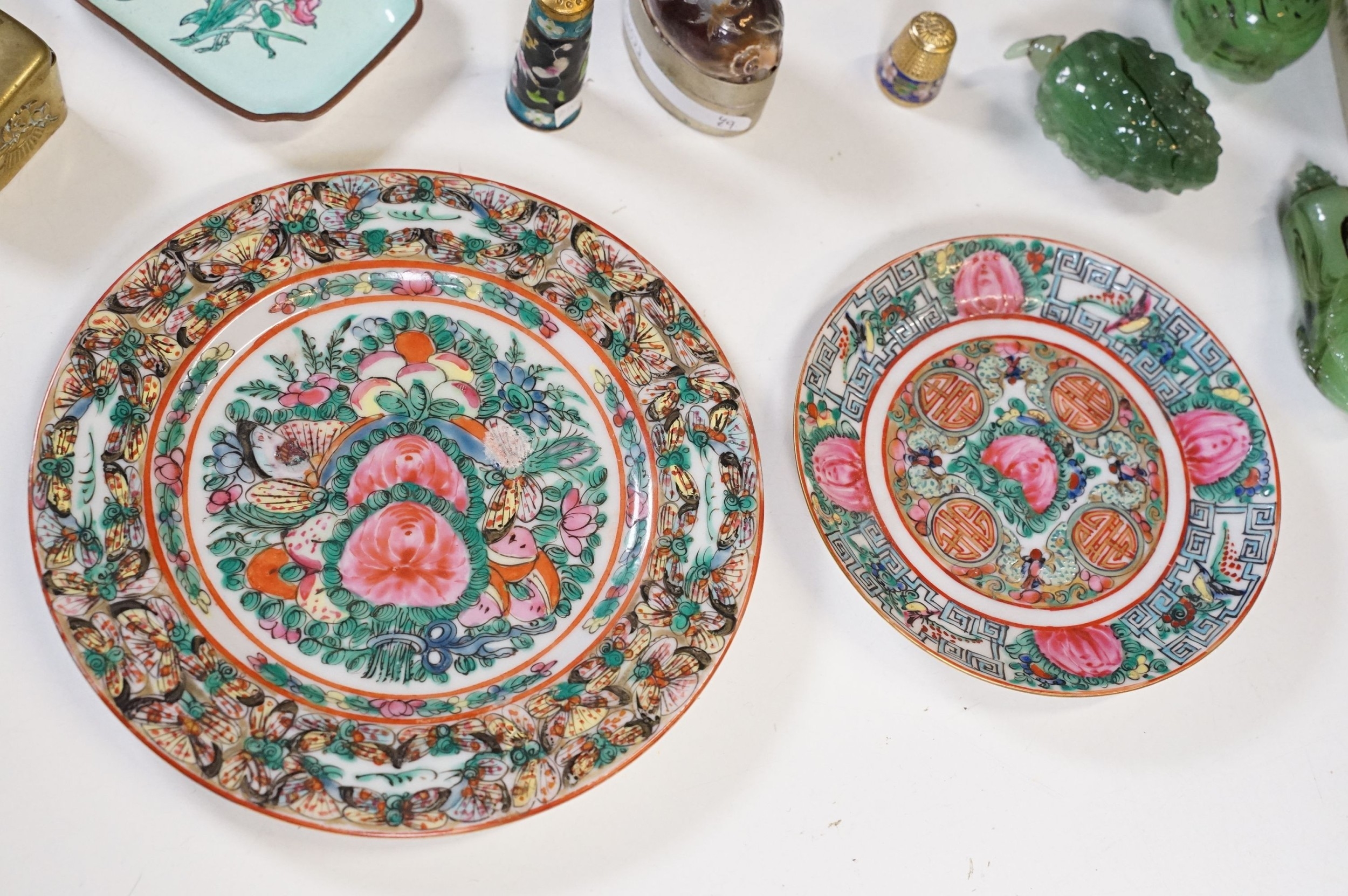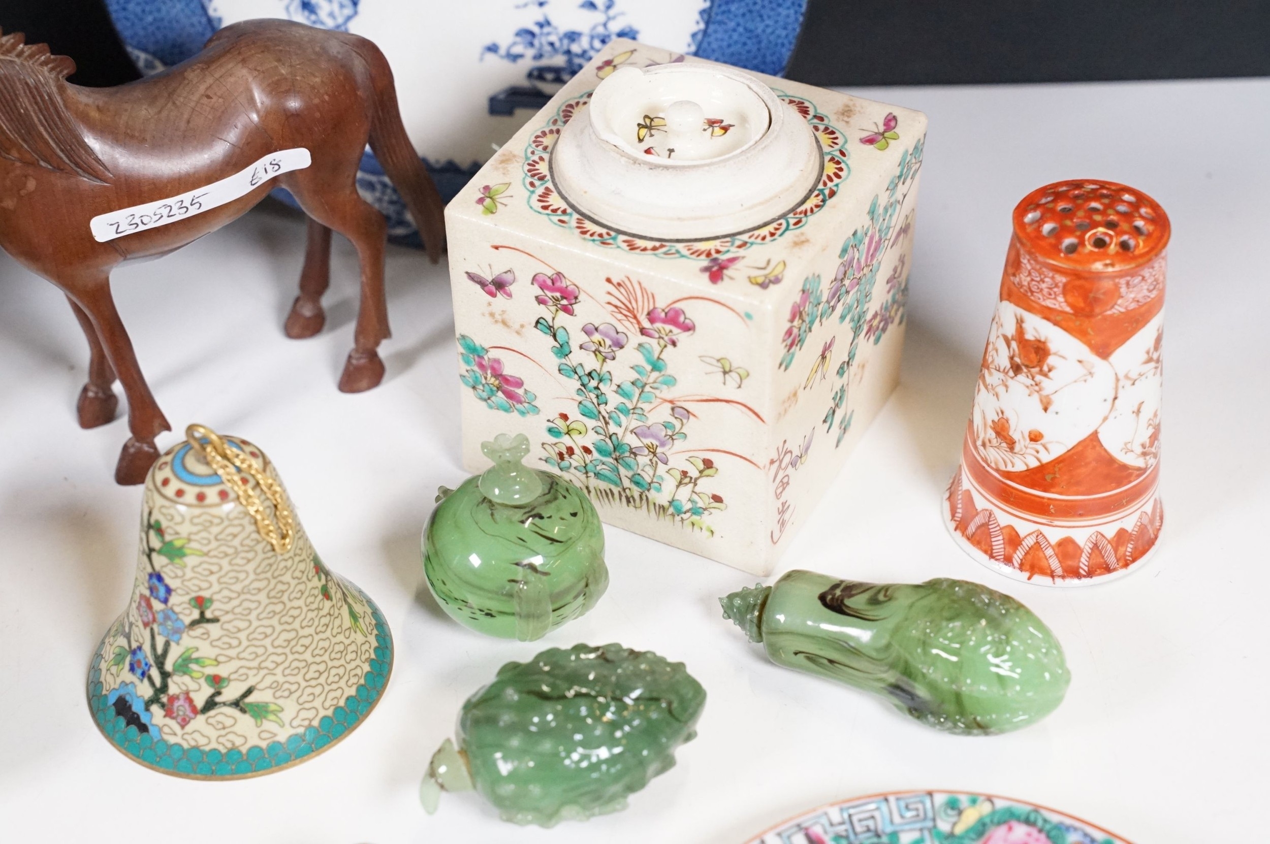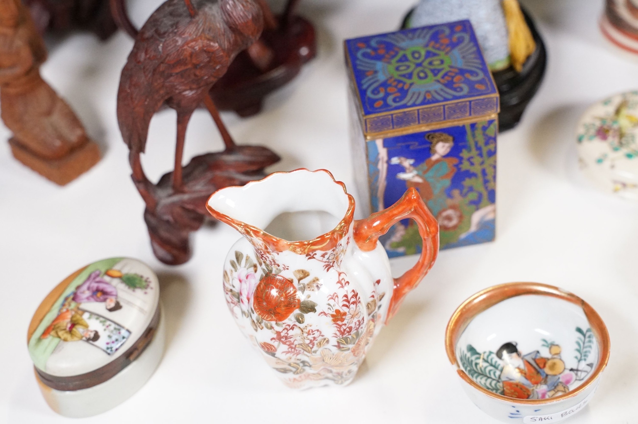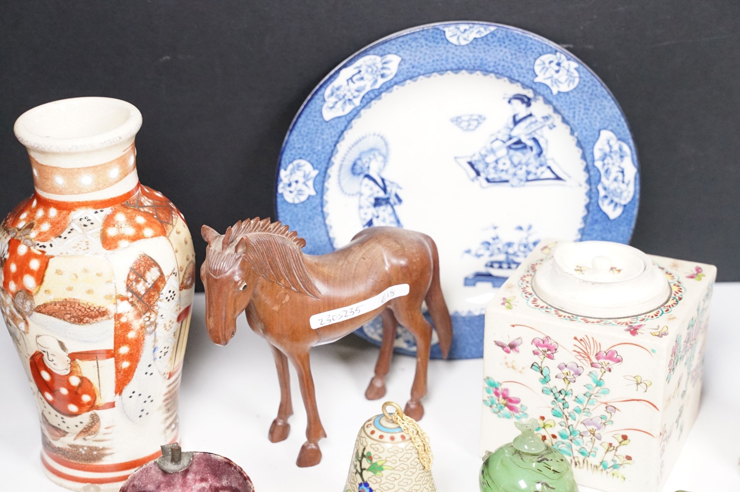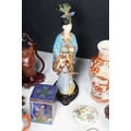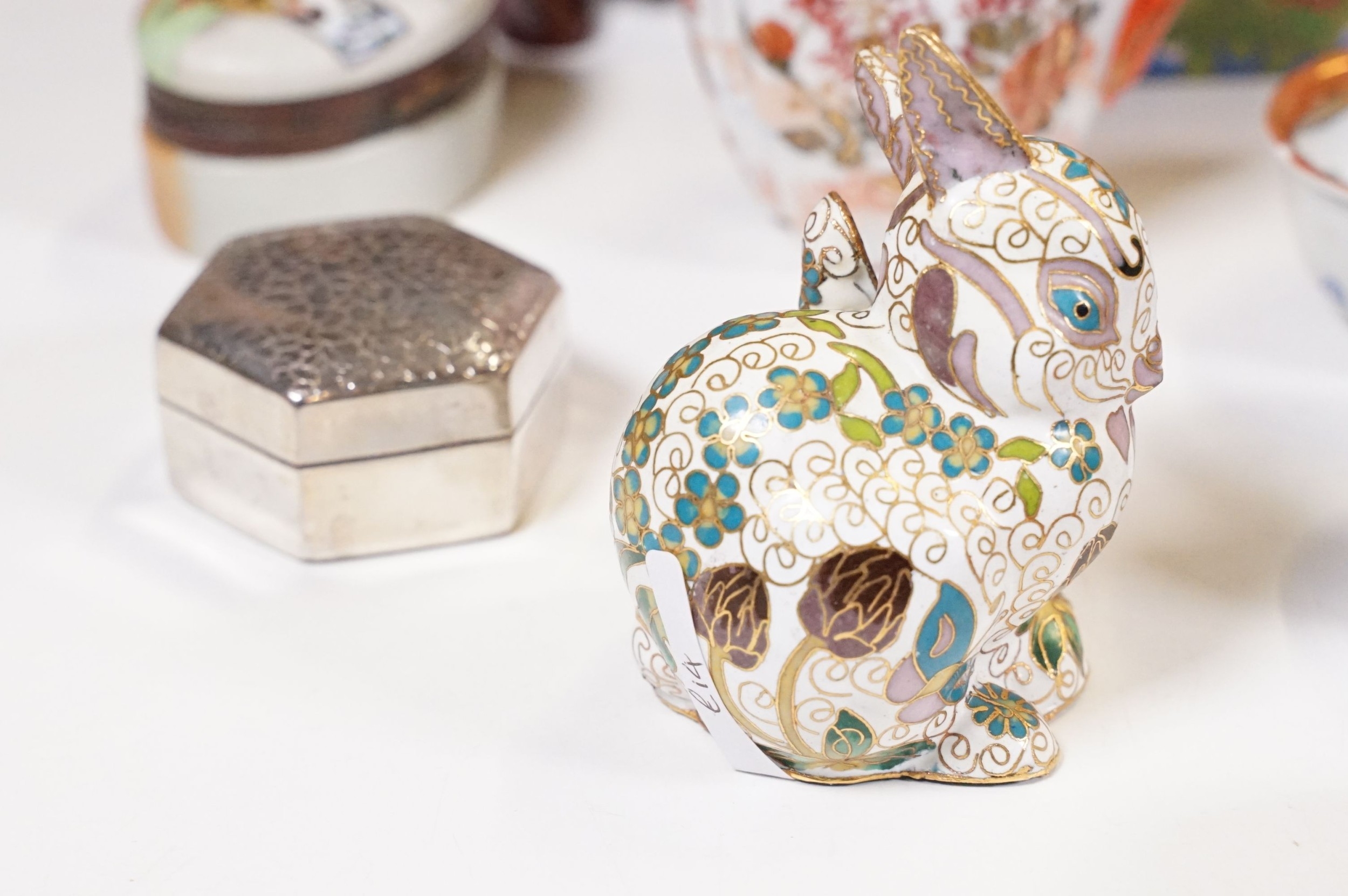 Assorted Chinese related items to include Satsuma vase, Kutani vase and jug, green glass scent bottles, silver 'plate shard' box marked 925, Famille Rose plates, trinket boxes, small bowls and cloisonné examples in varying forms (1 box)