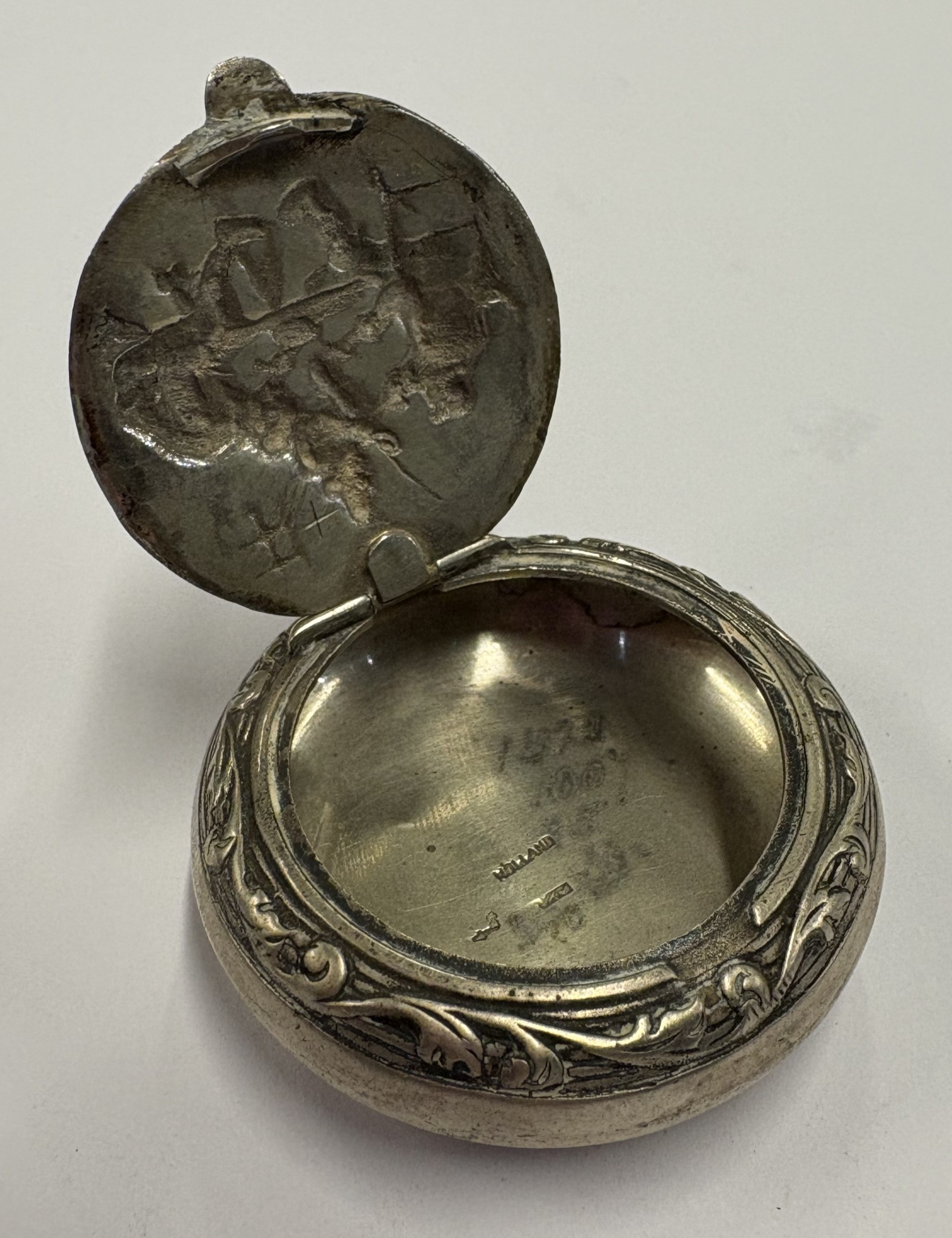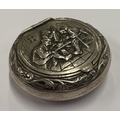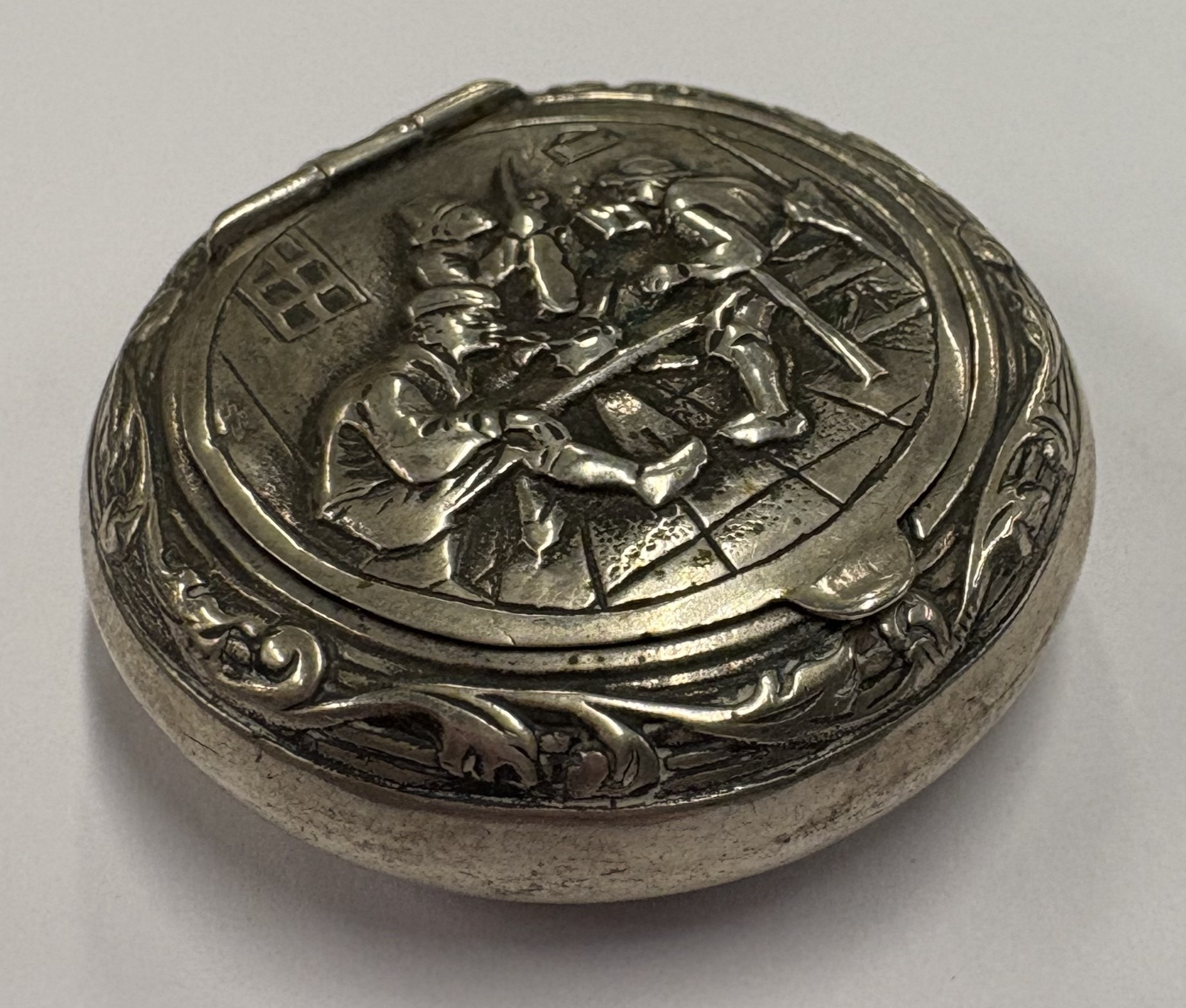 A chased silver snuff box with embossed tavern scene to cover. Approx. 24 grams. Est. £50 - £80.