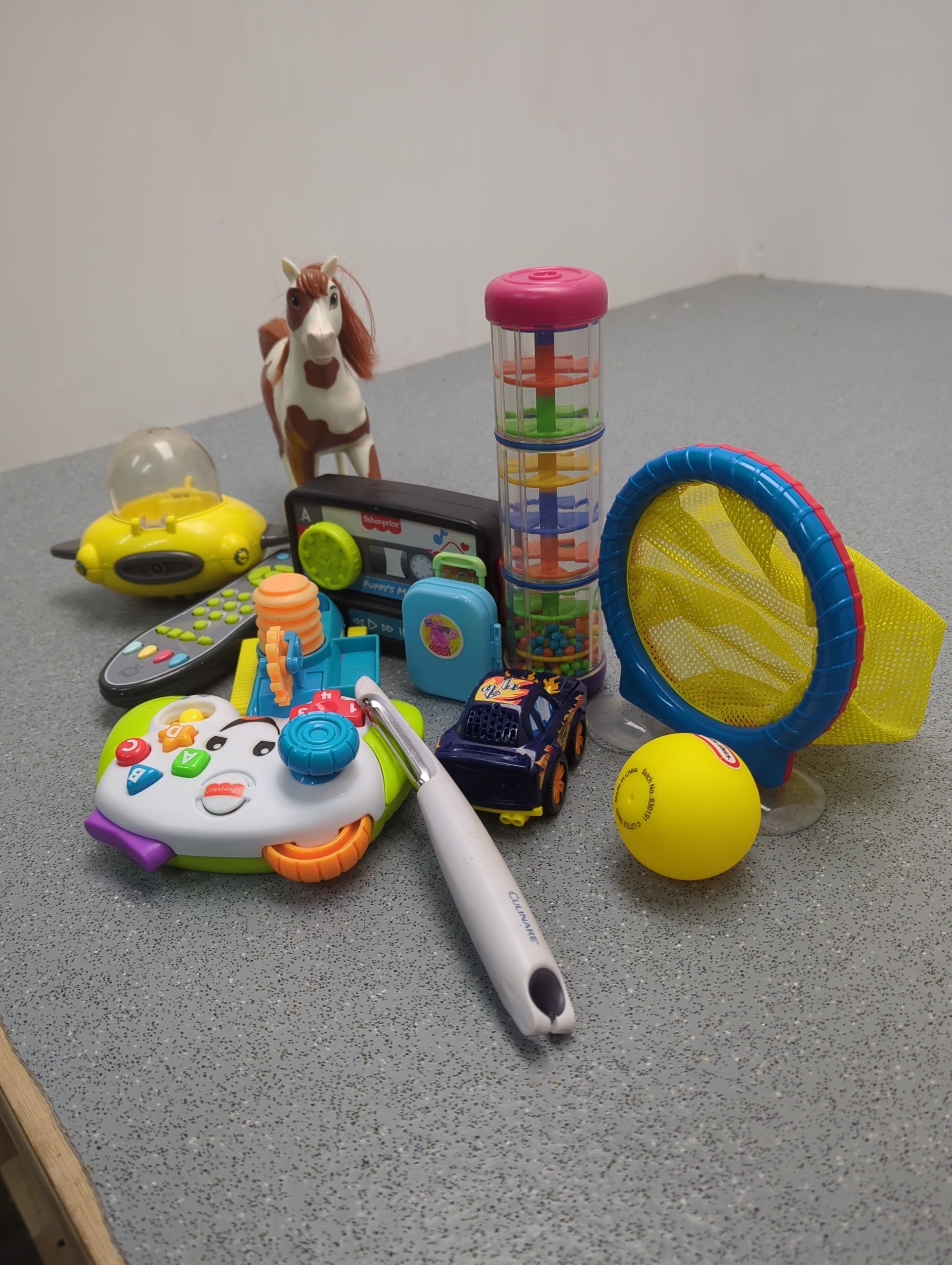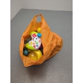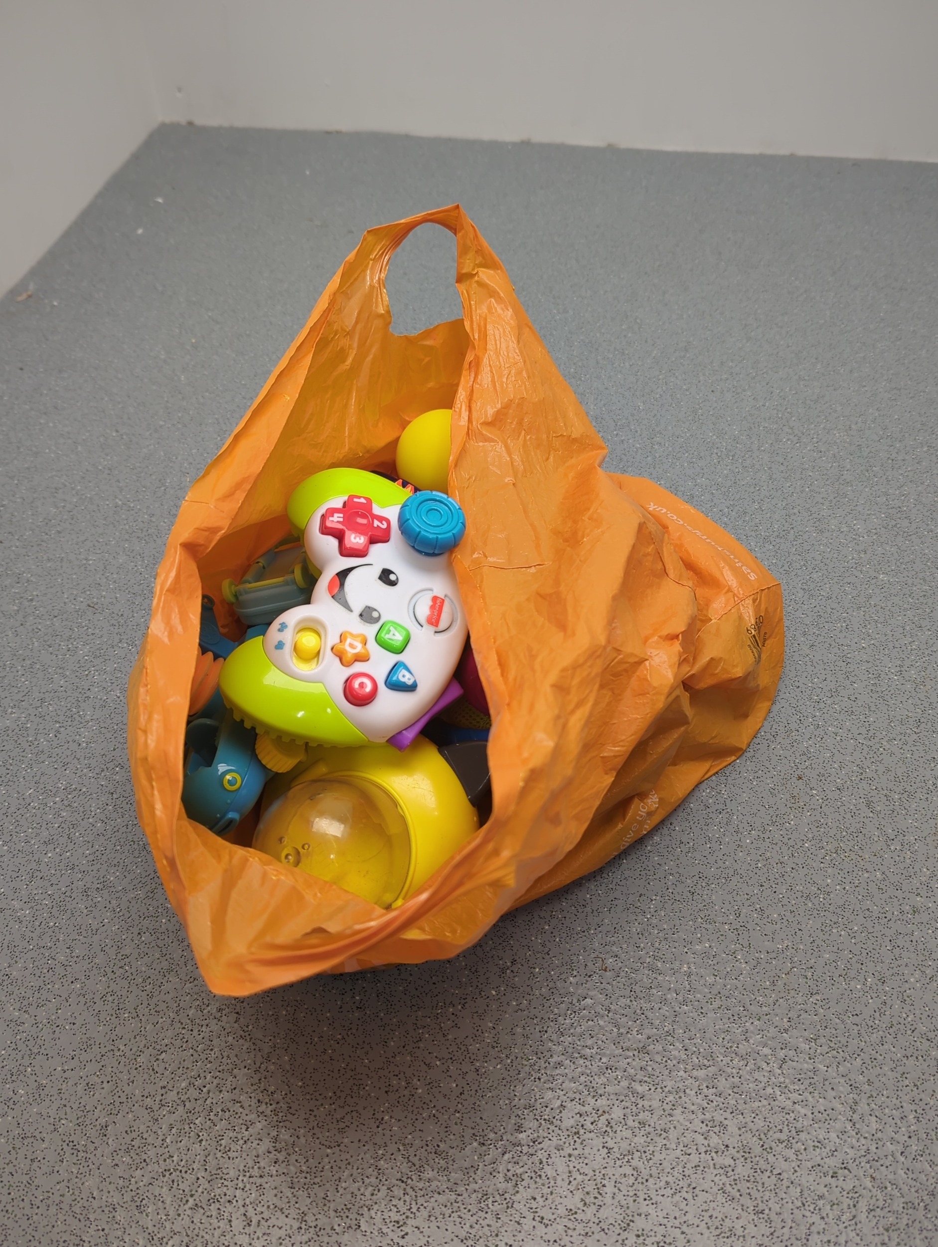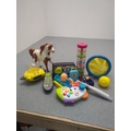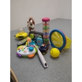 A varied selection of toys, including a colourful musical toy, a racket, and a toy horse. This lot also contains several small interactive toys that are visually appealing and designed for young children. They are packed in an orange carrier bag.