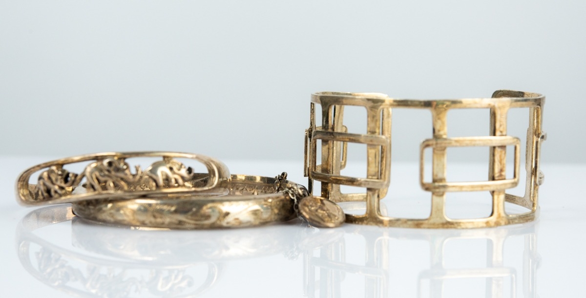 FOLIATE ENGRAVED SILVER HINGED BANGLE OF HOLLOW FORM and PENDANT WITH A ST CHRISTOPHER MEDALLION, inscribed to inner edge "Bon Voyage from Staff", Birmingham 1960; a 925 MARK CAST SILVER TORQUE BANGLE, the openwork front depicting a troupe of three elephants; and a GEOMETRIC PATTERN OPENWORK CUFF BRACELET of upright and horizontal oblongs (tests as high quality silver), 1.90 oz gross (3)