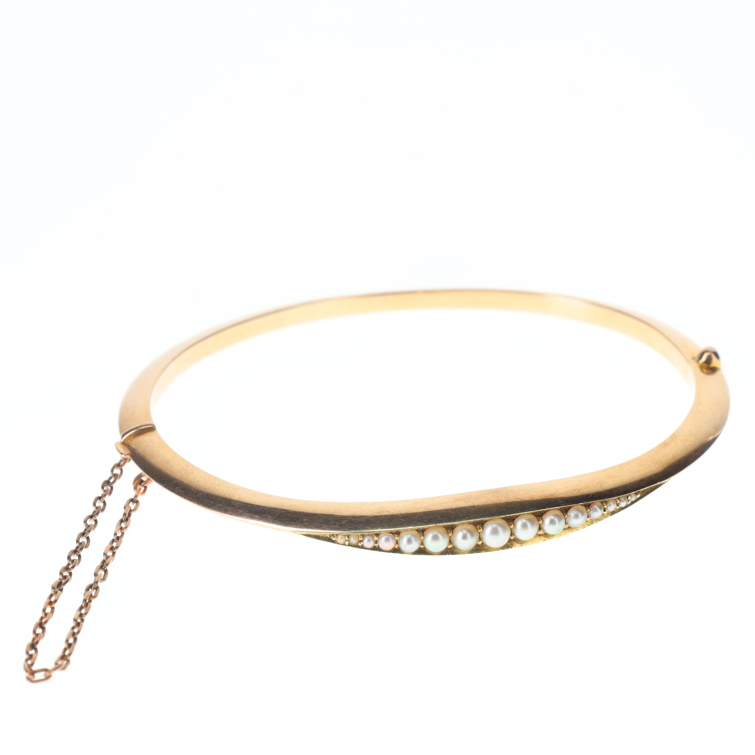 Victorian Graduated Pearl Set Gold Bangle. This piece has been tested as 15ct gold. The bracelet has an approximate internal width of 5.7cm, weighs in total 7.9g.
