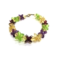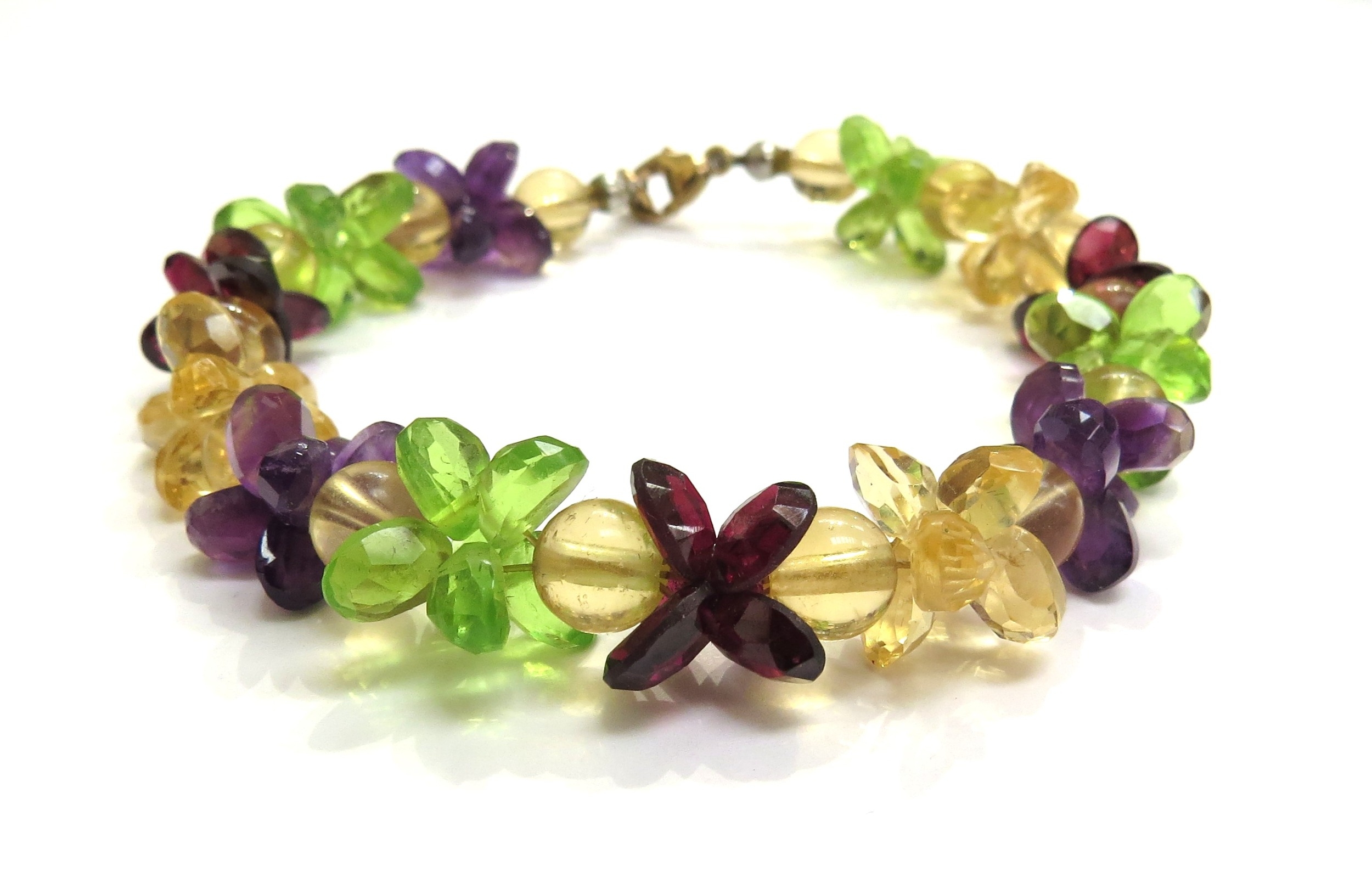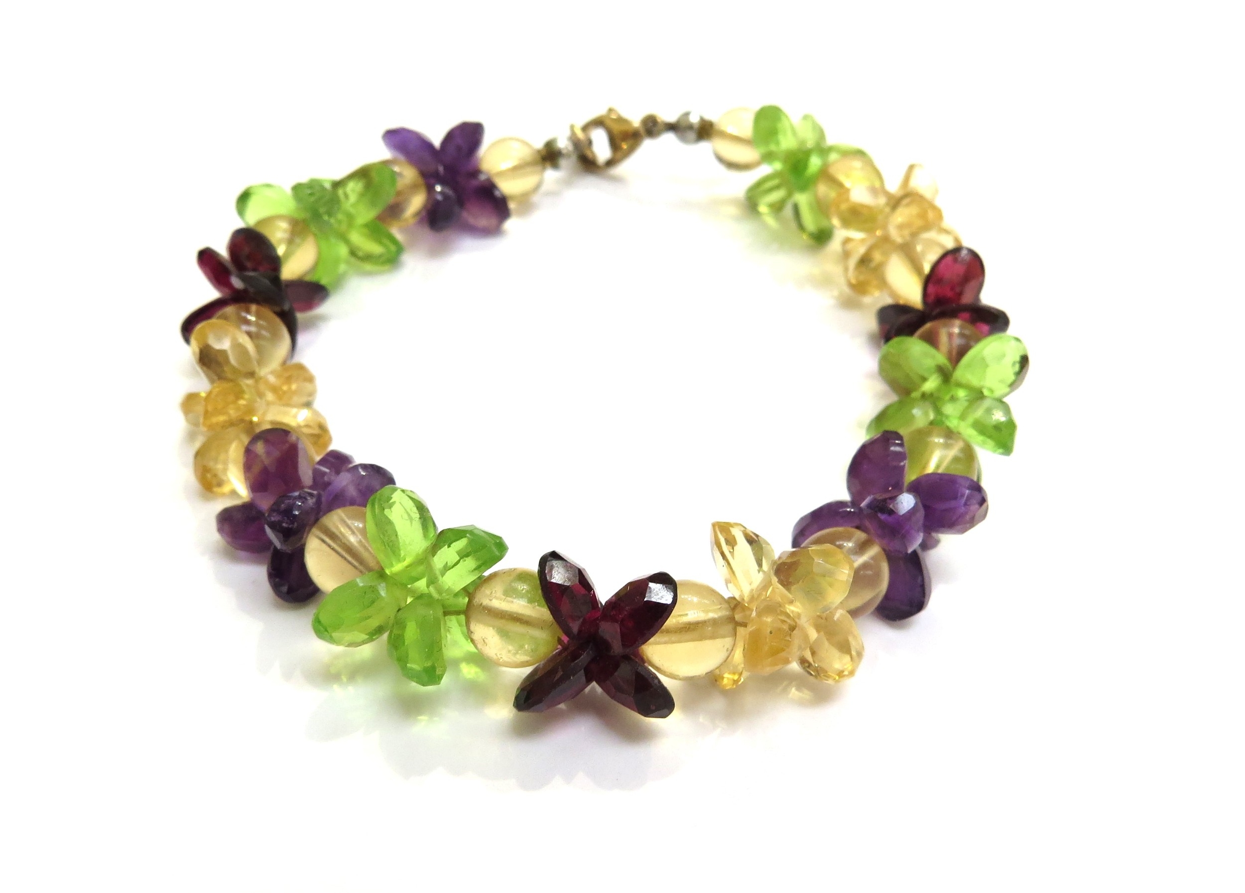 A peridot, amethyst and citrine facet cut bead bracelet with 375 gold clasp
