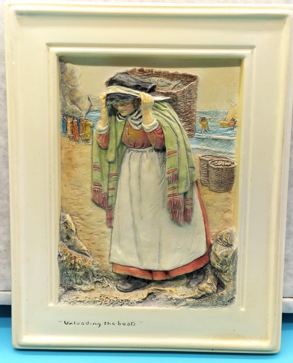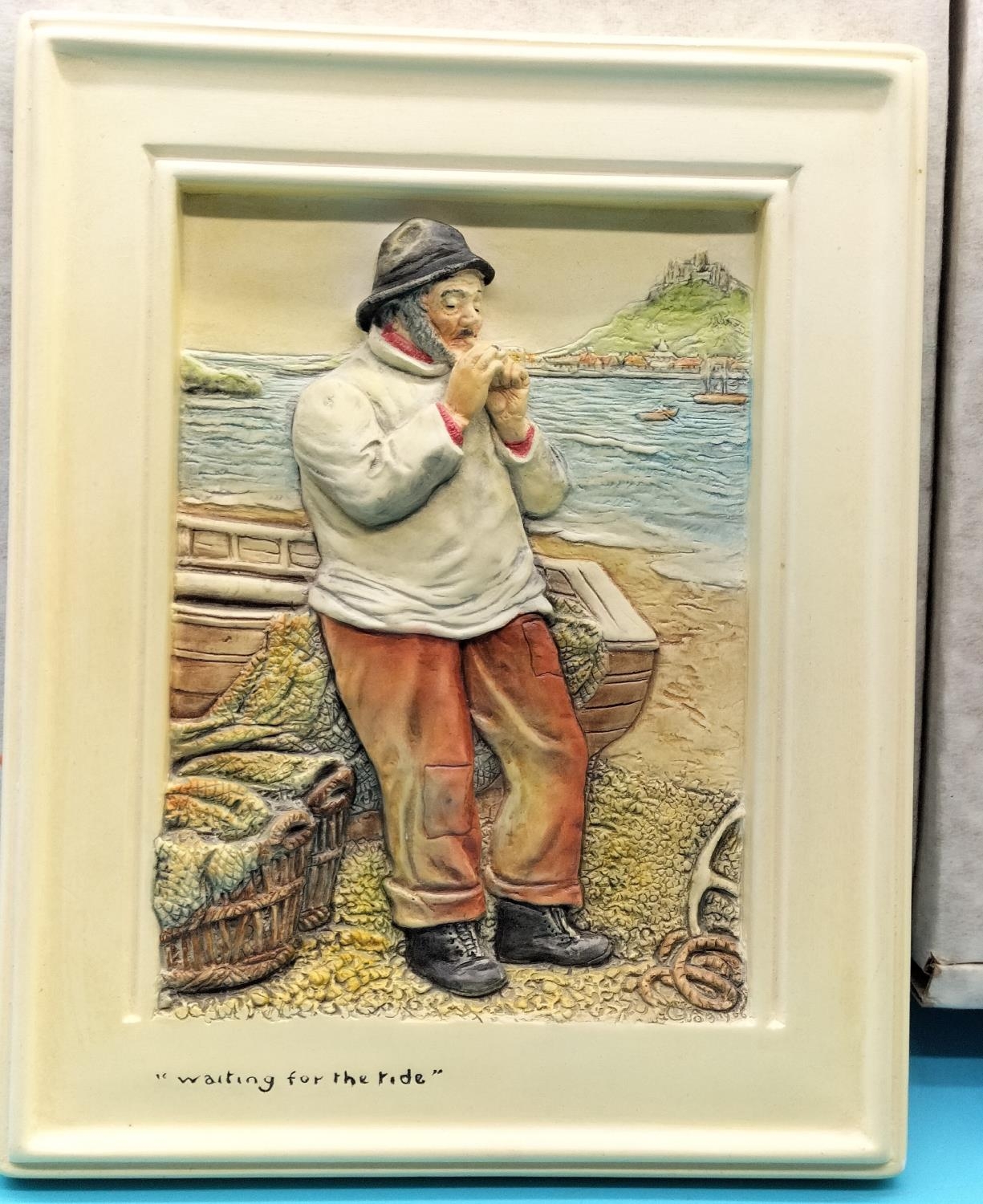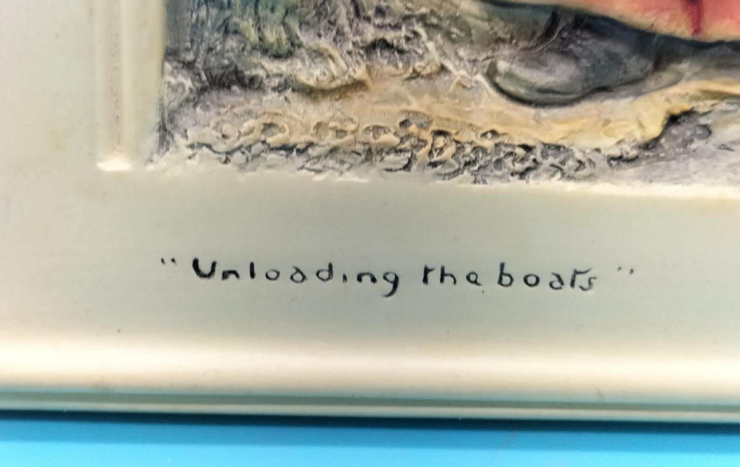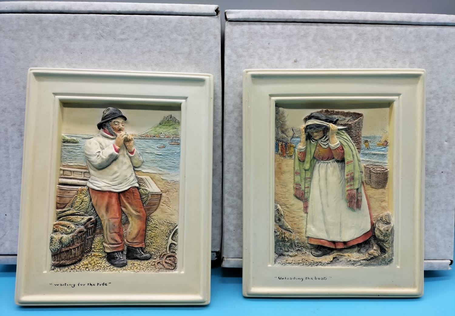 Boxed Bossons Plaques (2) 'Waiting for the Tide' and 'Unloading the Boats'. 20cm x 16cm.