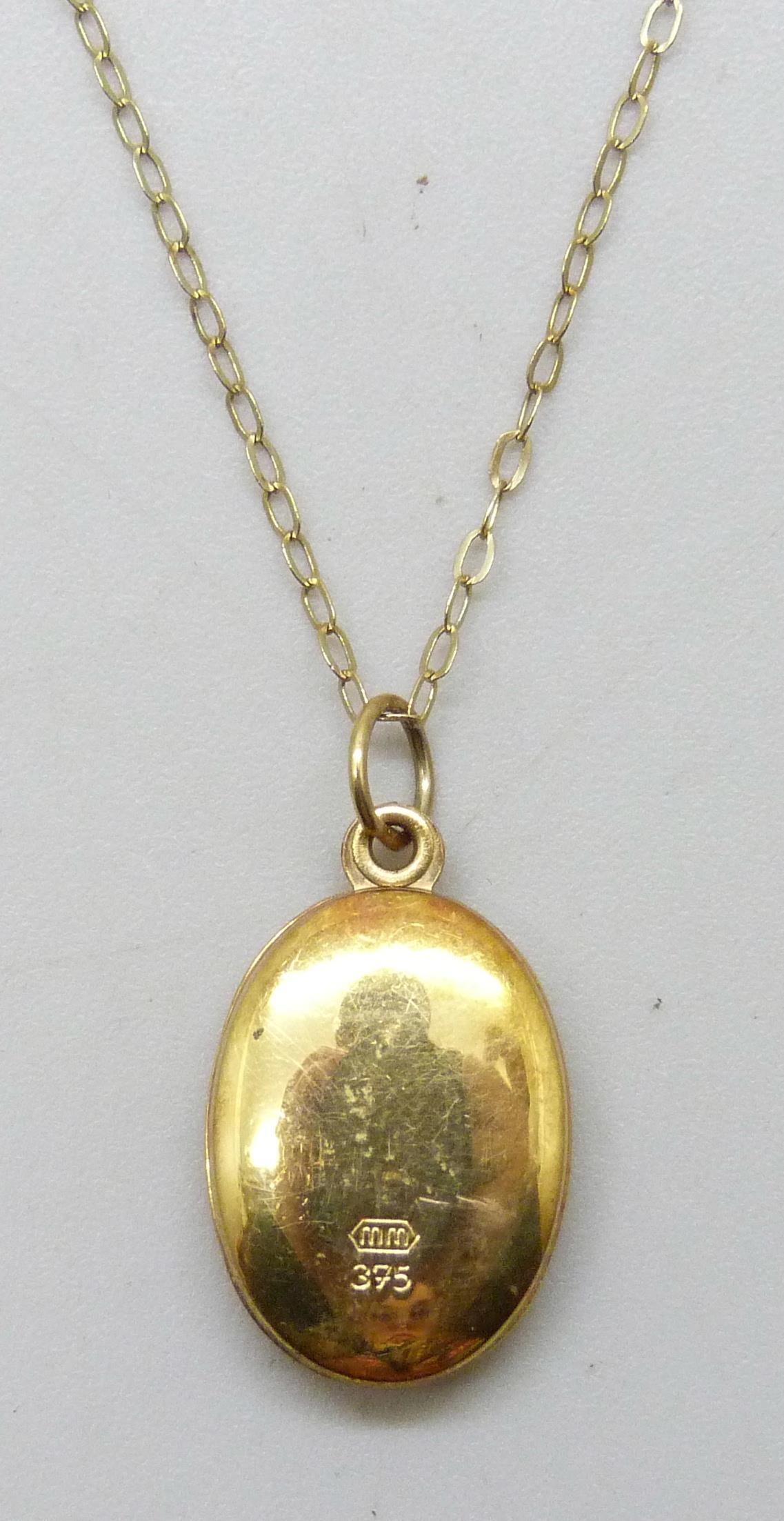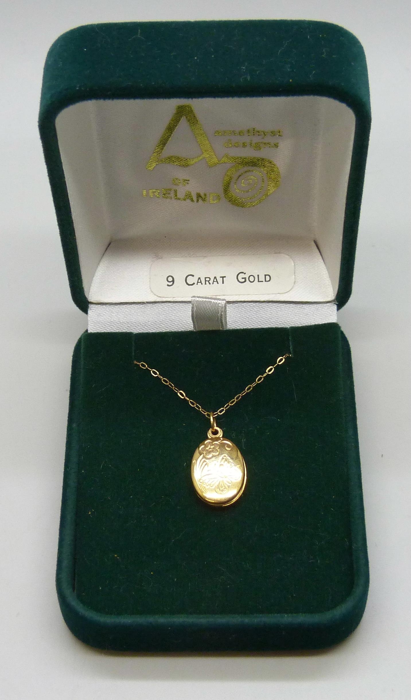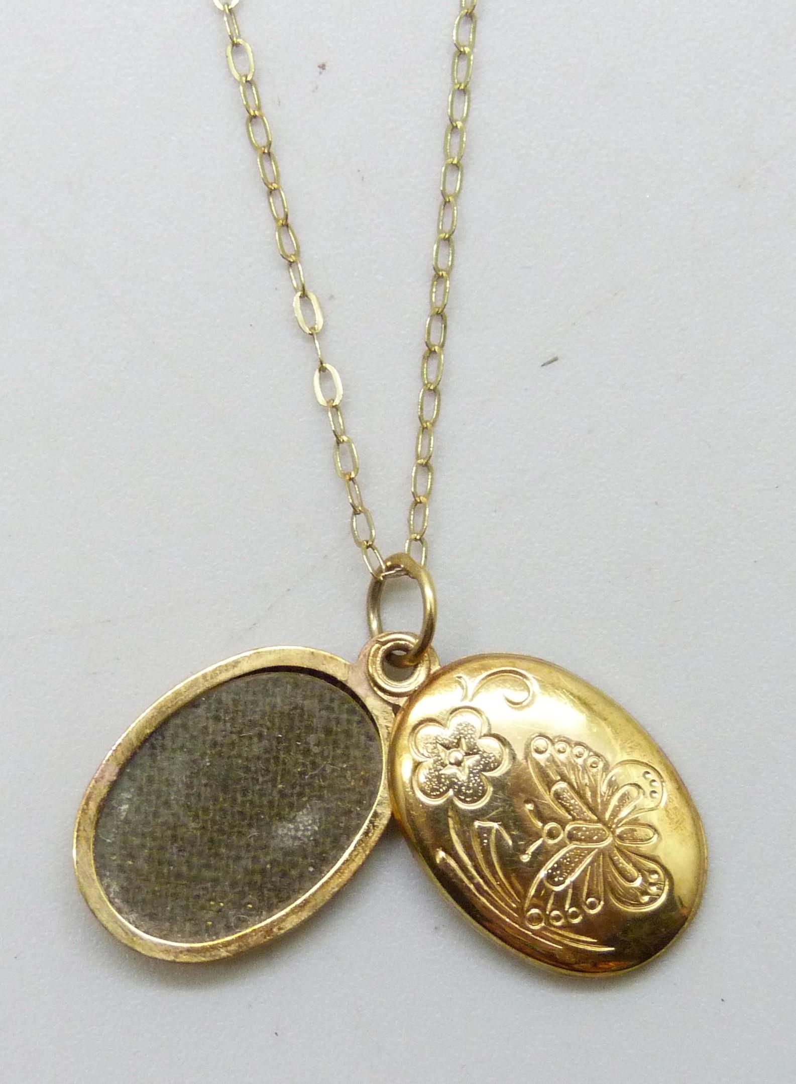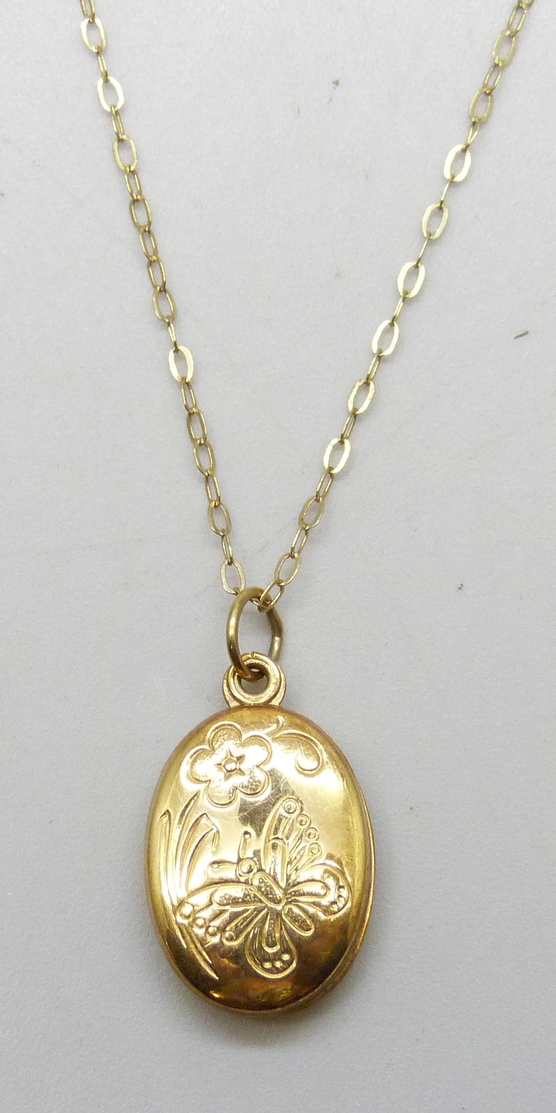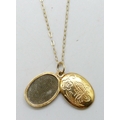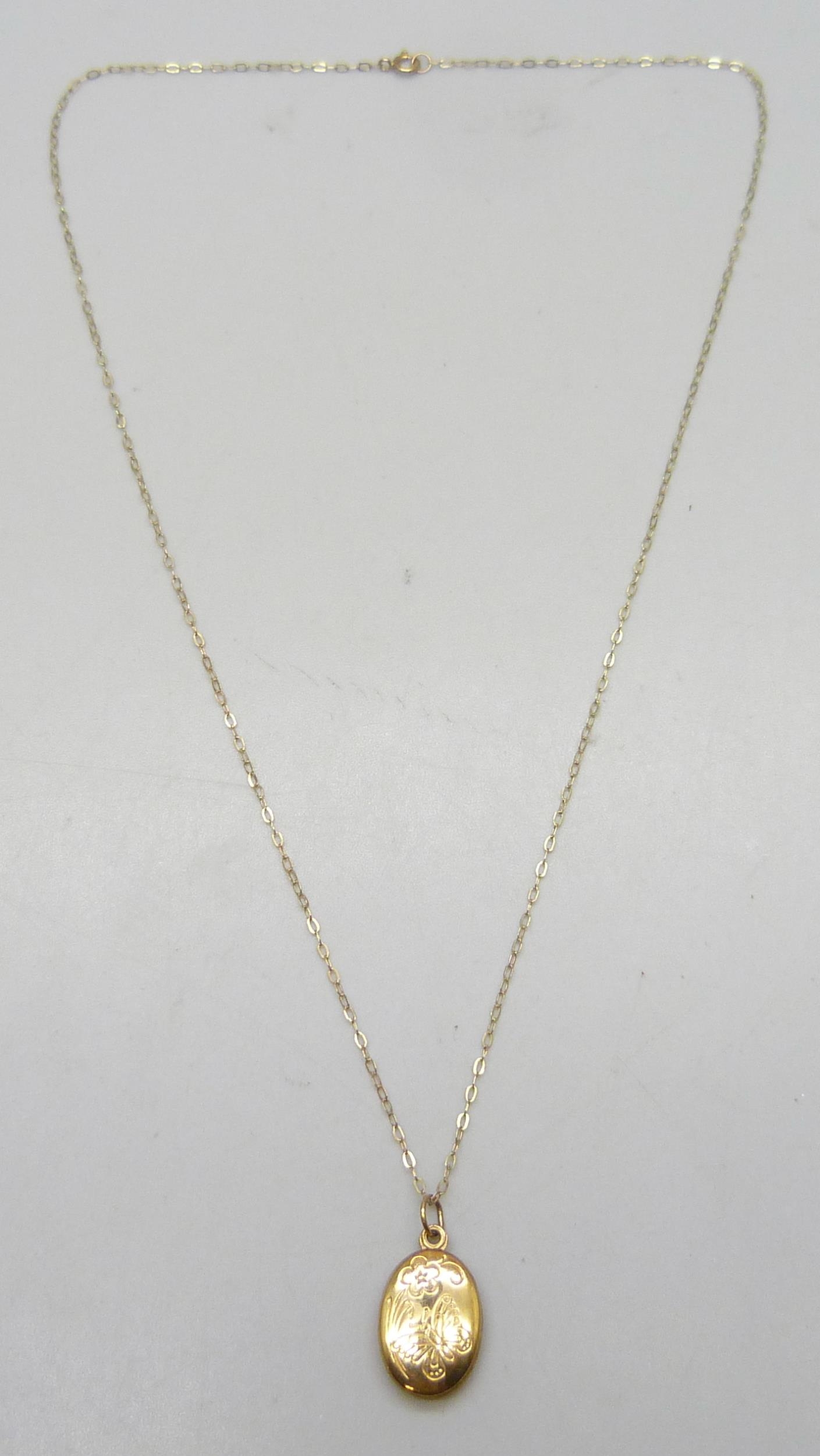 A 9ct gold locket, 2cm including bail, and a 9ct gold chain, 1.2g total