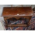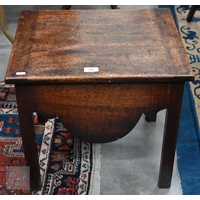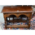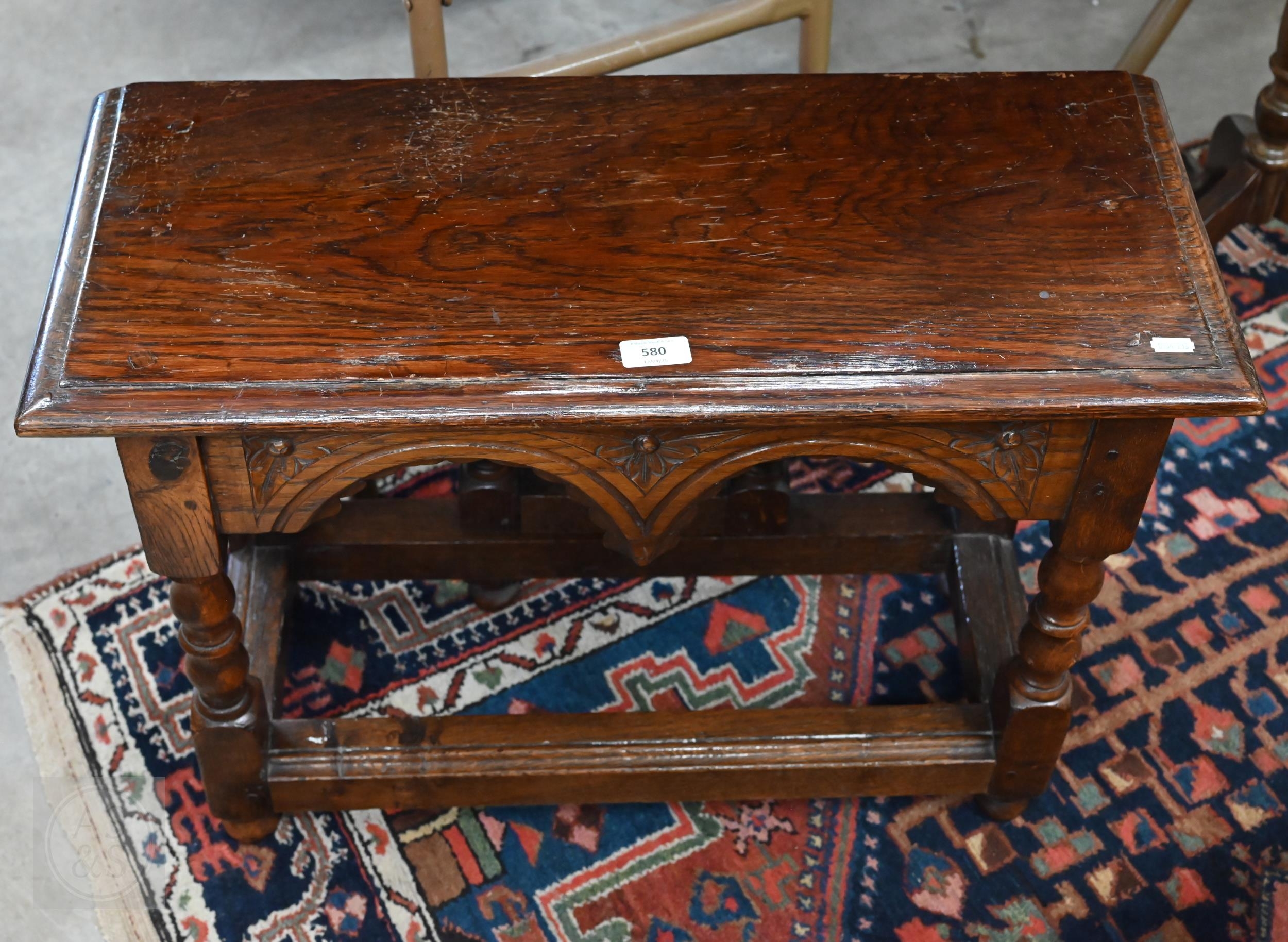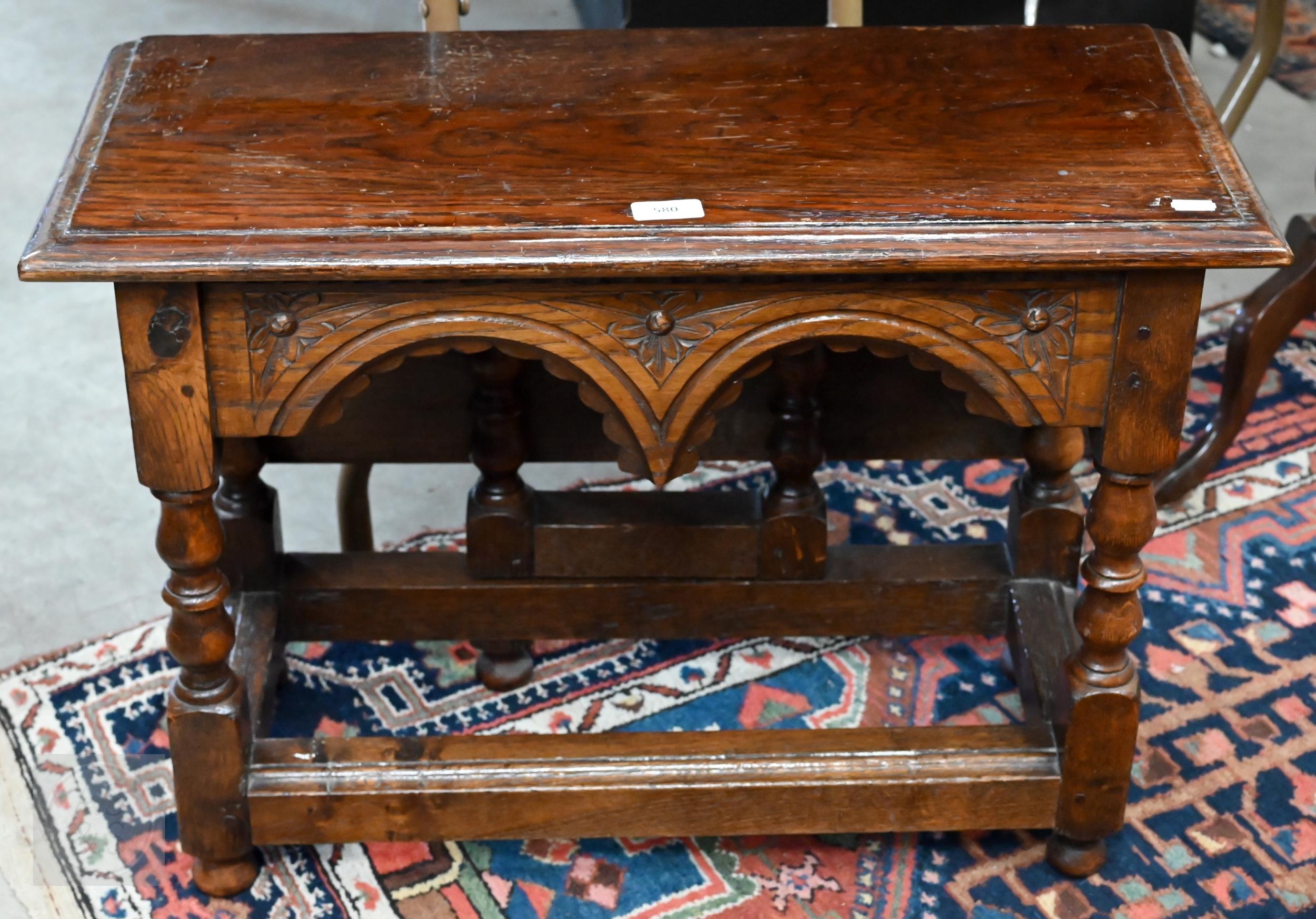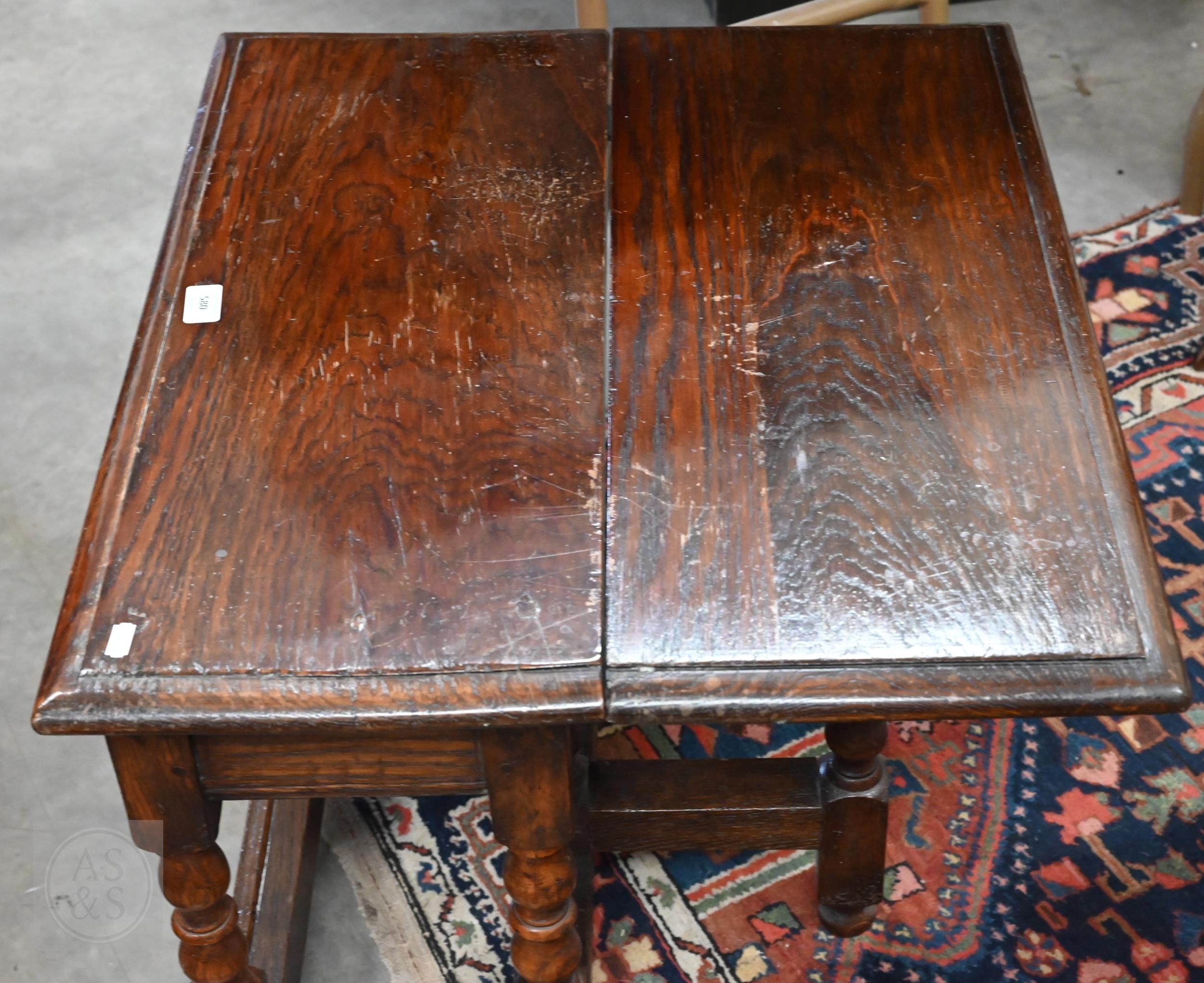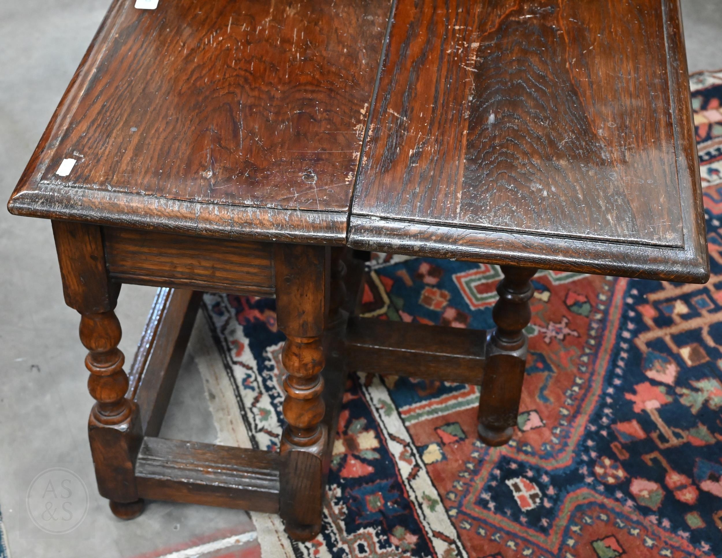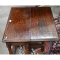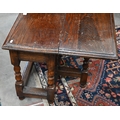A carved oak gateleg side table with single drop leaf, turned supports with stretchers, jointed construction, 70 x 58 x 48 cm high