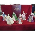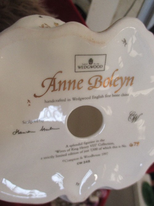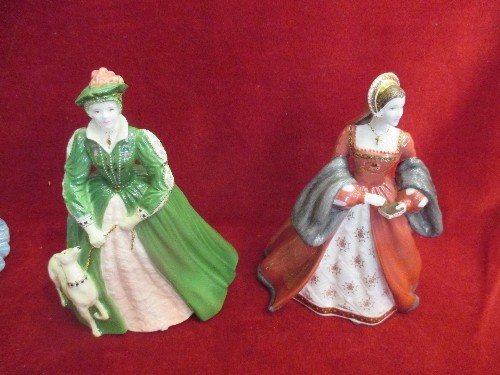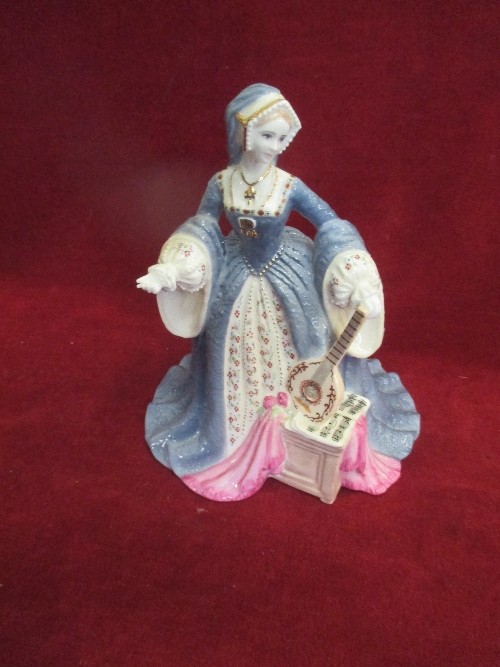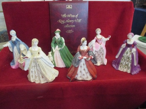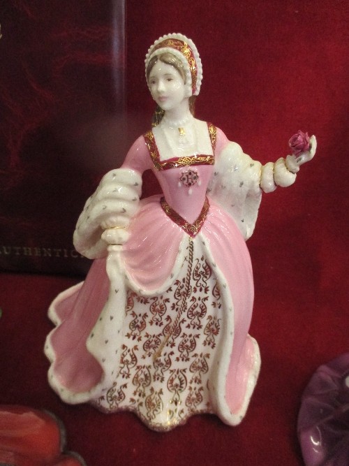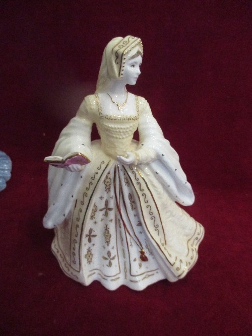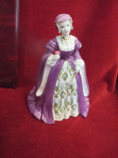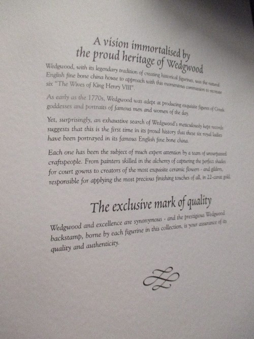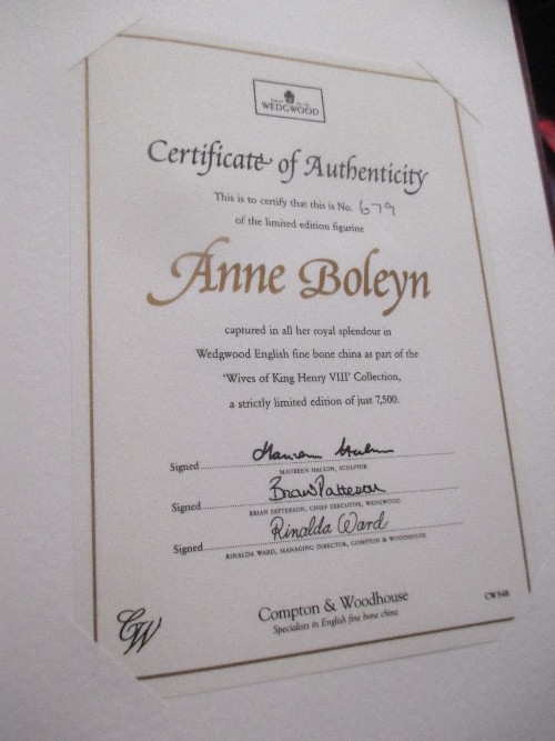 A BEAUTIFUL COLLECTION OF WEDGWOOD BONE CHINA FIGURINES, THE SIX WIVES OF HENRY VIII. LIMITED EDITION OF 7,500, COMPLETE WITH THE ORIGINAL BOUND FOLDER OF CERTIFICATES OF AUTHENTICITY. LOW NUMBERS (BELOW 1000)