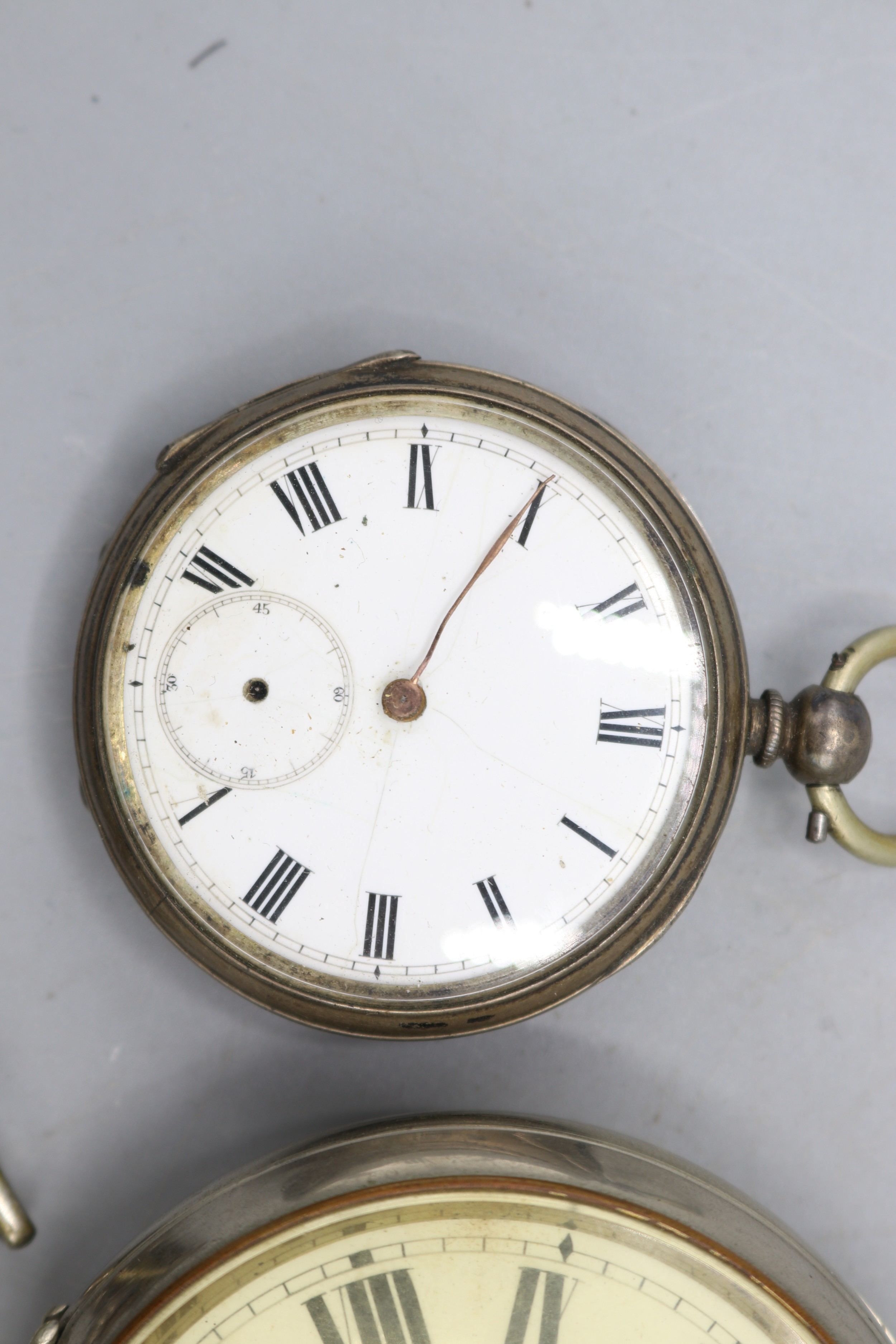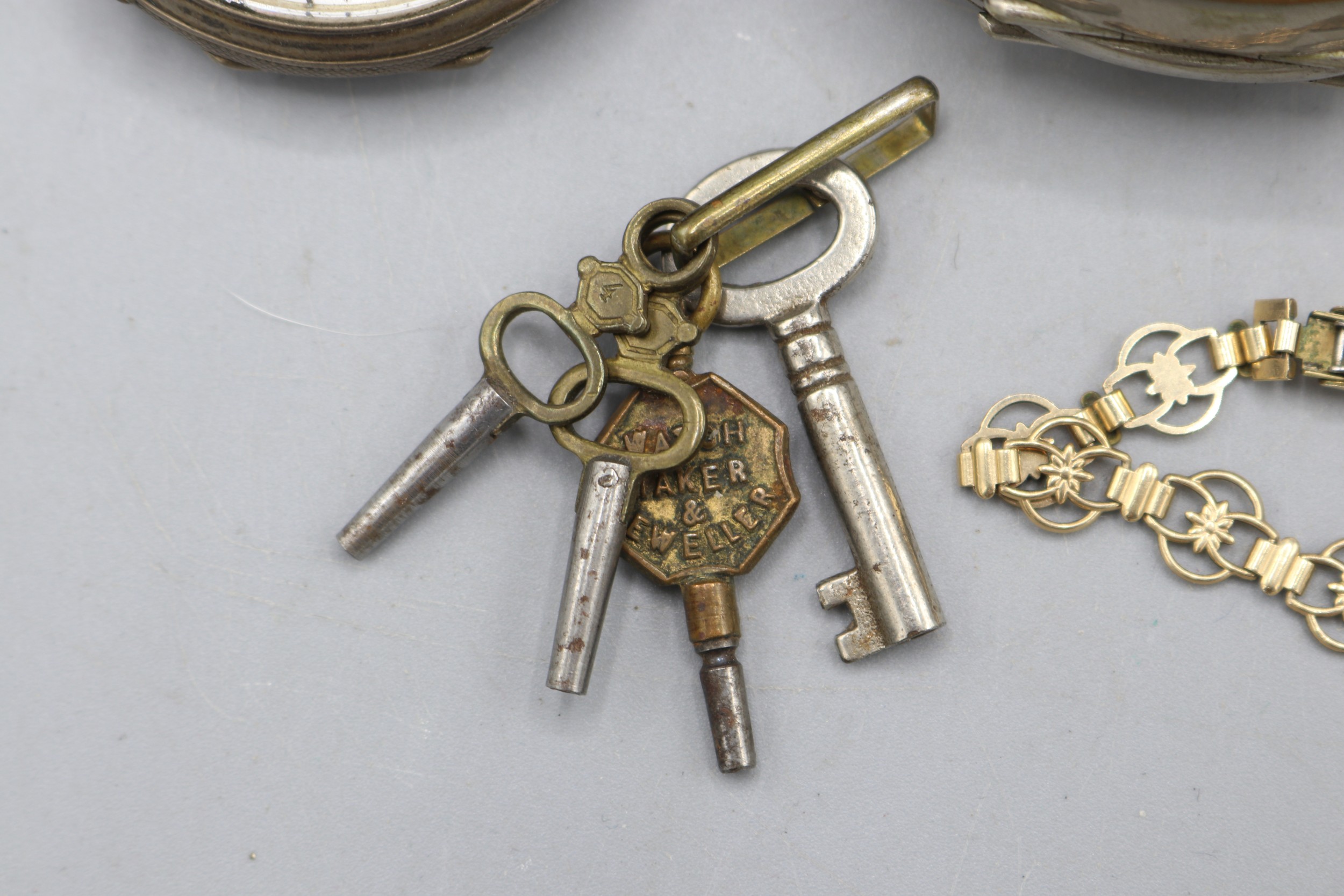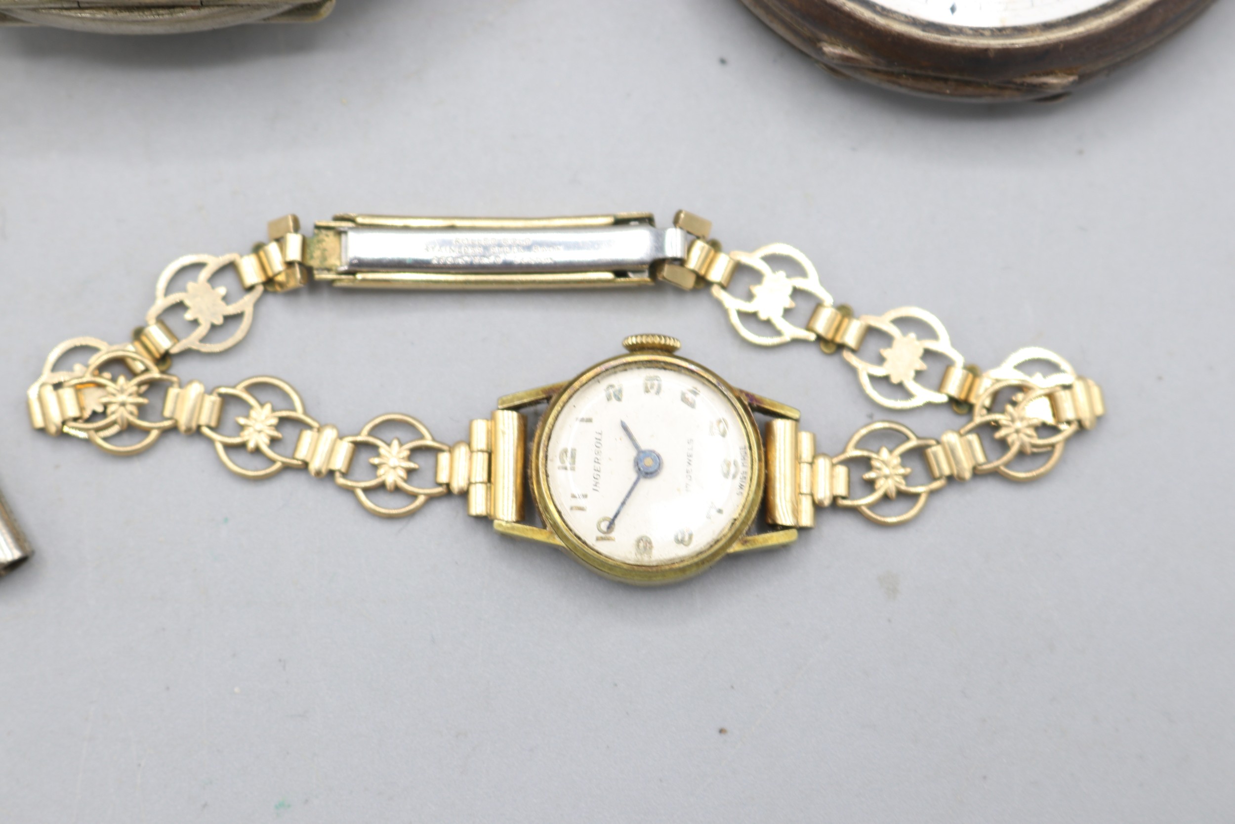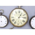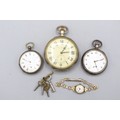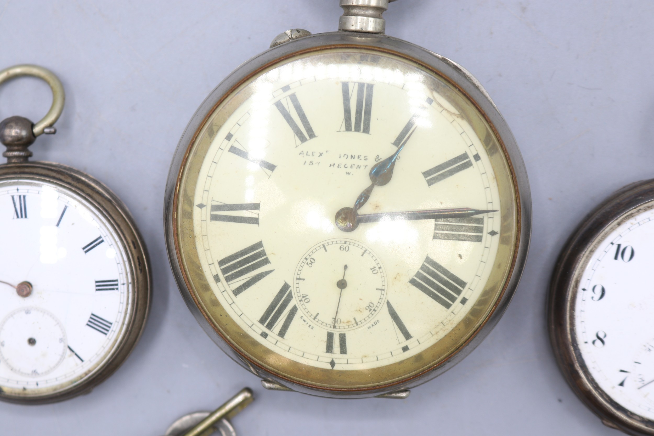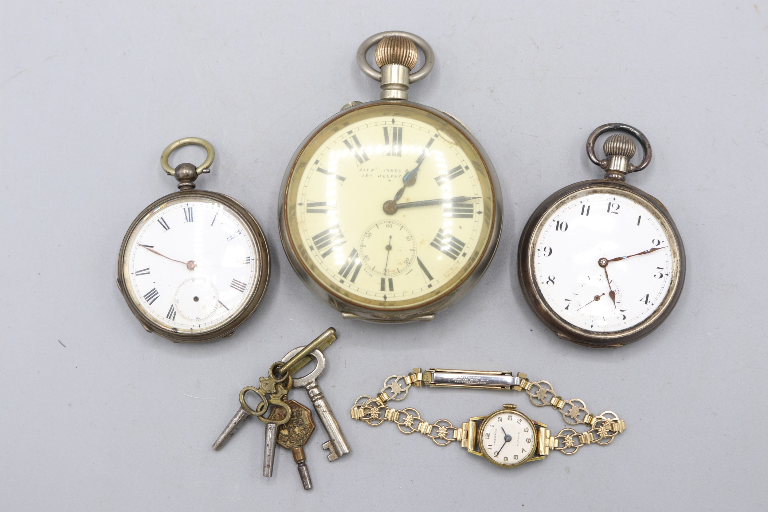 Hexameter silver keyless pocket watch, white enamel Arabic dial with subsidiary seconds, hinged case back no. 313460, A.L.D. Birmingham 1917, Hexameter Swiss Made bridge plate movement, gross weight 3.2ozt, D50.7mm; Swiss 'Fine Silver' key wound pocket watch, white enamel Roman dial with subsidiary seconds, hinged case back no. 18114 stamped Fine Silver, Swiss bridge plate movement with cylinder escapement, gross weight 2.1ozt, D46.8mm; Swiss retailed by Alex.r Jones & Co., 154 Regent St., W. nickel keyless pin set Goliath pocket watch, D67.5mm and Ingersoll ladies gold plated wristwatch, D17.6mm