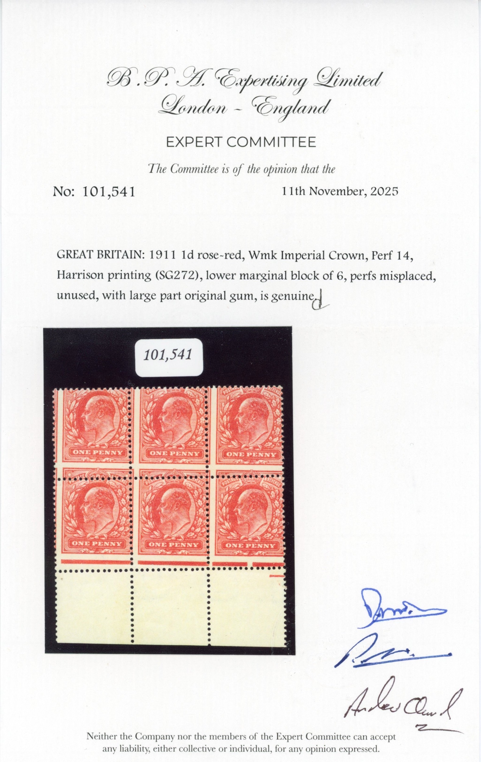 1911 Harrison perf 14 1d rose-red, mint lower marginal block of six showing remarkable misperf, first and third stamps mounted and the rest fresh unmounted og. Most attractive. BPA Certificate (2025). SG 272 var