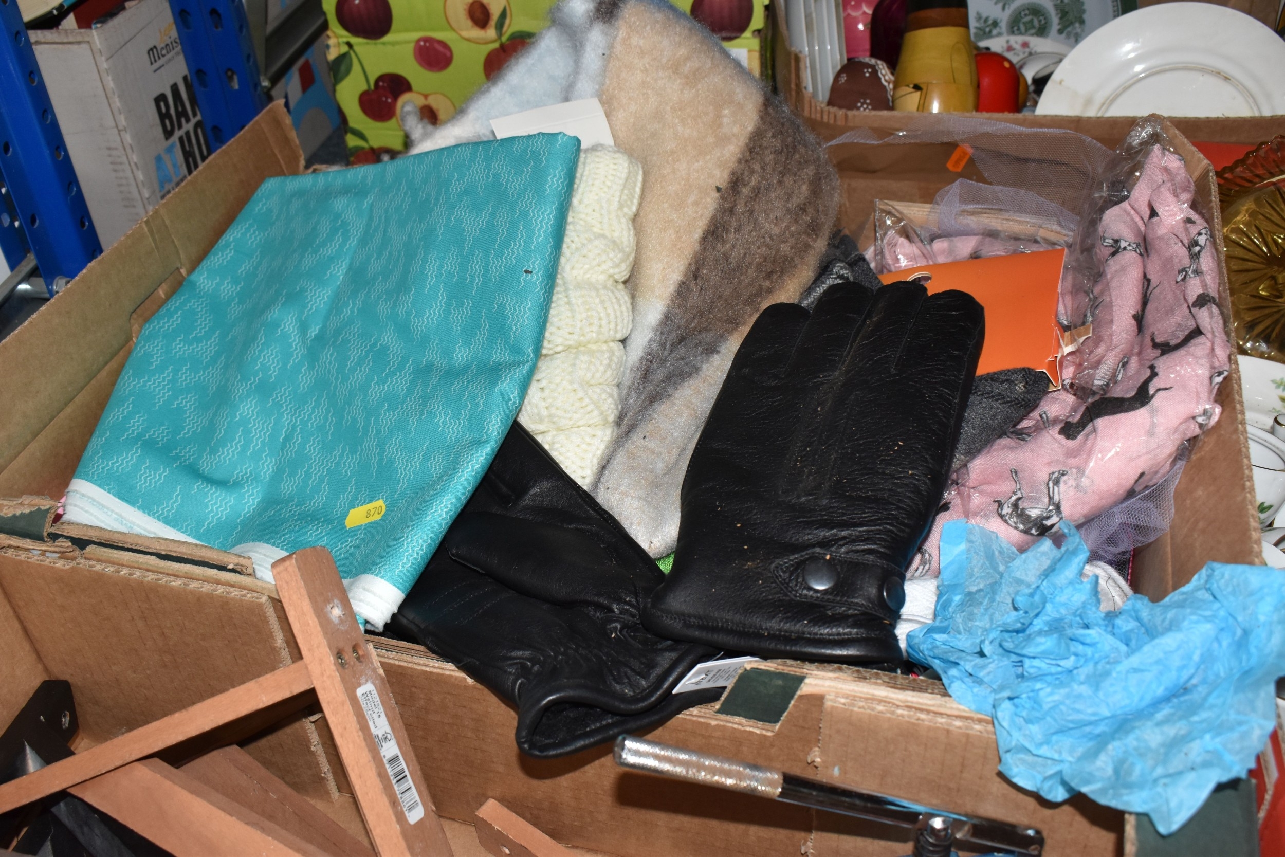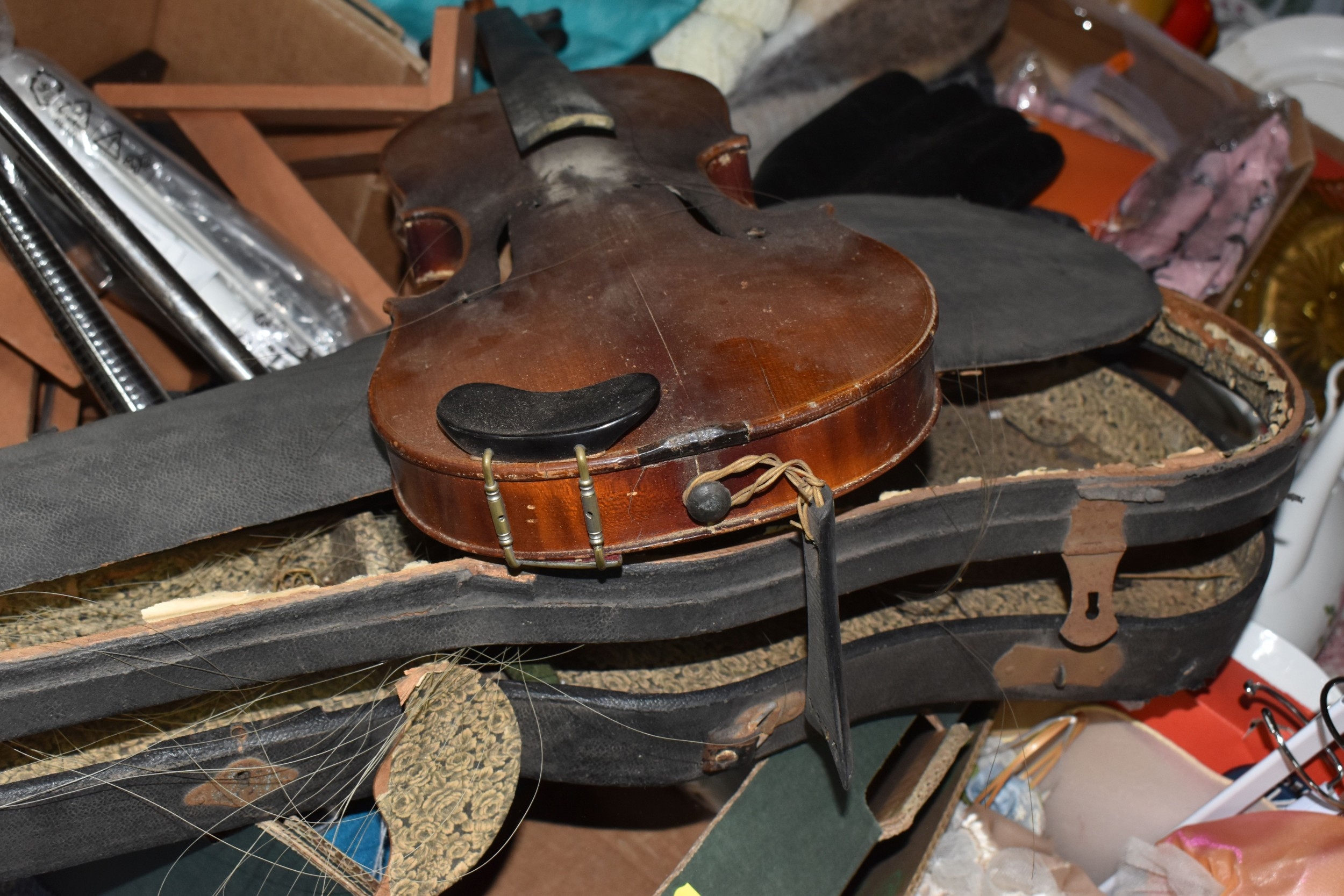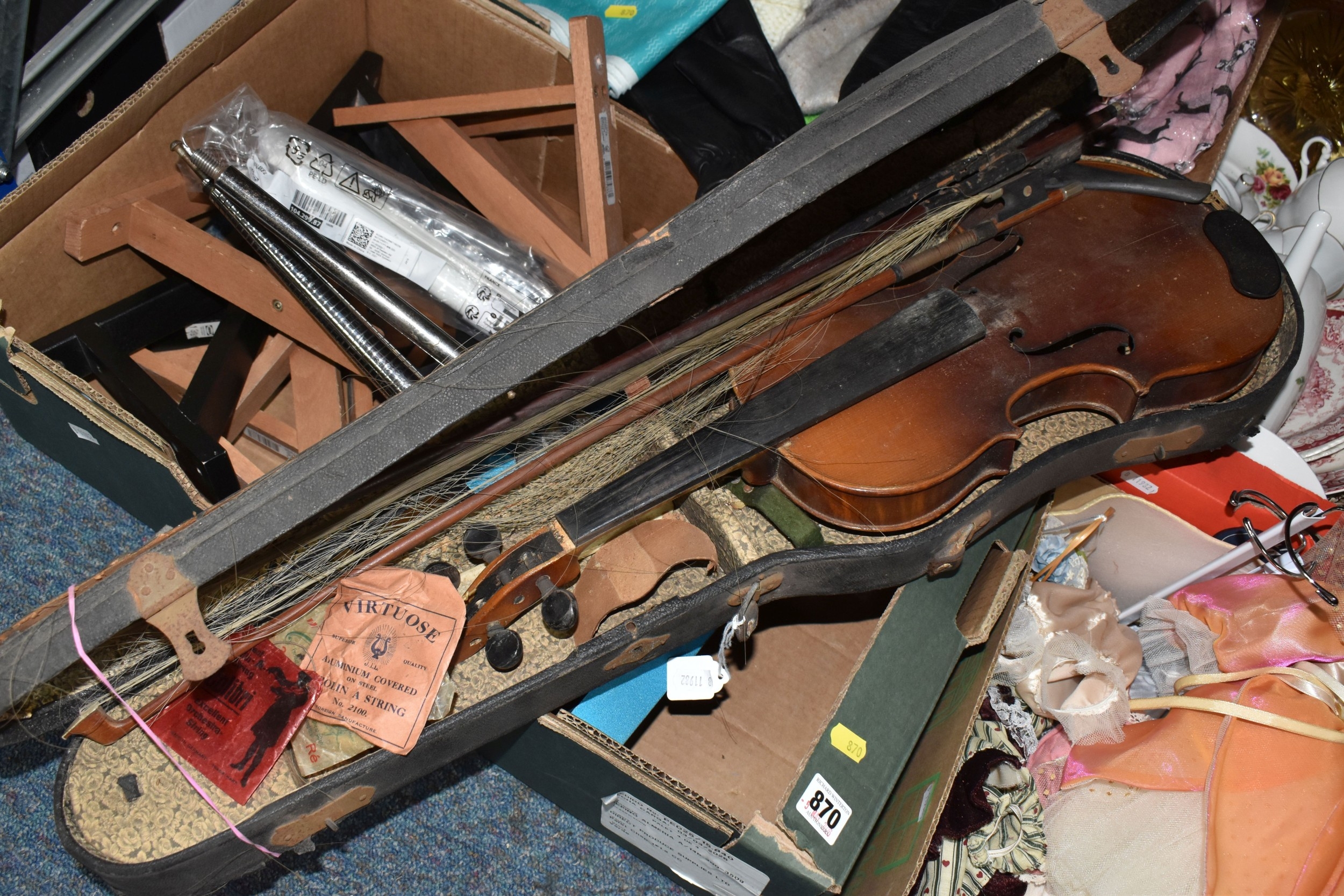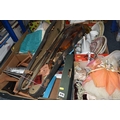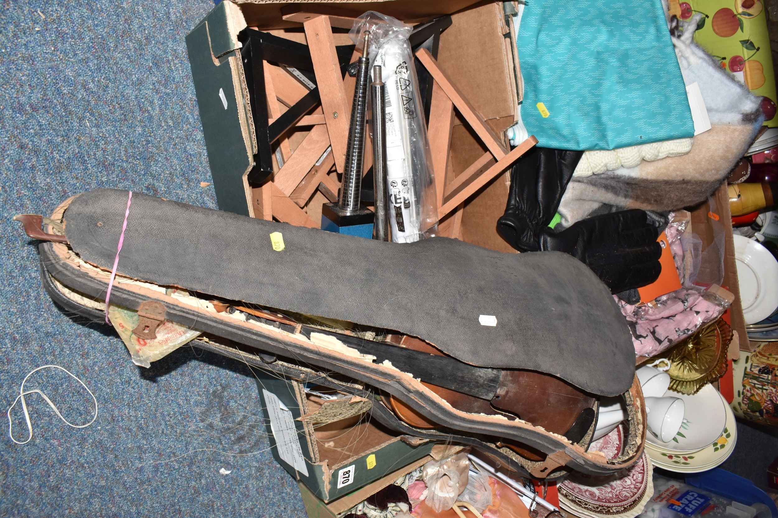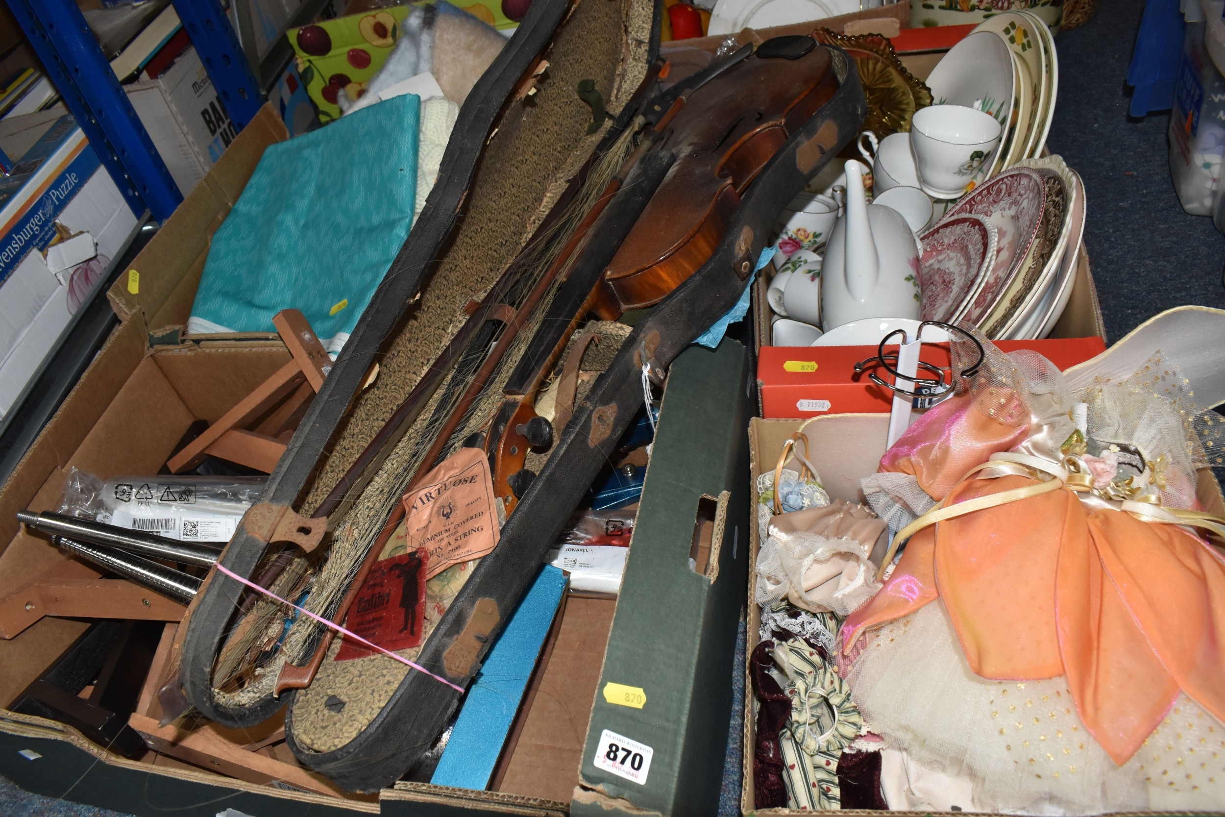 FOUR BOXES OF HOUSEHOLD ITEMS to include a cased violin a/f, wool balls, ribbon, scarves, fabric, selection of various pieces of dinner ware including Meakins & Hudds, dolls clothes and a box of wooden brackets, (4 boxes) (s.d.).