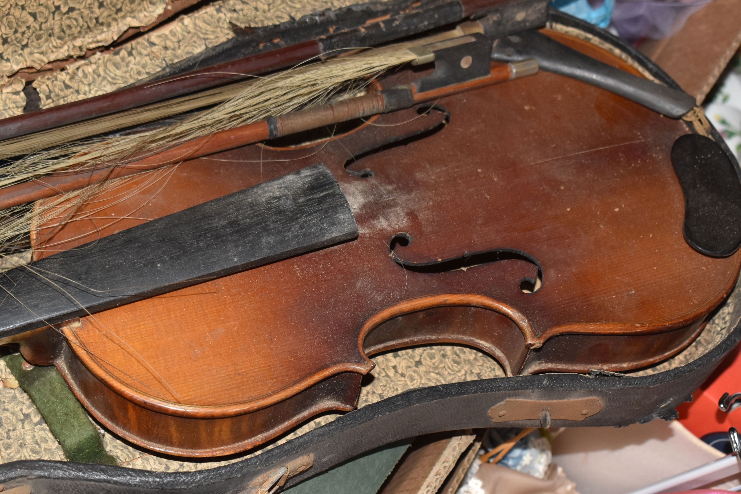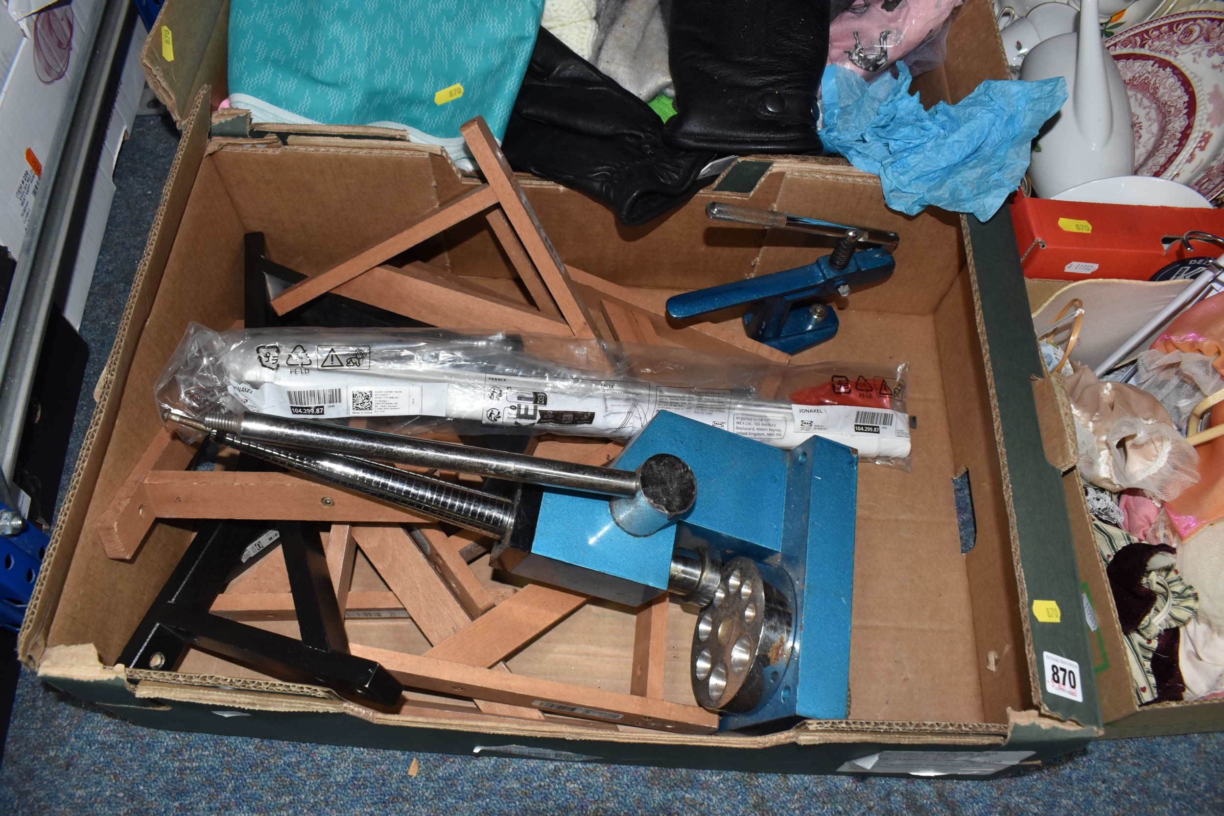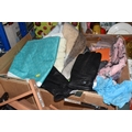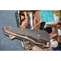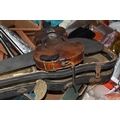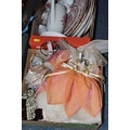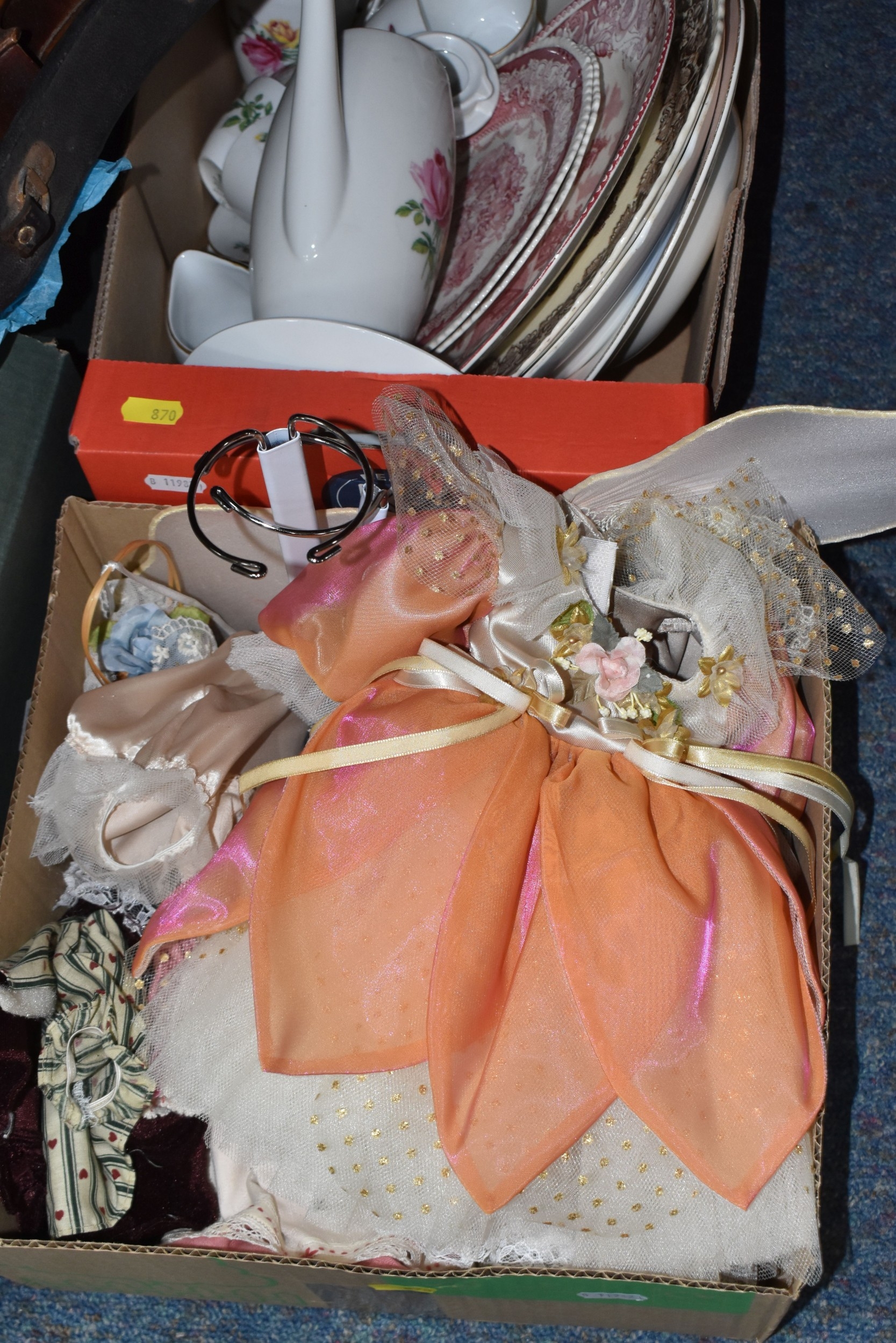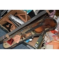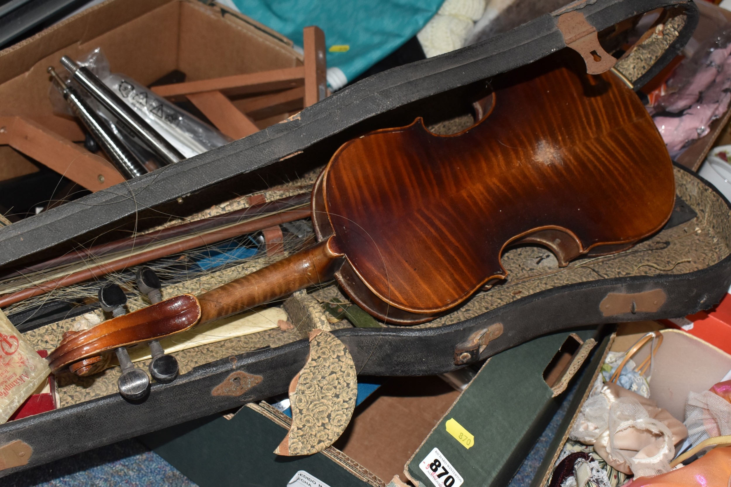 FOUR BOXES OF HOUSEHOLD ITEMS to include a cased violin a/f, wool balls, ribbon, scarves, fabric, selection of various pieces of dinner ware including Meakins & Hudds, dolls clothes and a box of wooden brackets, (4 boxes) (s.d.).