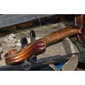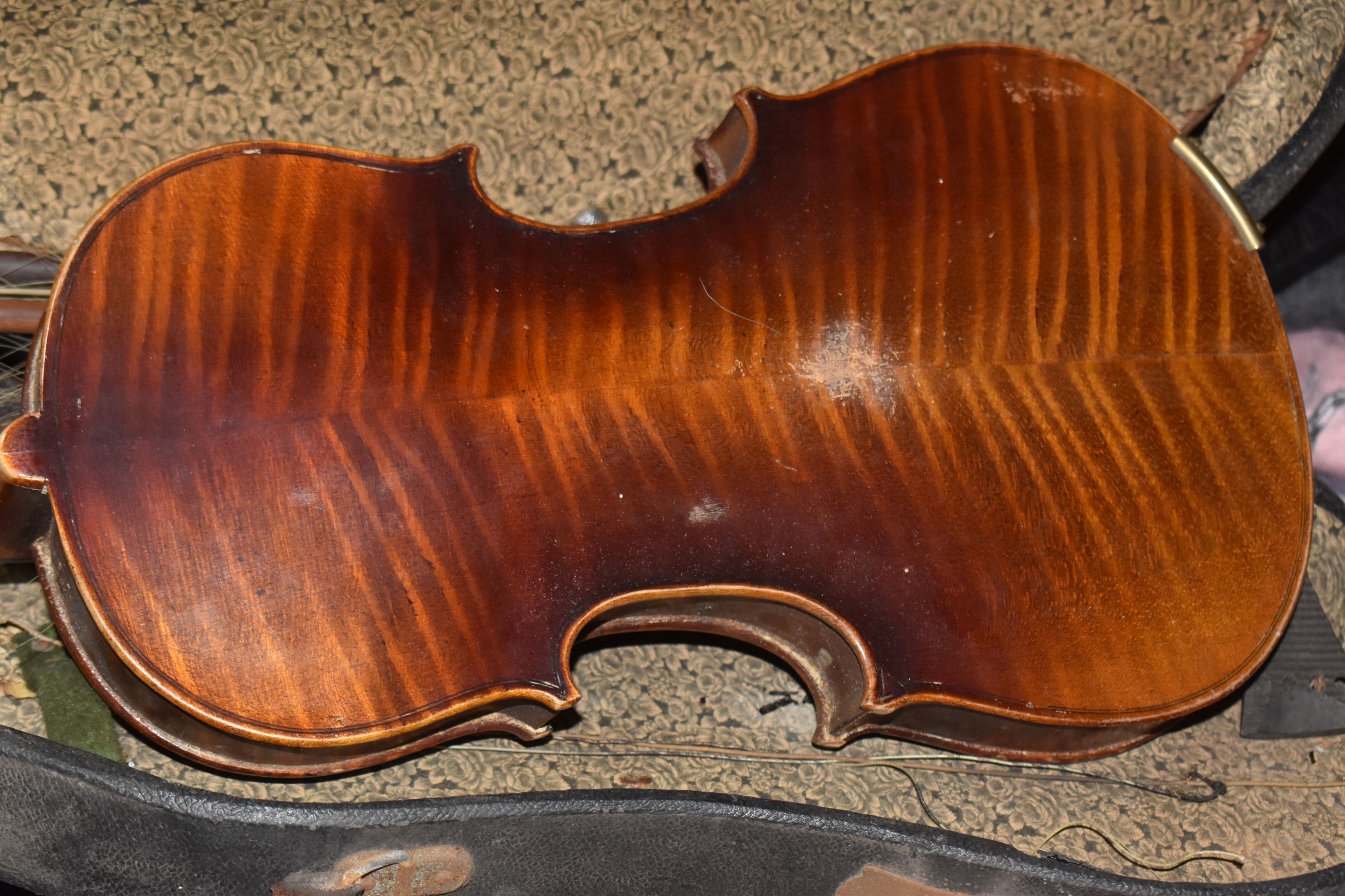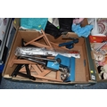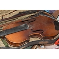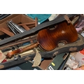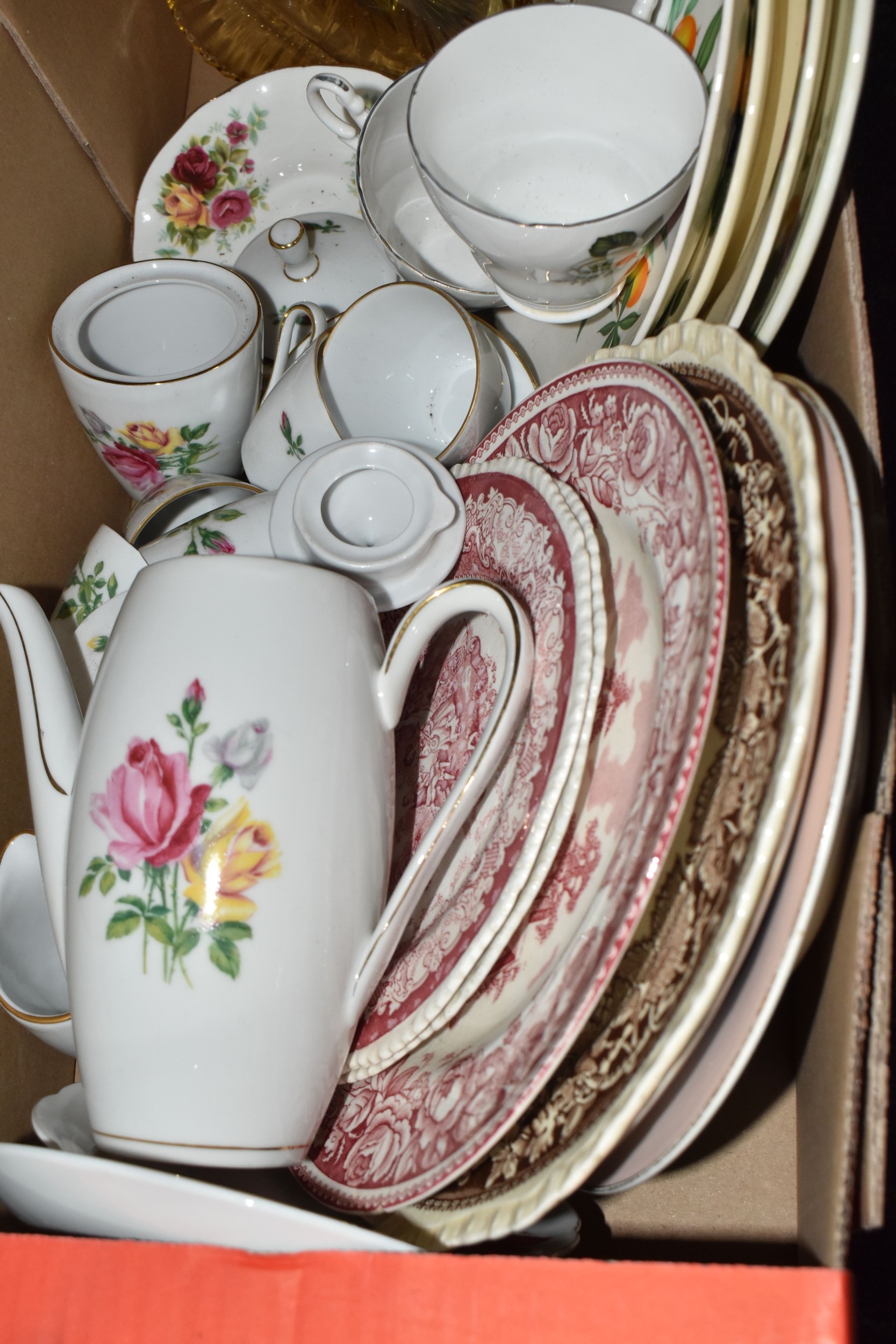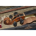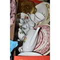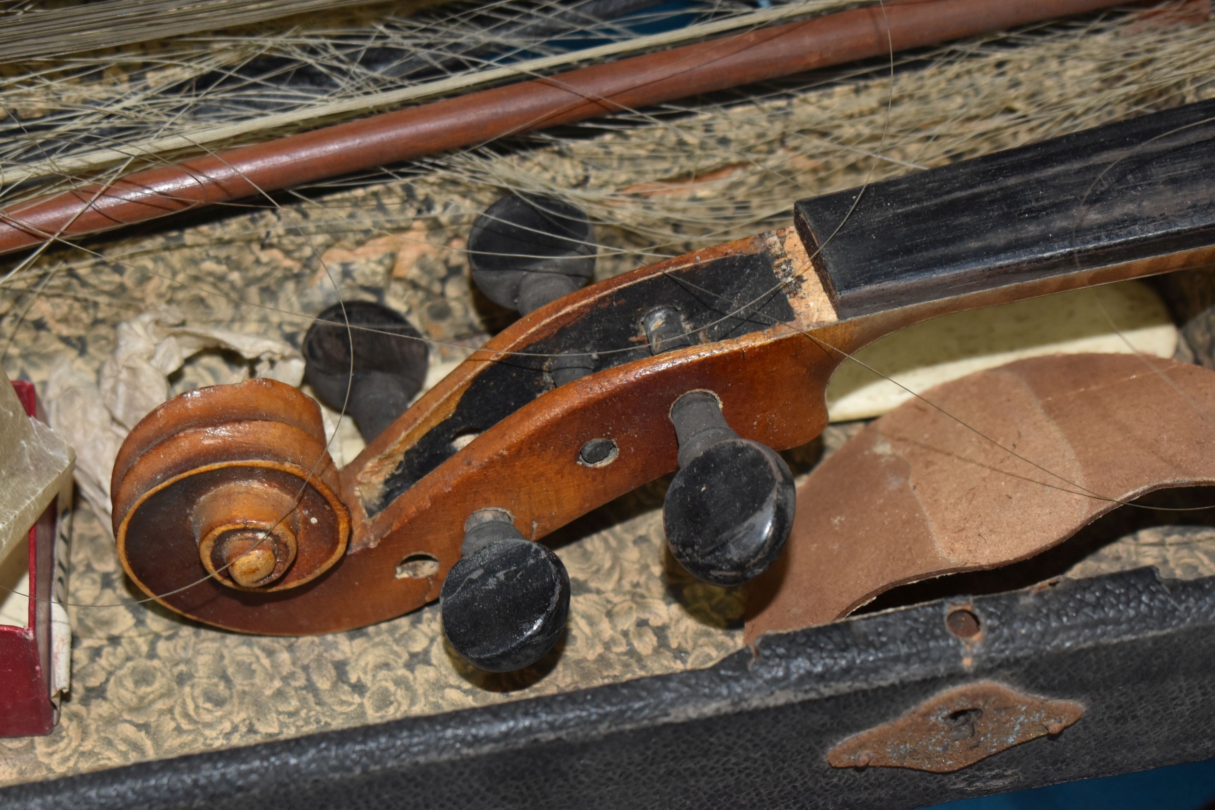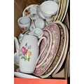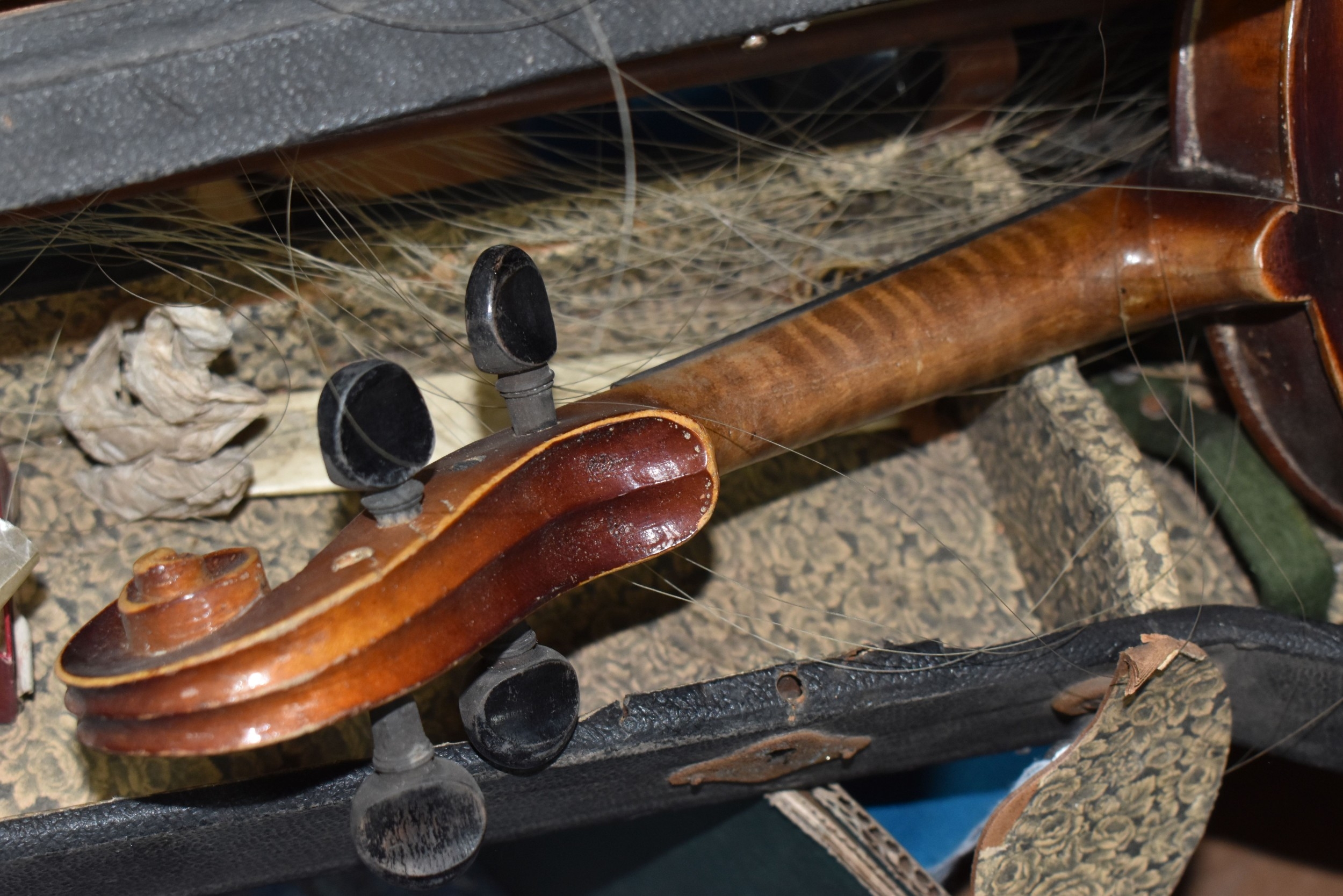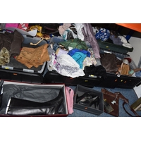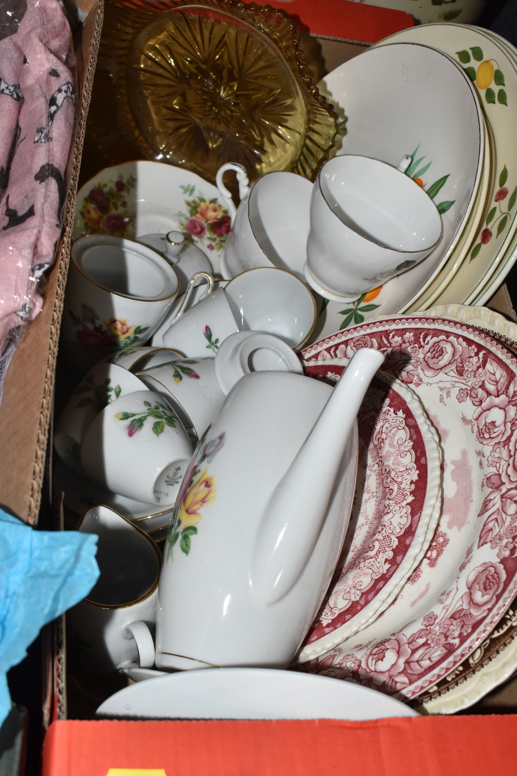 FOUR BOXES OF HOUSEHOLD ITEMS to include a cased violin a/f, wool balls, ribbon, scarves, fabric, selection of various pieces of dinner ware including Meakins & Hudds, dolls clothes and a box of wooden brackets, (4 boxes) (s.d.).