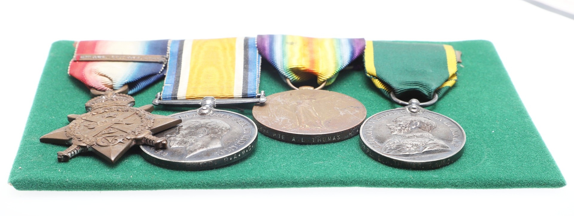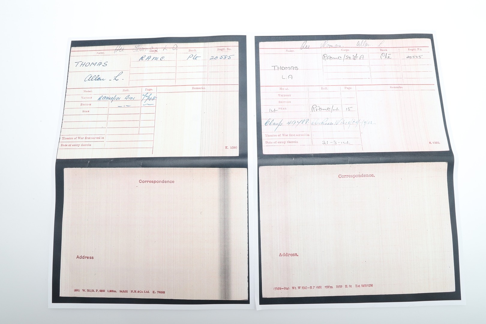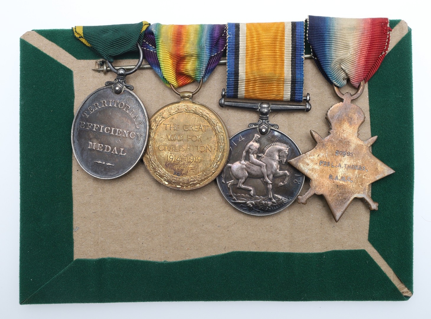 A FIRST WORLD WAR GROUP OF FOUR TO THE ROYAL ARMY MEDICAL CORPS. A Great War group of four comprising 1914 Star with clasp named to 20585Pte L.A. Thomas R.A.M.C. War Medal and Victory Medal named 20585 Pte A.L. Thomas R.A.M.C. Territorial Efficiency Medal 1323 Pte L.A. Thomas R.A.M.C. Mounted as worn. Allen Leslie Thomas was born in 1894 served with the 20th Field Ambulance, serving in France from the 21th August 1914. He served with No.32 General Hospital at Le Harve for the entirety of the War. With copied research. Provenance: Spink London.