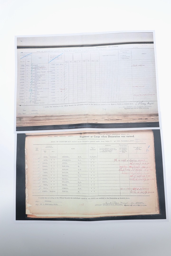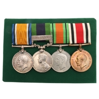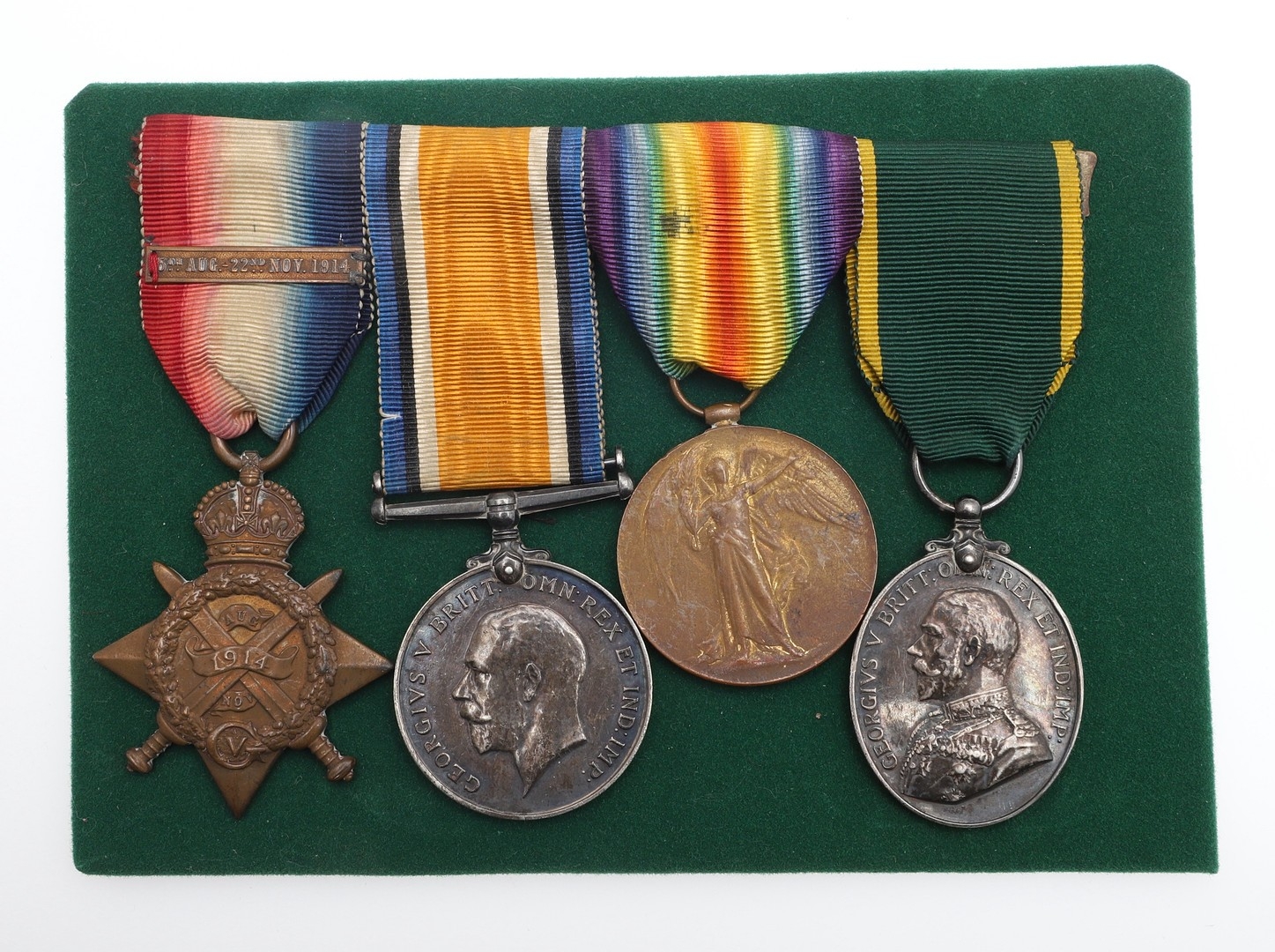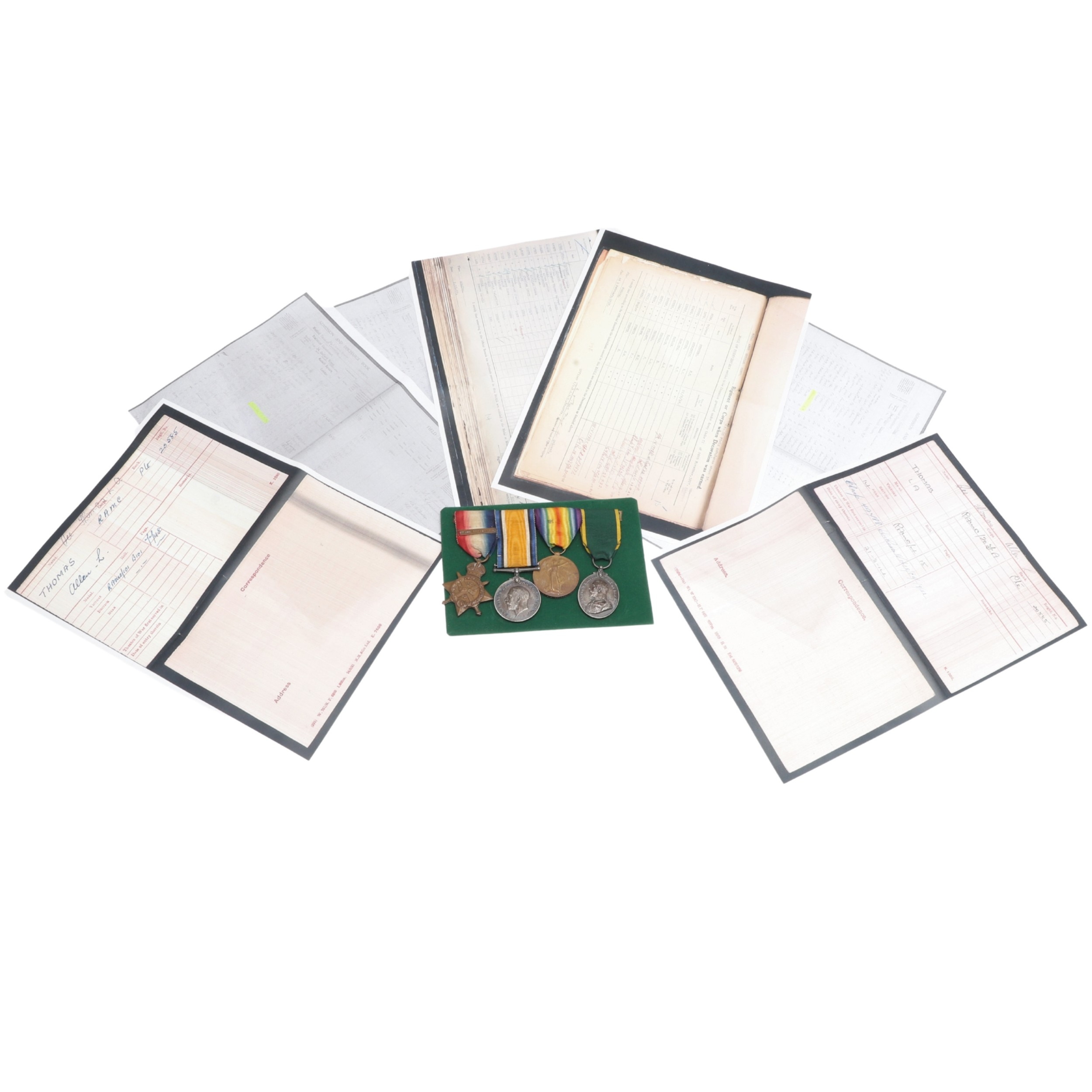 A FIRST WORLD WAR GROUP OF FOUR TO THE ROYAL ARMY MEDICAL CORPS. A Great War group of four comprising 1914 Star with clasp named to 20585Pte L.A. Thomas R.A.M.C. War Medal and Victory Medal named 20585 Pte A.L. Thomas R.A.M.C. Territorial Efficiency Medal 1323 Pte L.A. Thomas R.A.M.C. Mounted as worn. Allen Leslie Thomas was born in 1894 served with the 20th Field Ambulance, serving in France from the 21th August 1914. He served with No.32 General Hospital at Le Harve for the entirety of the War. With copied research. Provenance: Spink London.