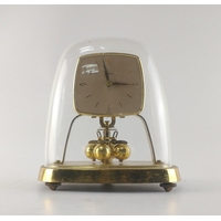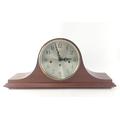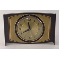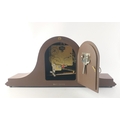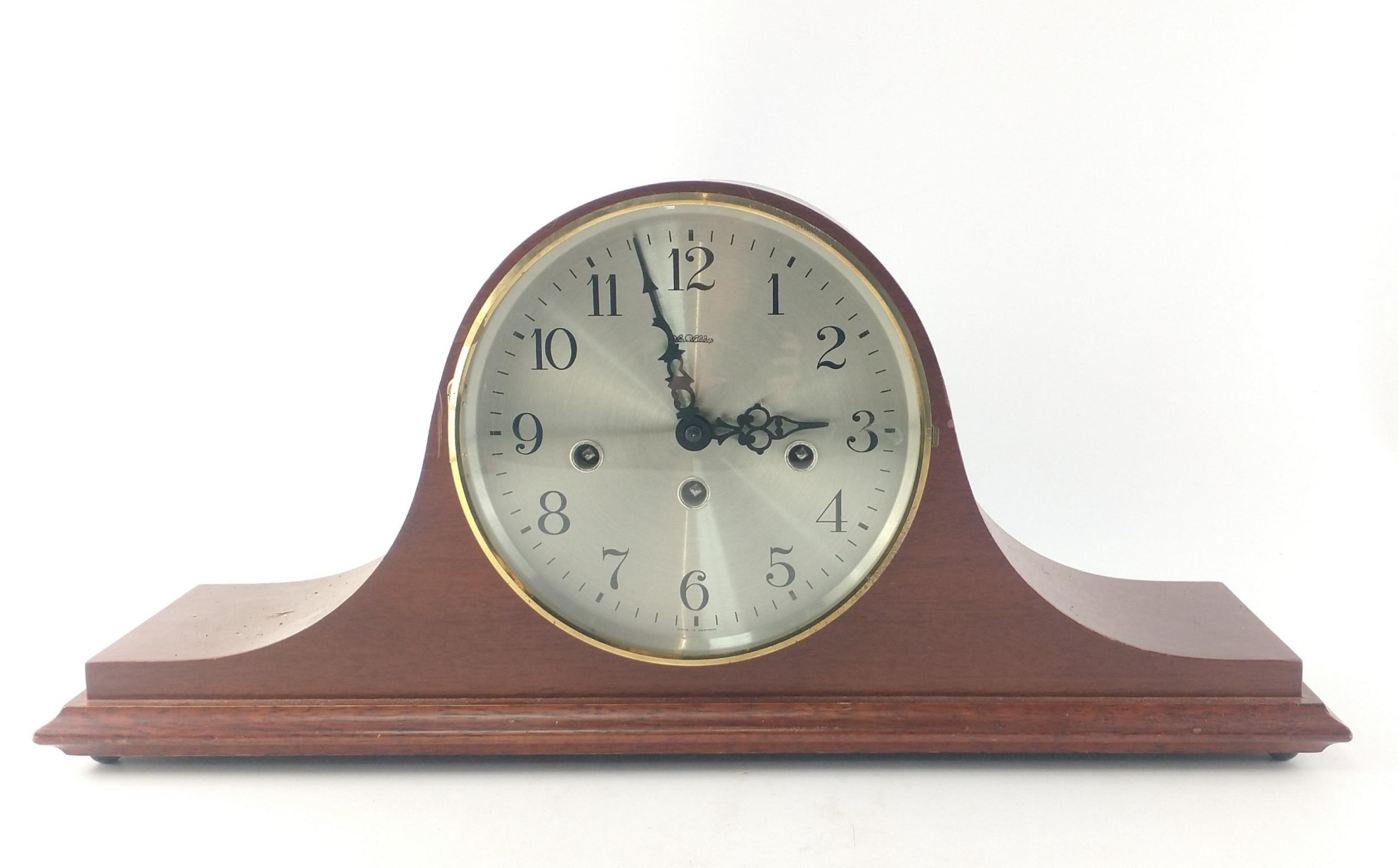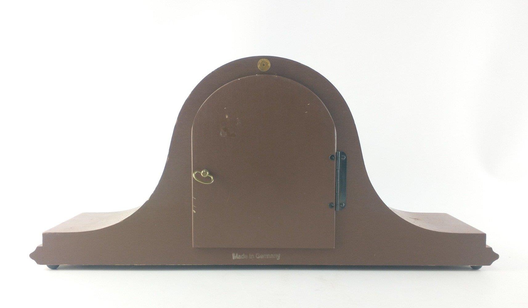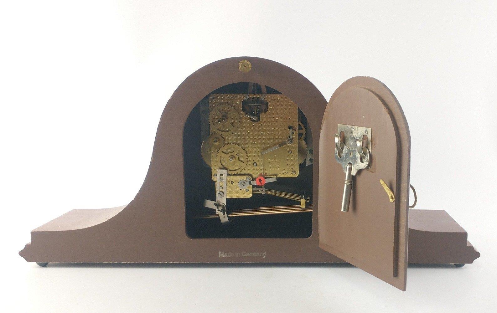 A very stylish WEST GERMANY mantle clock with FRANZ HERMLE Westminster Chime brass movement. 50cm across. Key in holder inside door.