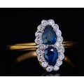 SAPPHIRE AND DIAMOND DOUBLE CLUSTER RING, in 18-ct gold. Set with 2 pear shaped blue sapphires totalling approx. 0.84 ct. Both flanked with diamonds totalling approx. 0.20 ct. Size M. 2.2 grams.