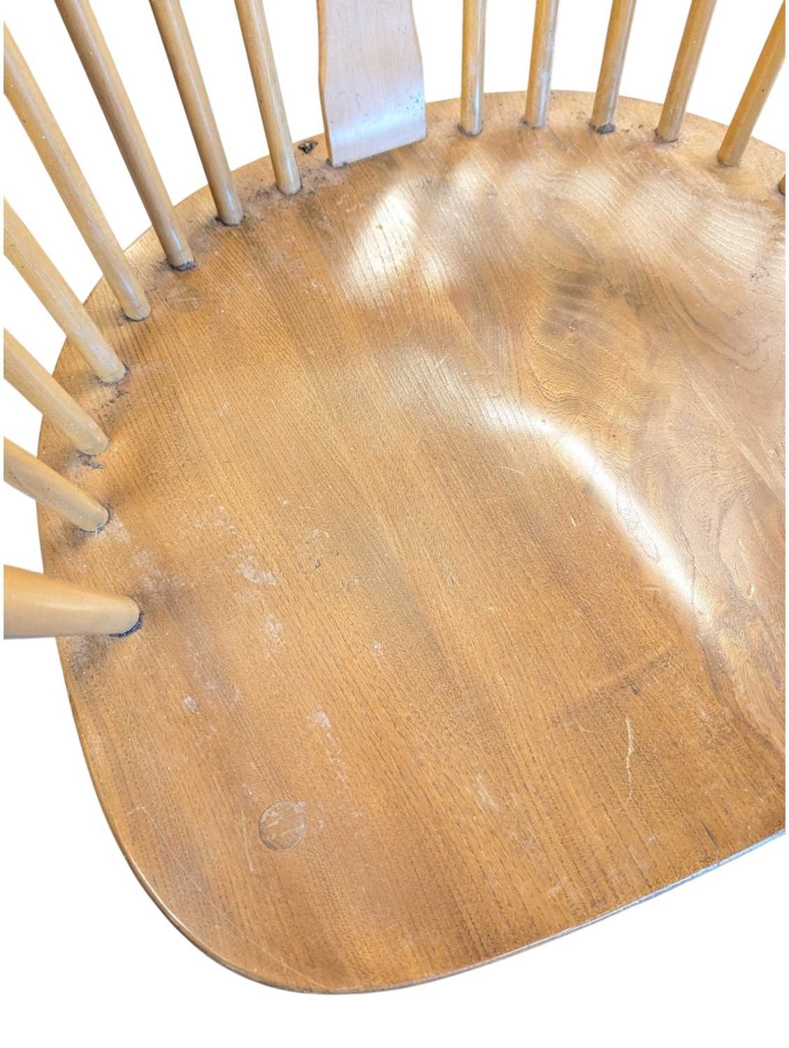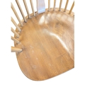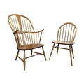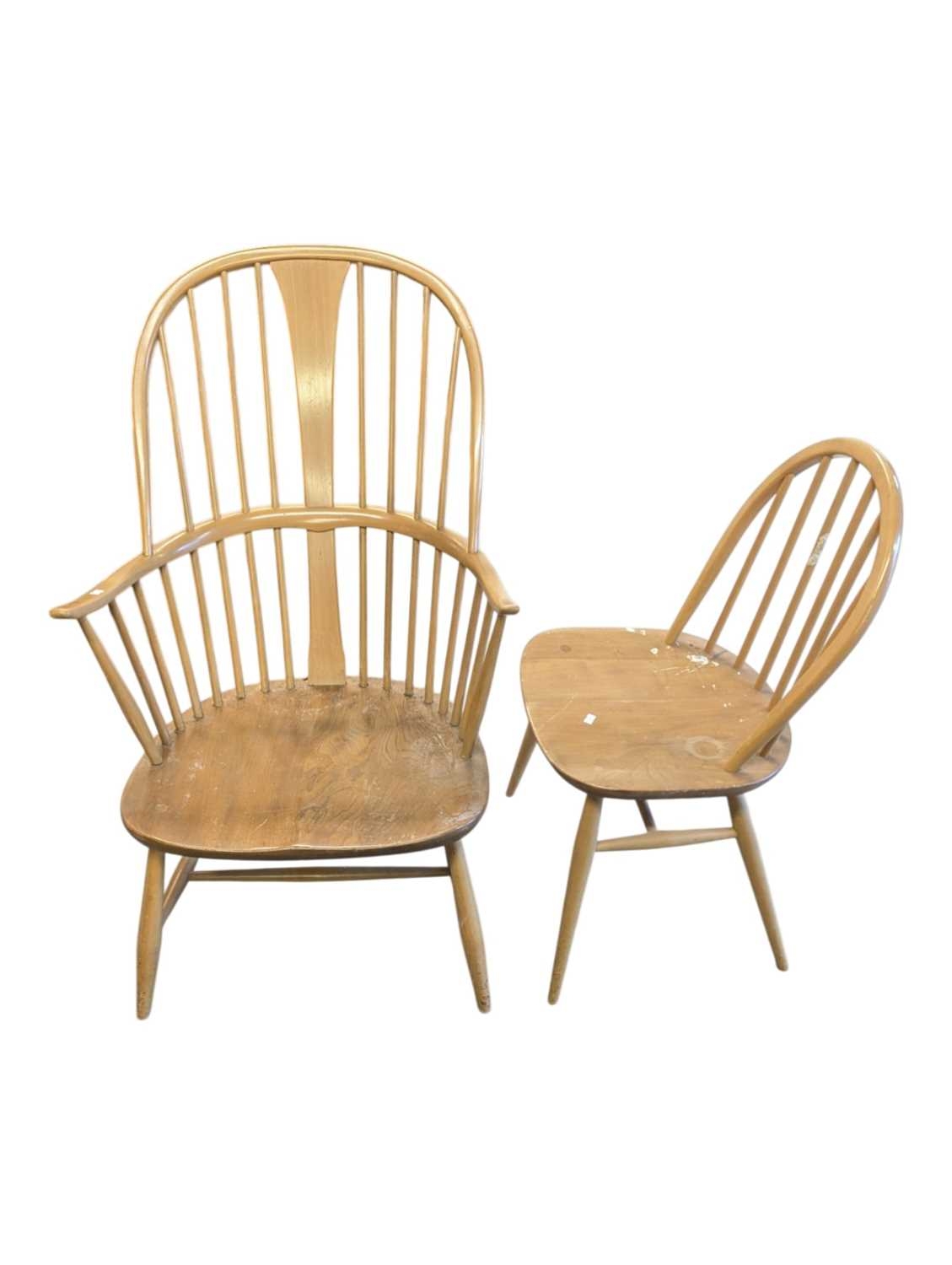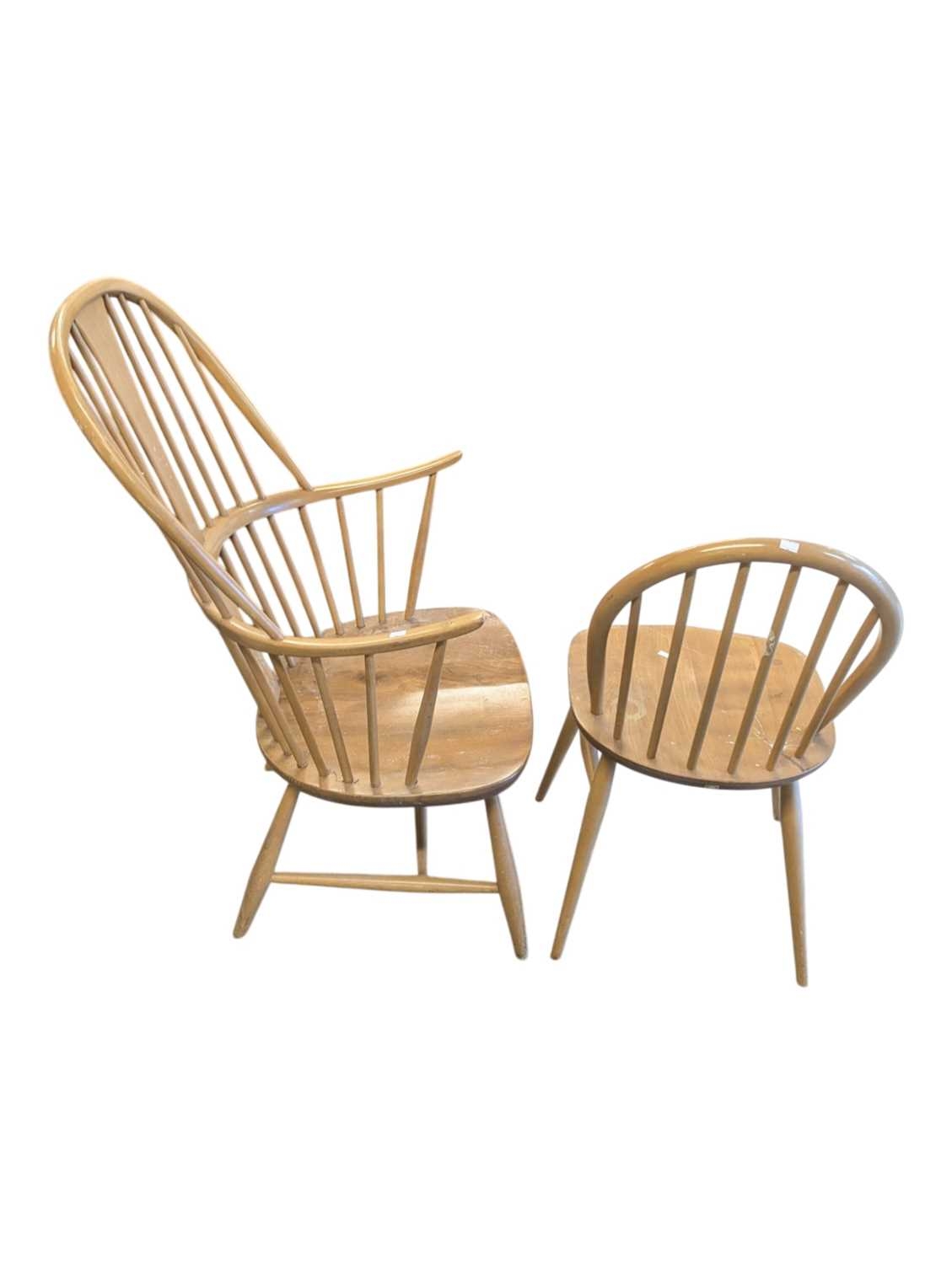 Ercol Furniture - A 20th century Ercol comb-back double bow ' Chairmakers ' Windsor armchair. Of beech and elm construcion the chair being raised on tapering feet with saddle seat united by H stretcher with spindle gallery back rest and horseshoe style elbow rests. Together with a similar smaller example. Measures approx: 103x62x70cm