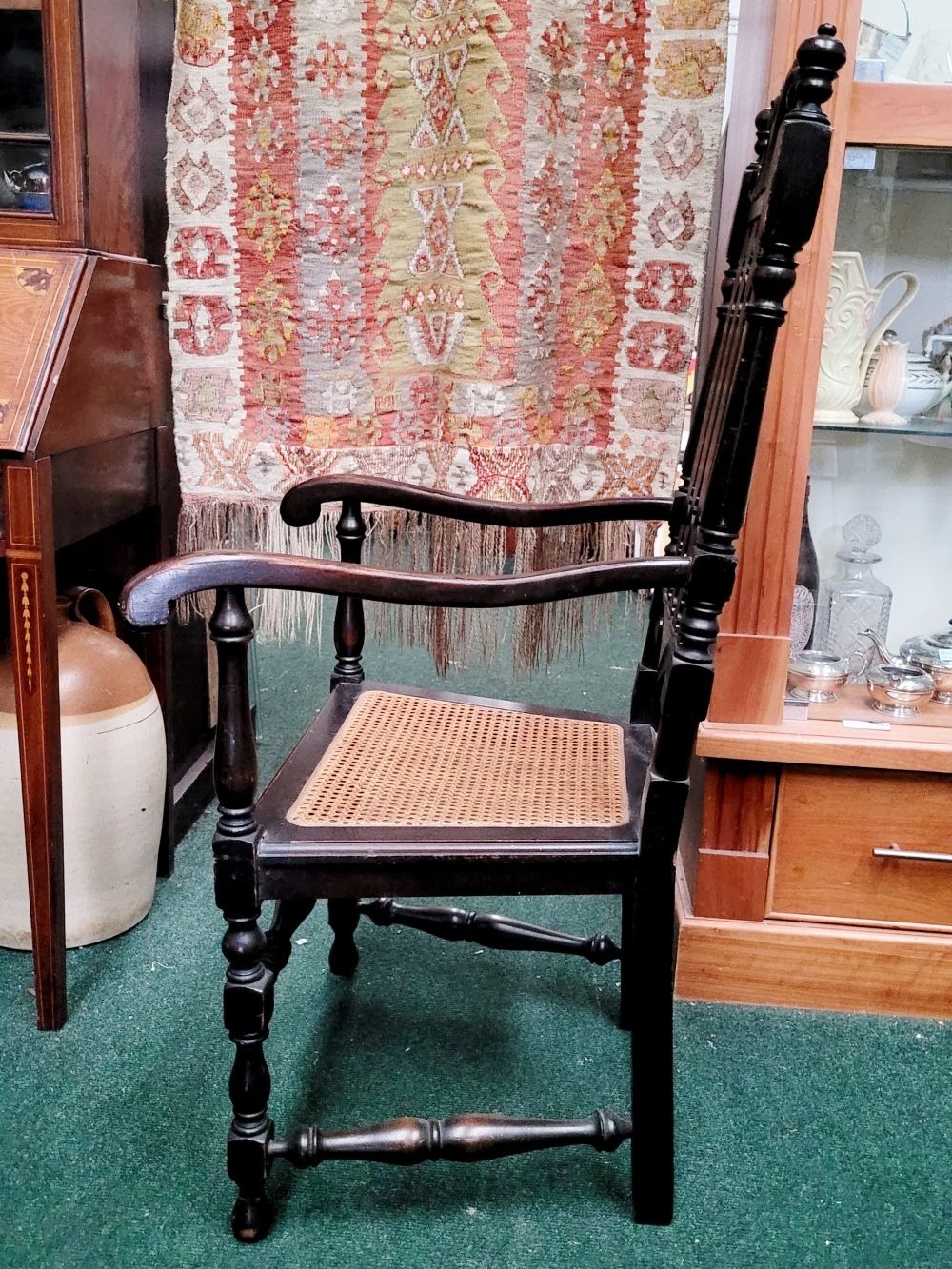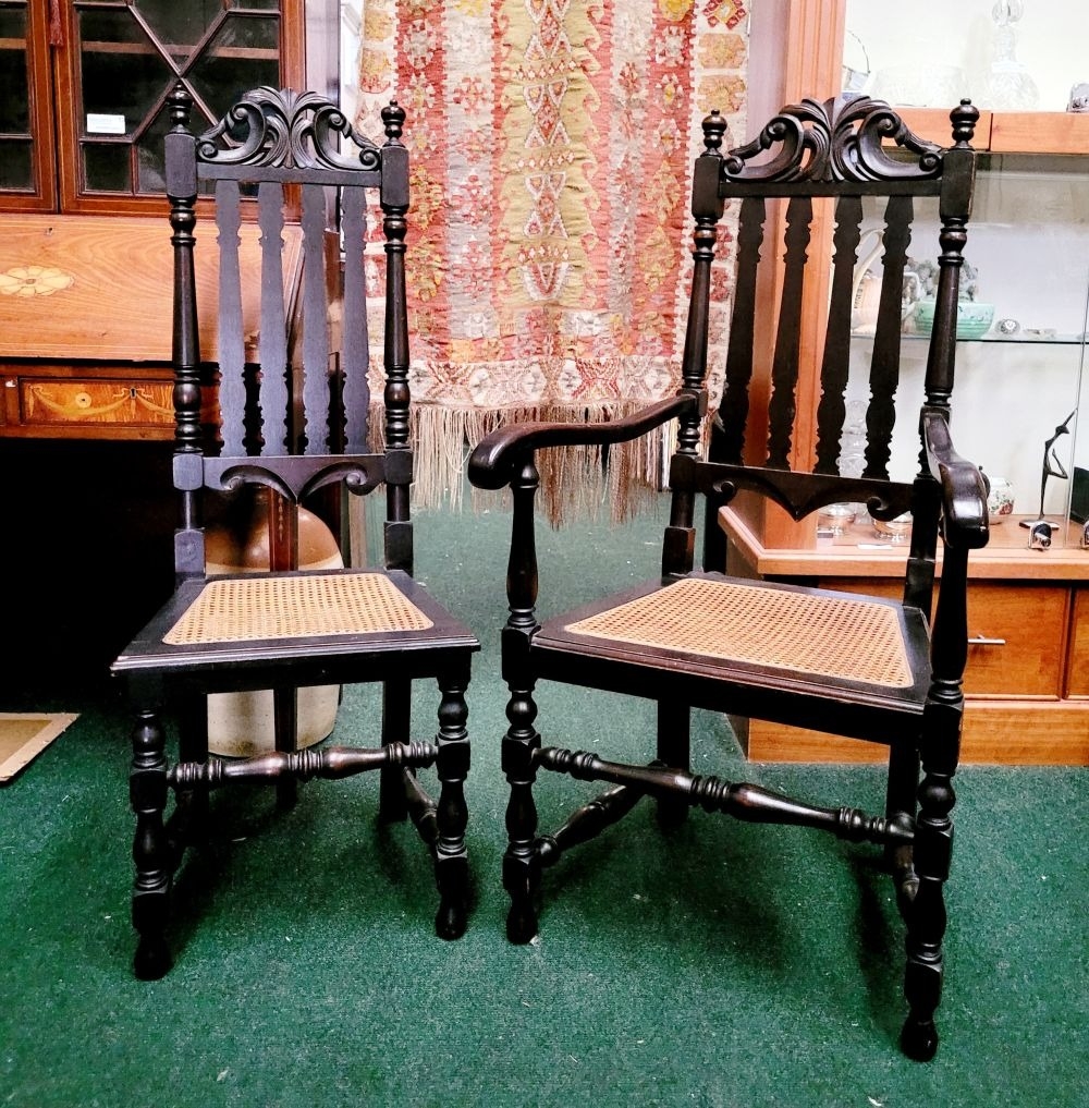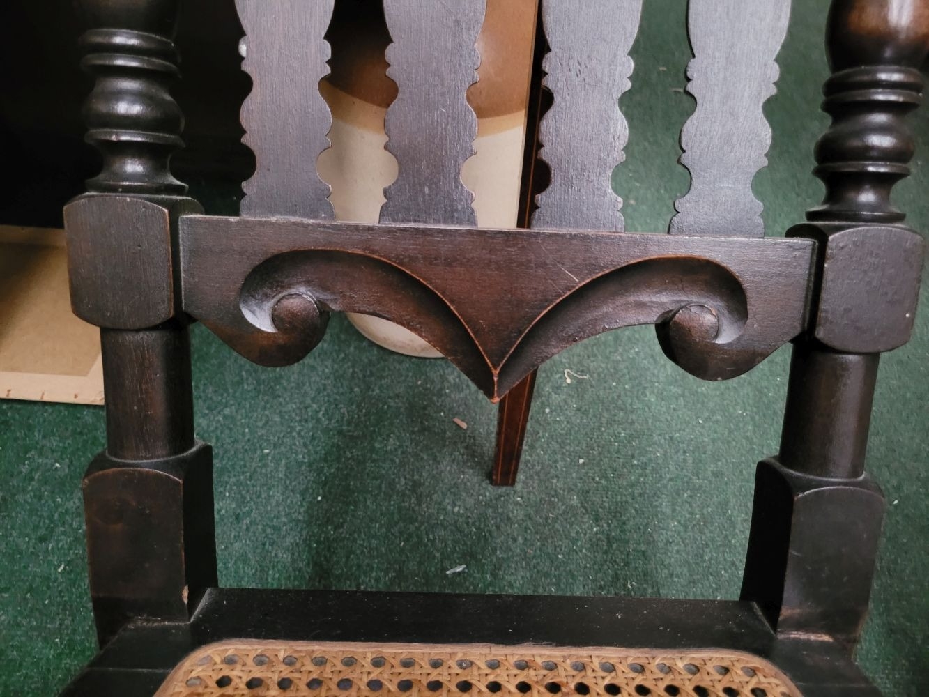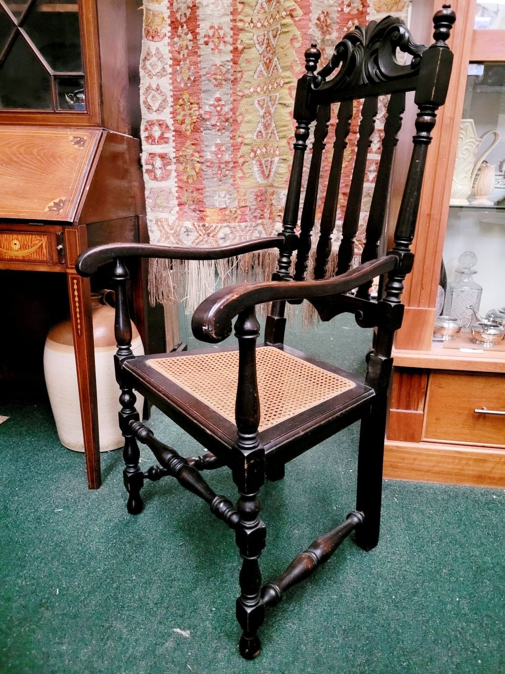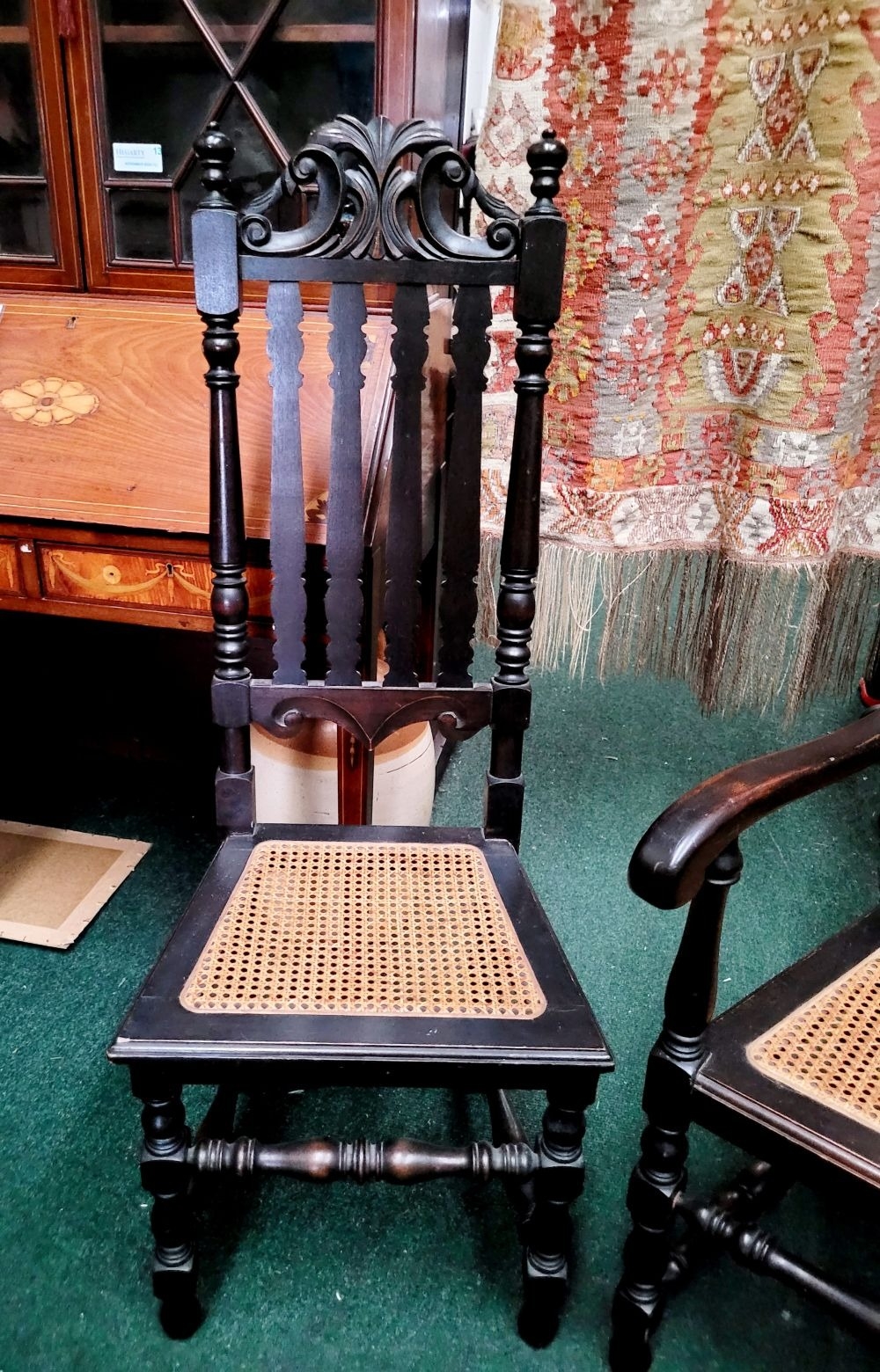 TWO ANTIQUE WILLIAM & MARY STYLE EBONISED SPINDLE BACK CHAIRS, one an armchair the other a open chair. Each with matching carved scrolling foliage crest rail & four half-turned half-flat spindle uprights held between a pair of turned uprights each with a scroll carved skirt detail to the end, both with woven cane seats in excellent condition, raised on turned leg united by turned stretchers. The arms to the armchair with scroll end. Both in very good condition. Nice set. Dimensions of armchair: 122 x 63 x 58cm (H x W x D) height to seat: 46cm. Open chair: 121 x 47 x 50cm (H x W x D). Height to seat: 43.5cm. (2)