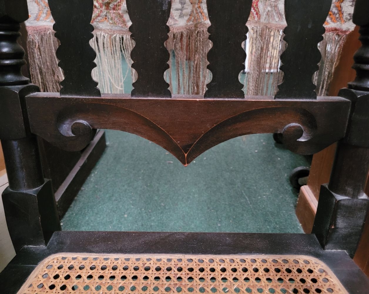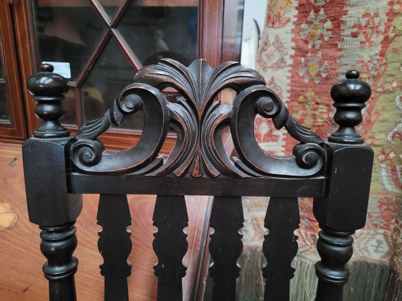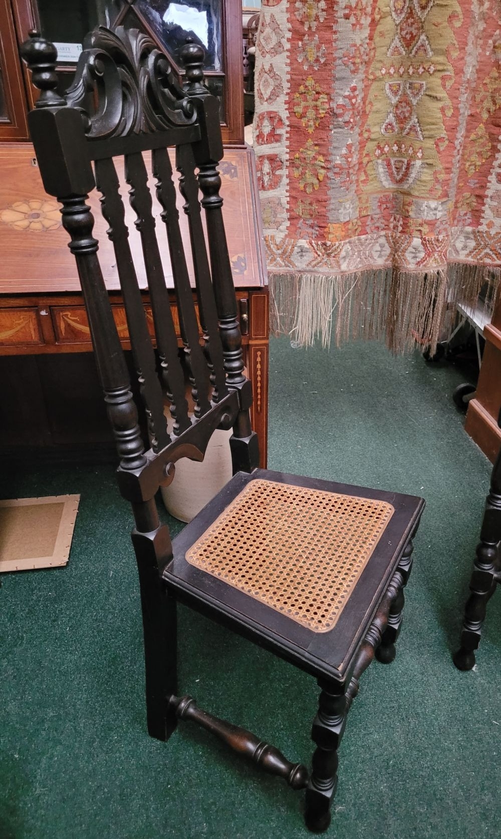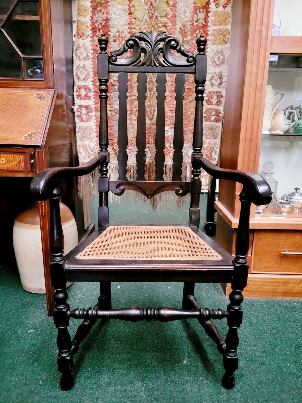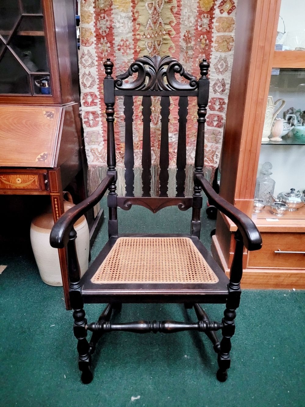TWO ANTIQUE WILLIAM & MARY STYLE EBONISED SPINDLE BACK CHAIRS, one an armchair the other a open chair. Each with matching carved scrolling foliage crest rail & four half-turned half-flat spindle uprights held between a pair of turned uprights each with a scroll carved skirt detail to the end, both with woven cane seats in excellent condition, raised on turned leg united by turned stretchers. The arms to the armchair with scroll end. Both in very good condition. Nice set. Dimensions of armchair: 122 x 63 x 58cm (H x W x D) height to seat: 46cm. Open chair: 121 x 47 x 50cm (H x W x D). Height to seat: 43.5cm. (2)