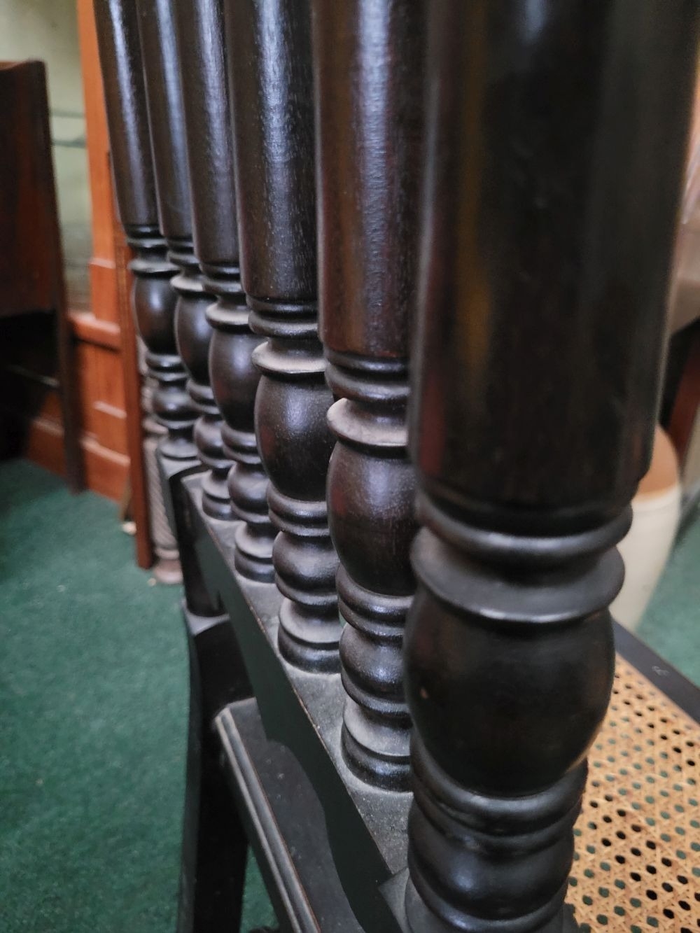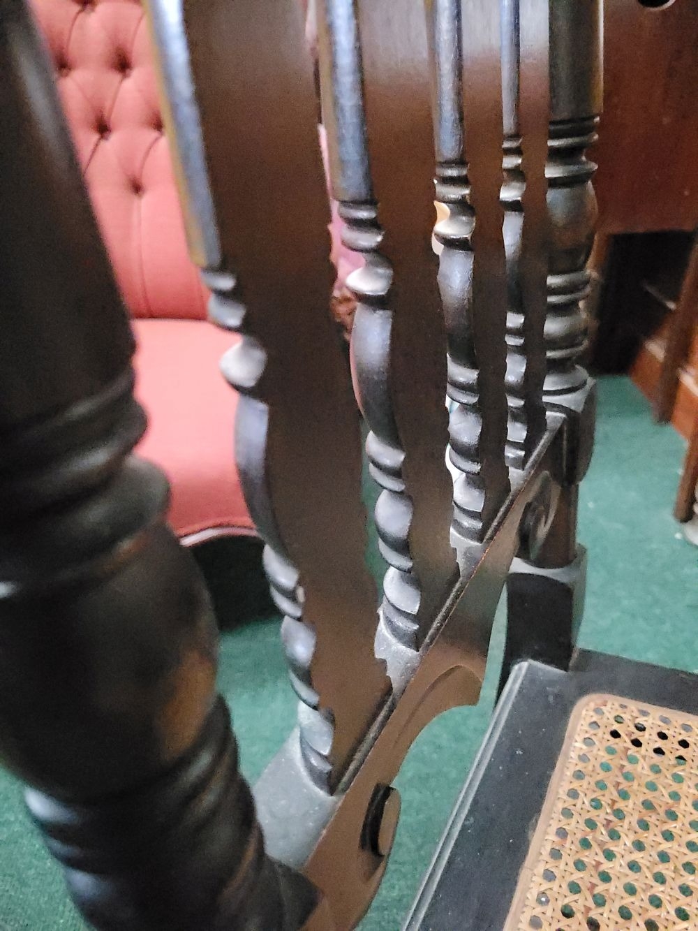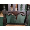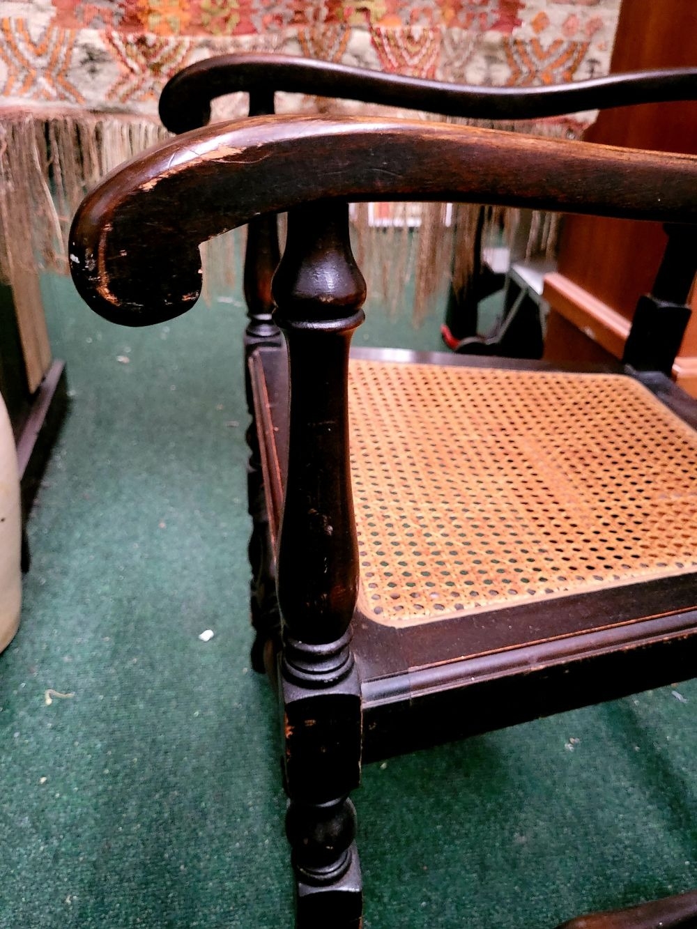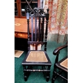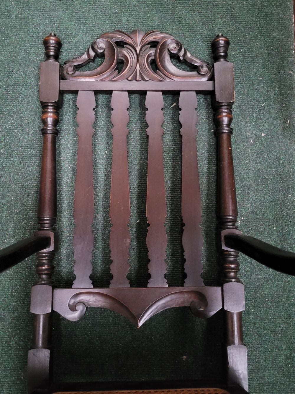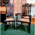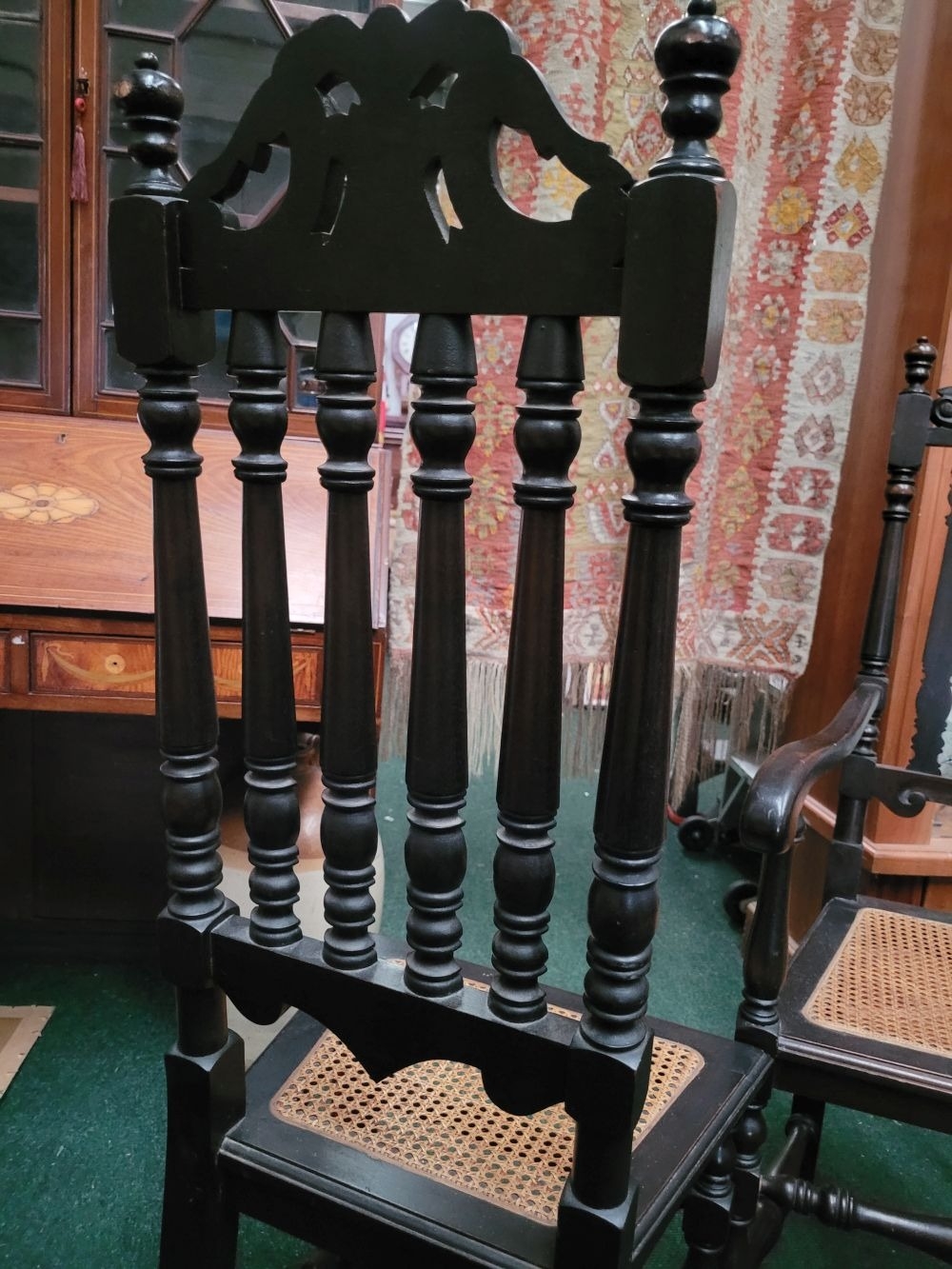 TWO ANTIQUE WILLIAM & MARY STYLE EBONISED SPINDLE BACK CHAIRS, one an armchair the other a open chair. Each with matching carved scrolling foliage crest rail & four half-turned half-flat spindle uprights held between a pair of turned uprights each with a scroll carved skirt detail to the end, both with woven cane seats in excellent condition, raised on turned leg united by turned stretchers. The arms to the armchair with scroll end. Both in very good condition. Nice set. Dimensions of armchair: 122 x 63 x 58cm (H x W x D) height to seat: 46cm. Open chair: 121 x 47 x 50cm (H x W x D). Height to seat: 43.5cm. (2)