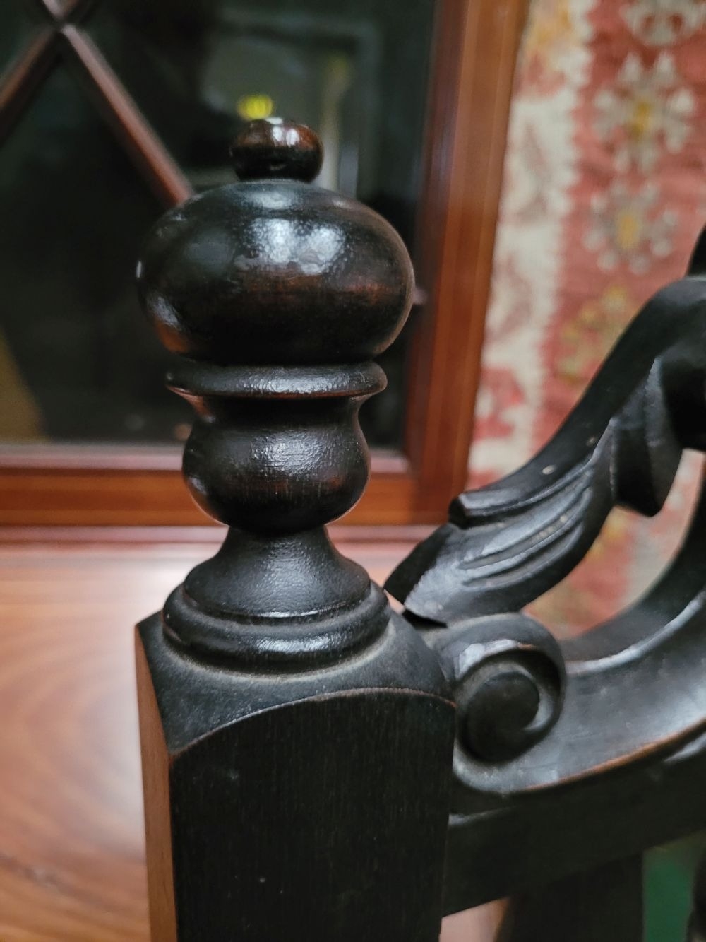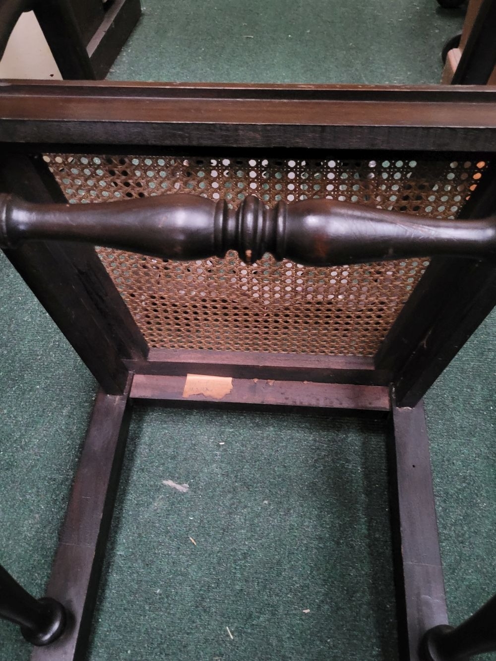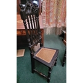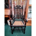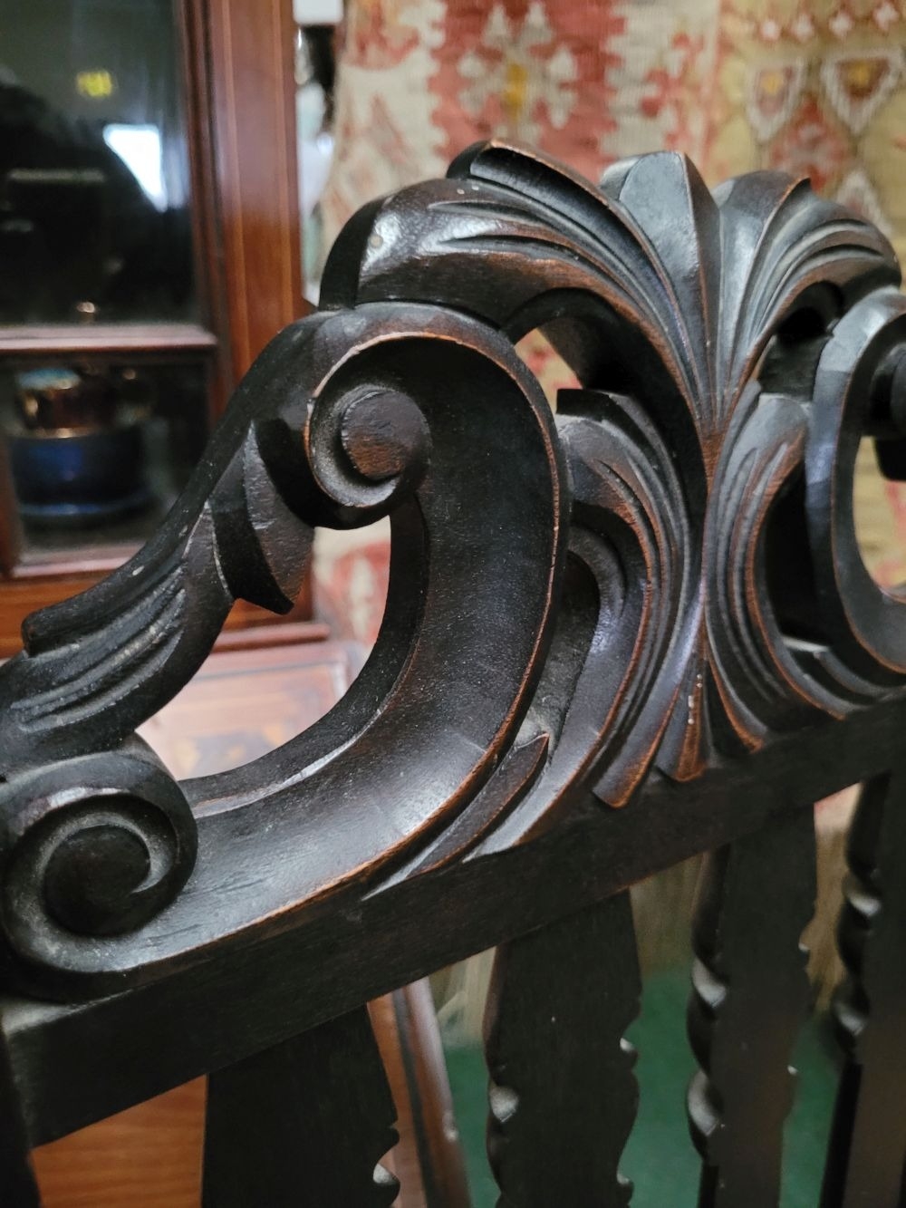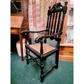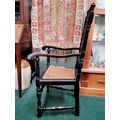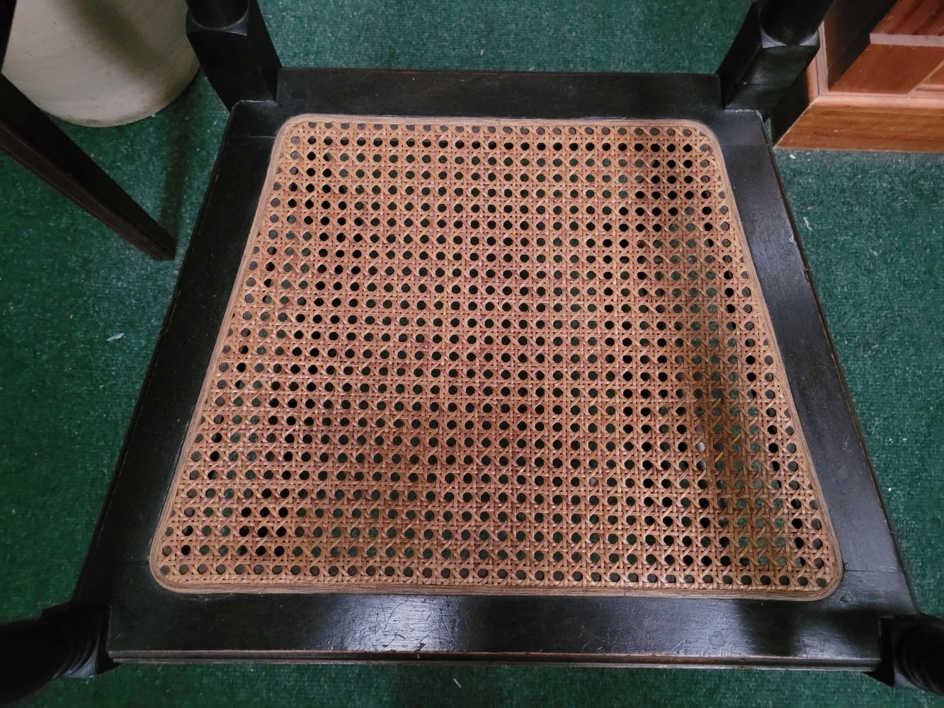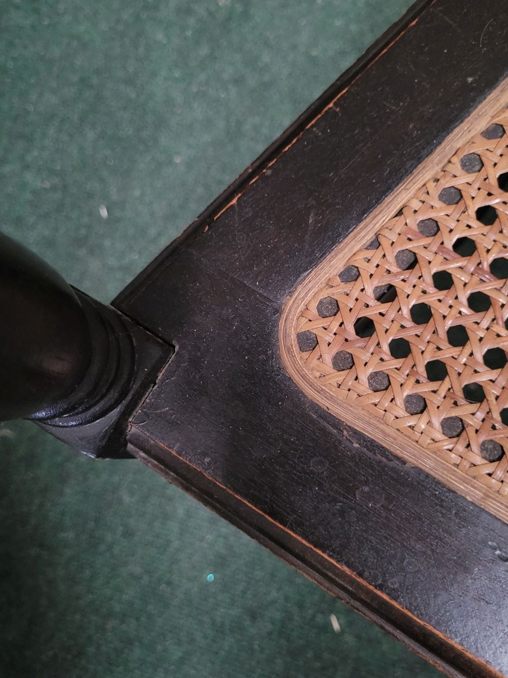 TWO ANTIQUE WILLIAM & MARY STYLE EBONISED SPINDLE BACK CHAIRS, one an armchair the other a open chair. Each with matching carved scrolling foliage crest rail & four half-turned half-flat spindle uprights held between a pair of turned uprights each with a scroll carved skirt detail to the end, both with woven cane seats in excellent condition, raised on turned leg united by turned stretchers. The arms to the armchair with scroll end. Both in very good condition. Nice set. Dimensions of armchair: 122 x 63 x 58cm (H x W x D) height to seat: 46cm. Open chair: 121 x 47 x 50cm (H x W x D). Height to seat: 43.5cm. (2)