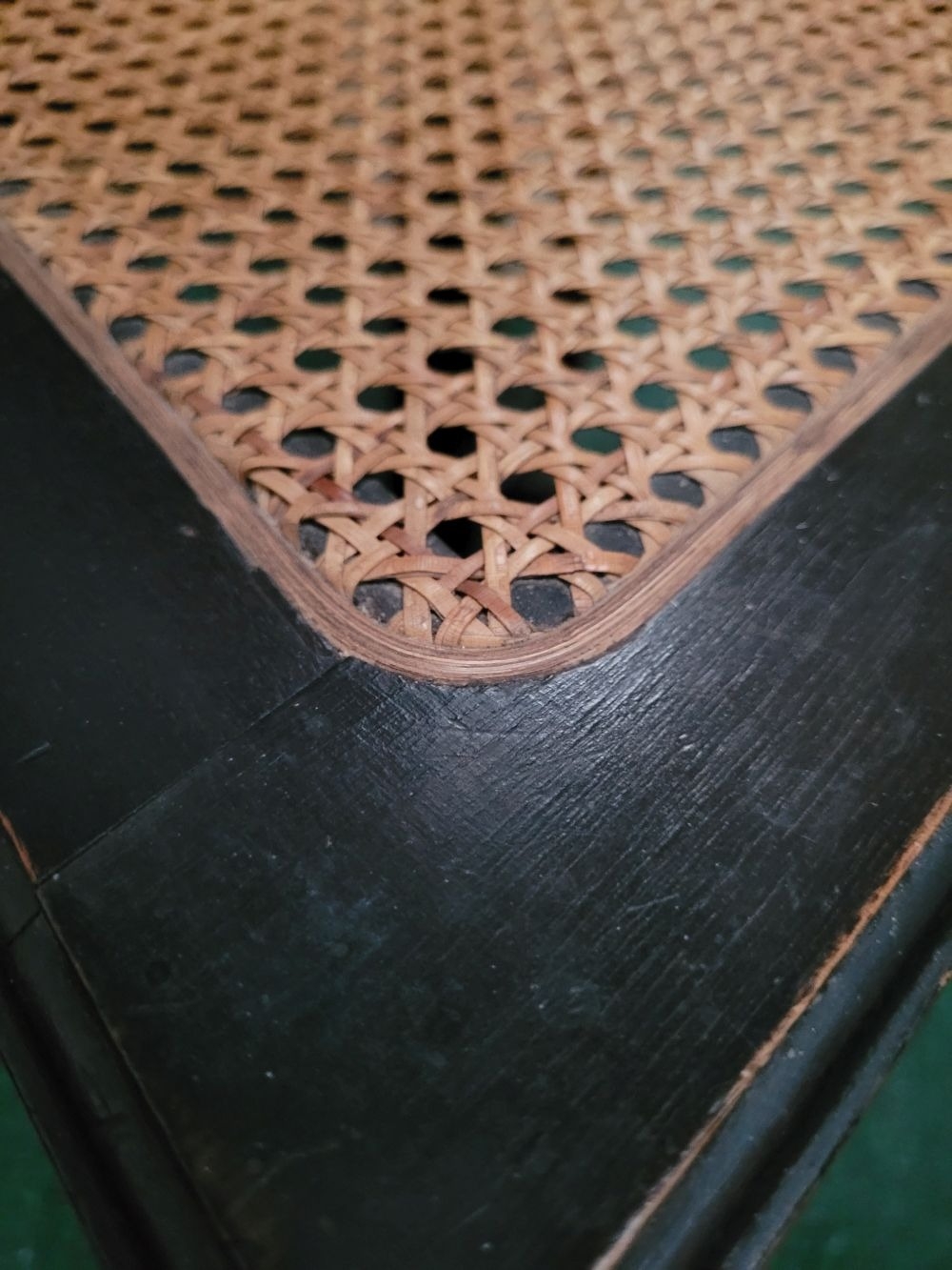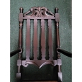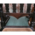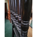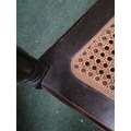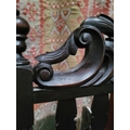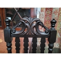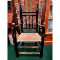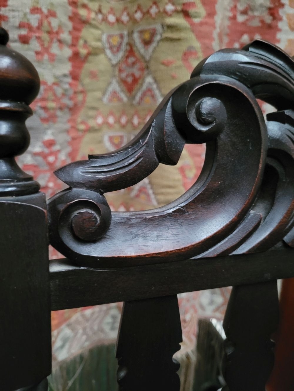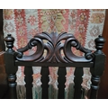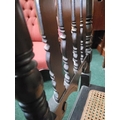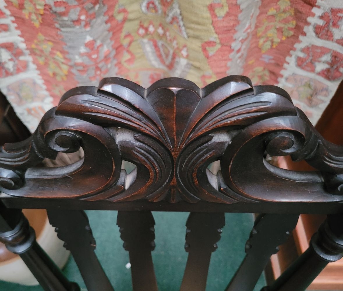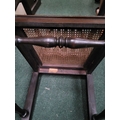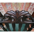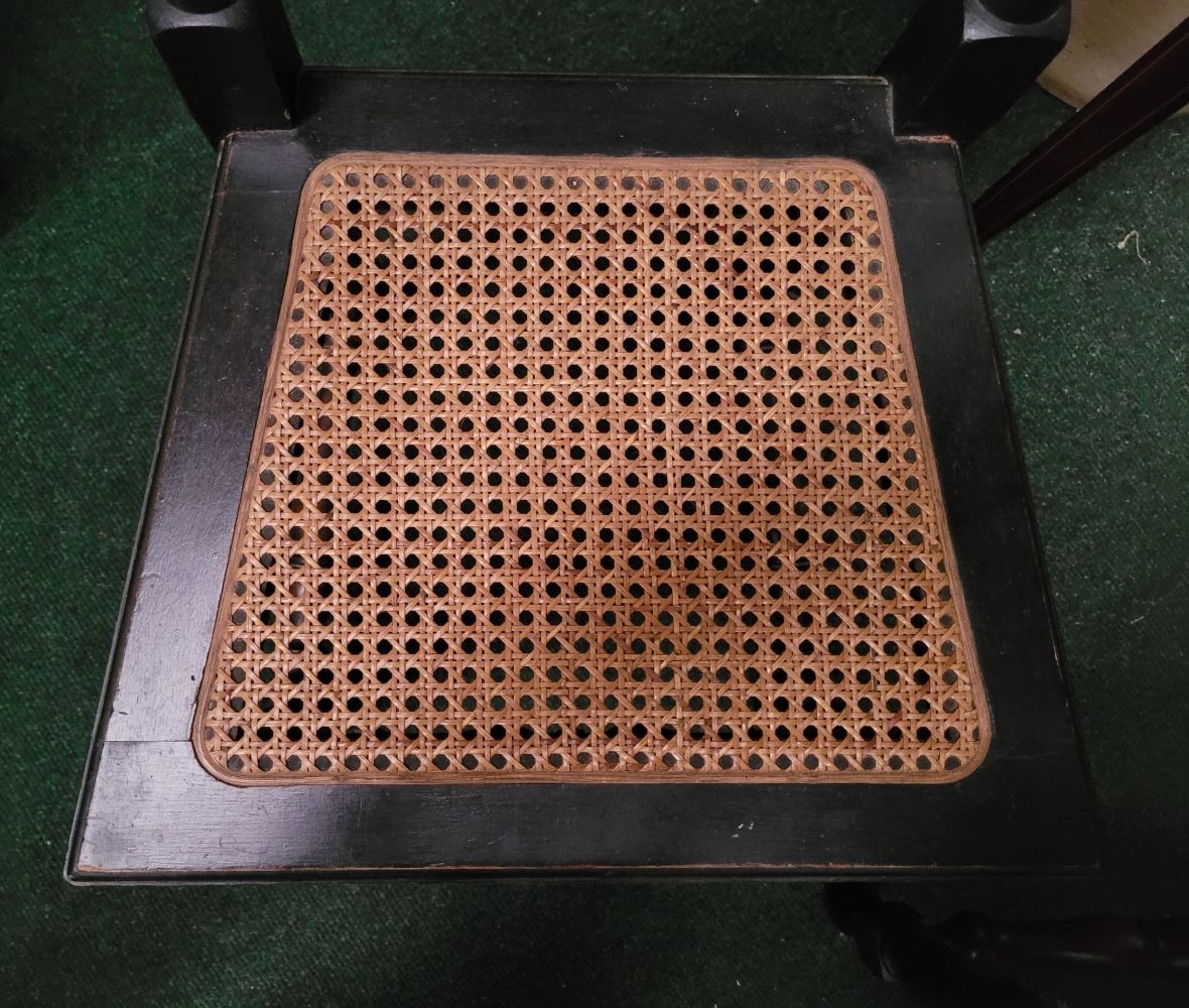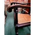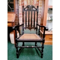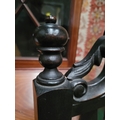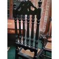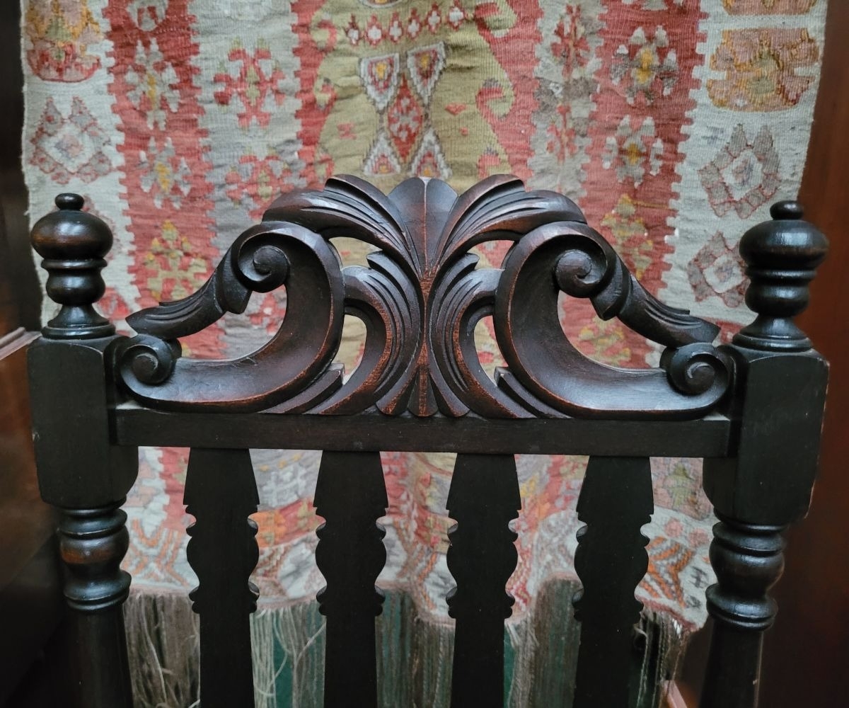 TWO ANTIQUE WILLIAM & MARY STYLE EBONISED SPINDLE BACK CHAIRS, one an armchair the other a open chair. Each with matching carved scrolling foliage crest rail & four half-turned half-flat spindle uprights held between a pair of turned uprights each with a scroll carved skirt detail to the end, both with woven cane seats in excellent condition, raised on turned leg united by turned stretchers. The arms to the armchair with scroll end. Both in very good condition. Nice set. Dimensions of armchair: 122 x 63 x 58cm (H x W x D) height to seat: 46cm. Open chair: 121 x 47 x 50cm (H x W x D). Height to seat: 43.5cm. (2)