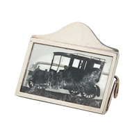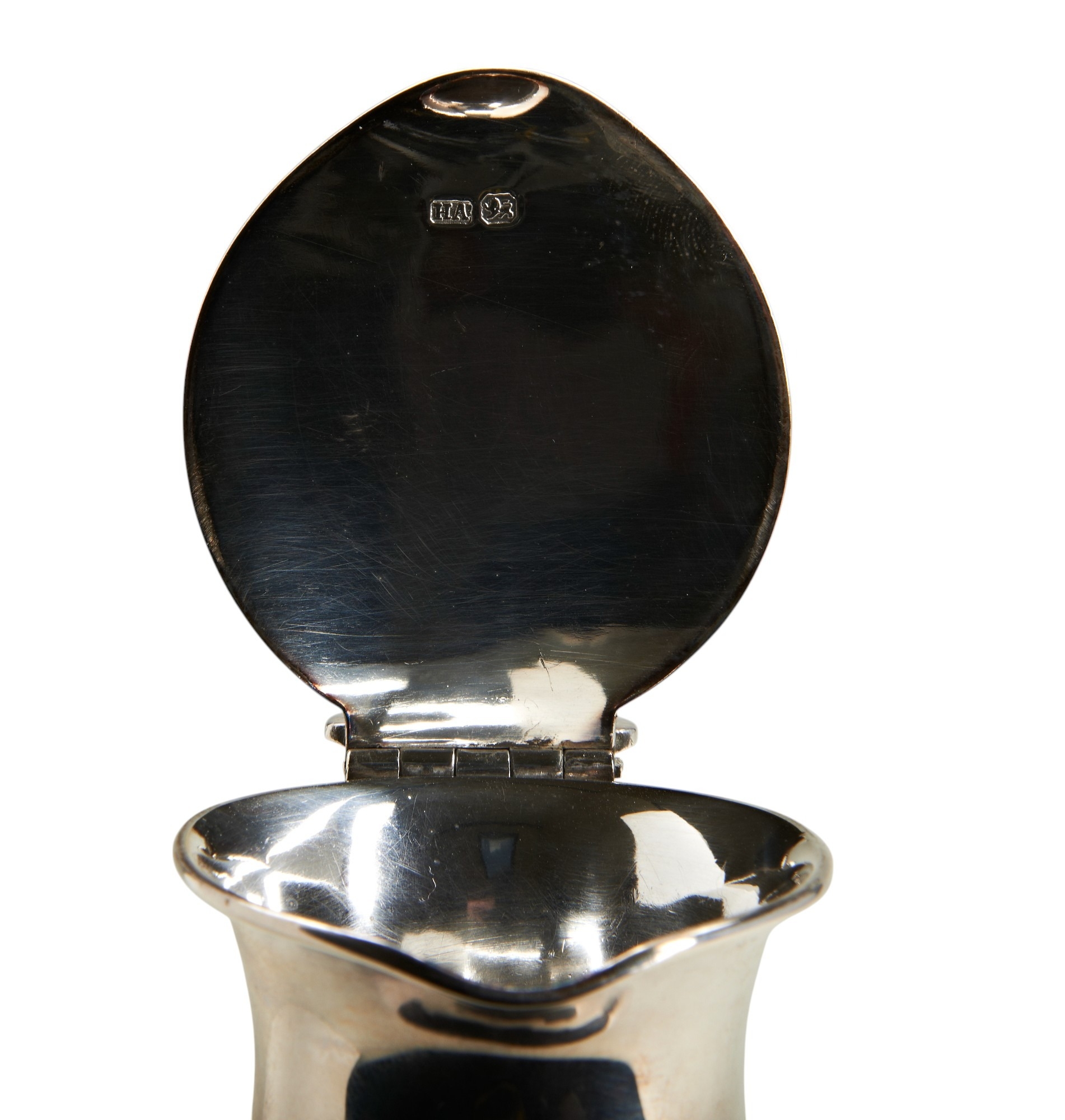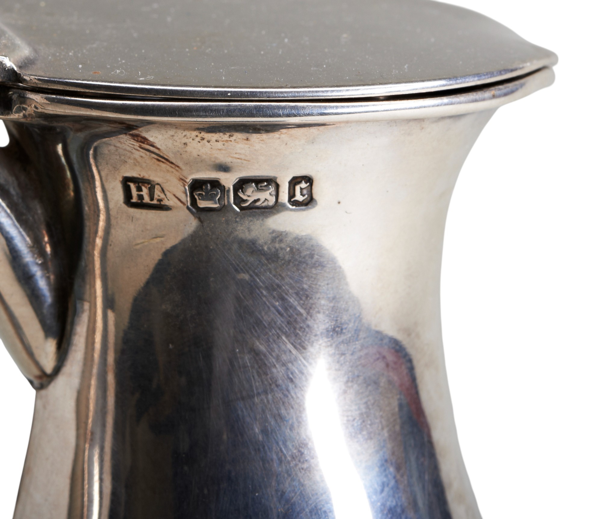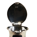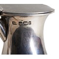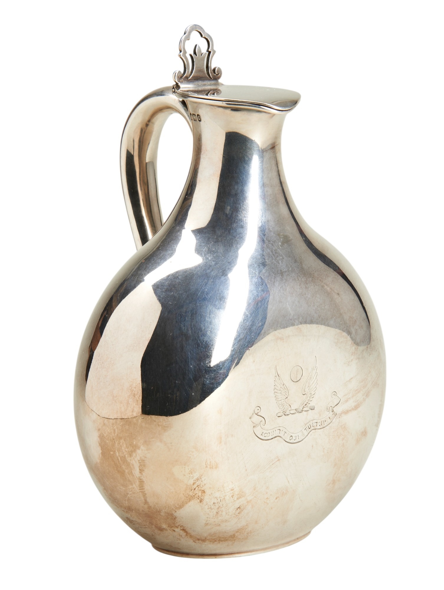 A compressed circular jug with a hinged lid and pierced thumb piece, engraved to the front with a crest and motto. Made by Harold Atkins in Sheffield in 1895
