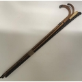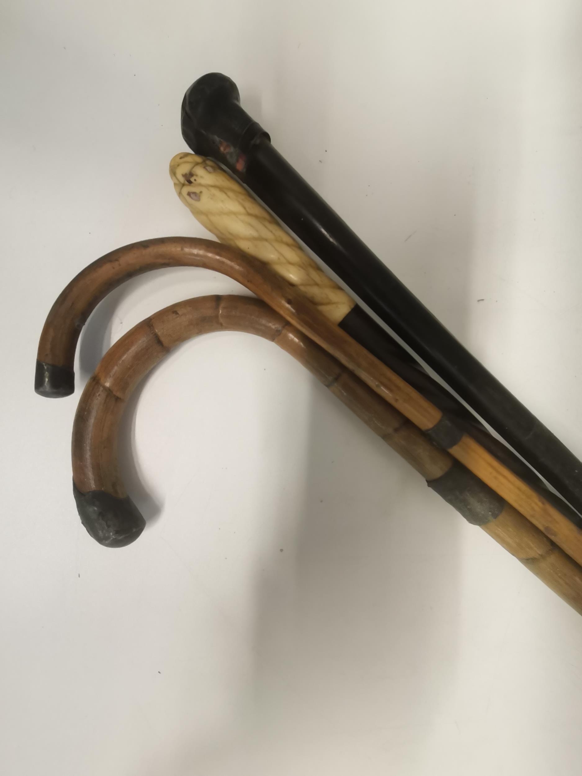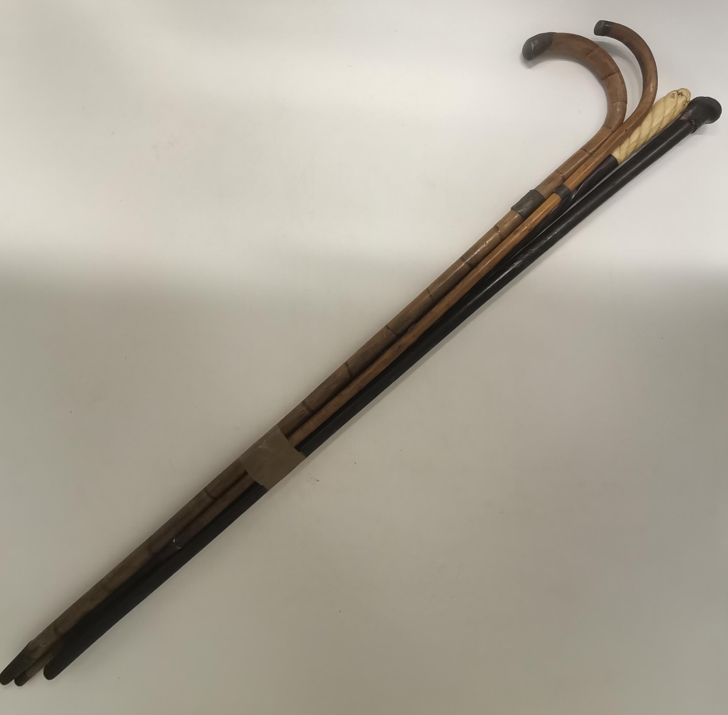 Four assorted walking sticks, comprising three silver-mounted examples, and a bone-handled cane with twisted shaft. (4) Bone-handled example 91cm long