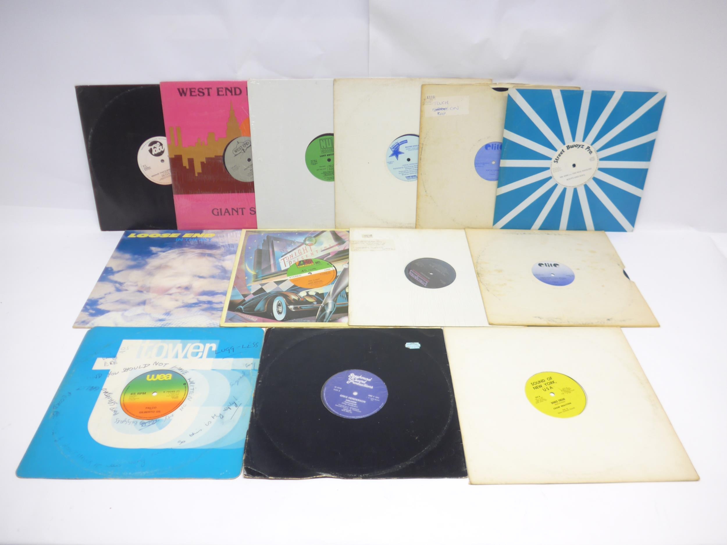 House / Disco / Funk / Soul - A collection of thirteen 12" singles to include GILBERTO GIL: 'Palco' (WEA Records K 79285(T)), AL McCALL: 'Hard Times' (West End Records WES 22142), LOST ENTITY: 'Bring That Back (One More Time)' (Nu Groove Records NG 046), MAXINE SINGLETON: 'Don't You Love It' (Peter Pan Artists Series TAS-2801E), CHAIN REACTION: 'Dance Freak' (Sound Of New York, USA 707), ROOTS AND SOUL: 'Mr. Kirk Vs The Real Bassline' (Street Bwoyz Pro. SBP 003), LOOSE END: 'In The Sky' (Virgin VS 497-12), GINO SOCCIO: 'Closer' (Atlantic K 11594), NORTHEND FEATURING MICHELLE WALLACE: 'Happy Days' (Emergency Records EMDS 6520), TOUCH: 'Keep On' (Elite DAZZ 11) and 'Love Something Special' (Elite DAZZ 14), GREG HENDERSON: 'Dreamin' (Greyhound Record Productions GRP T 101), THE S.O.S. BAND: 'Groovin (That's What We're Doin')' (Tabu Records TBU A 13 3120) (13, vinyl generally VG-VG+)