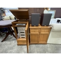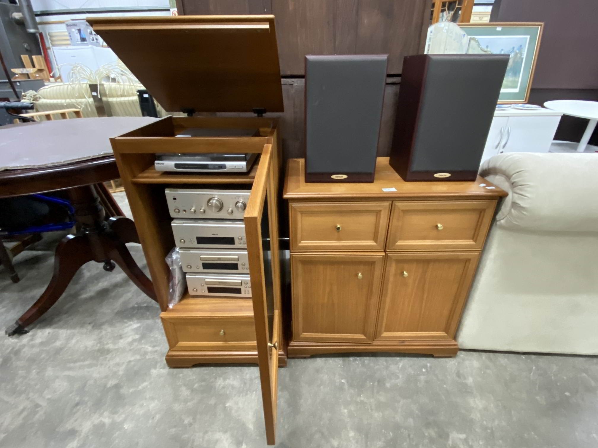 Sony automatic stereo turntable system PS-J10, Denon personal component system/integrated amplifier UPA-0F88, personal component system/AM-FM stereo tuner UTU-F88, personal component system/compact disc player UCD-F88, personal component system/stereo cassette tape deck UDR-F88 with a pair of Denon SC-E313SE 2 way loudspeakers, and oak effect stereo cupboard 90H 46W 44D & a matching media cupboard 72H 67W 40D