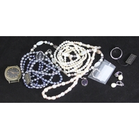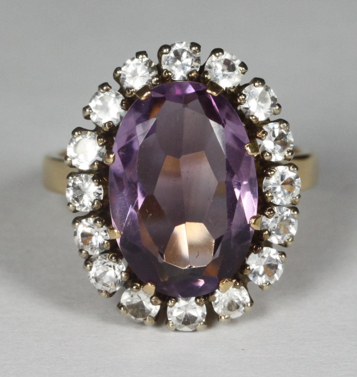 An 18k gold dress ring, eight-claw-set with an oval faceted amethyst coloured stone, approx 14x10mm, surrounded with sixteen round faceted white stones, estimated ring weight 7.1g