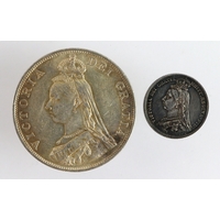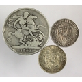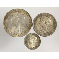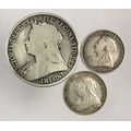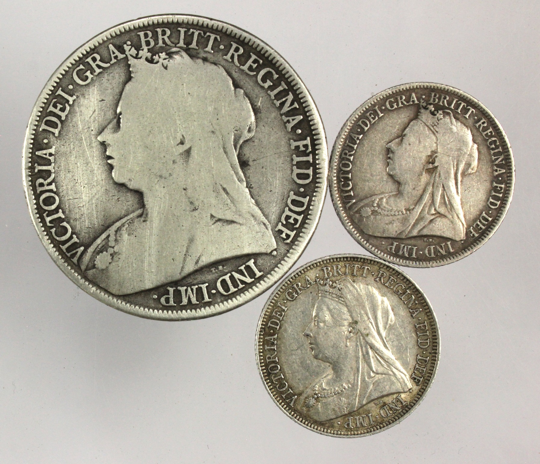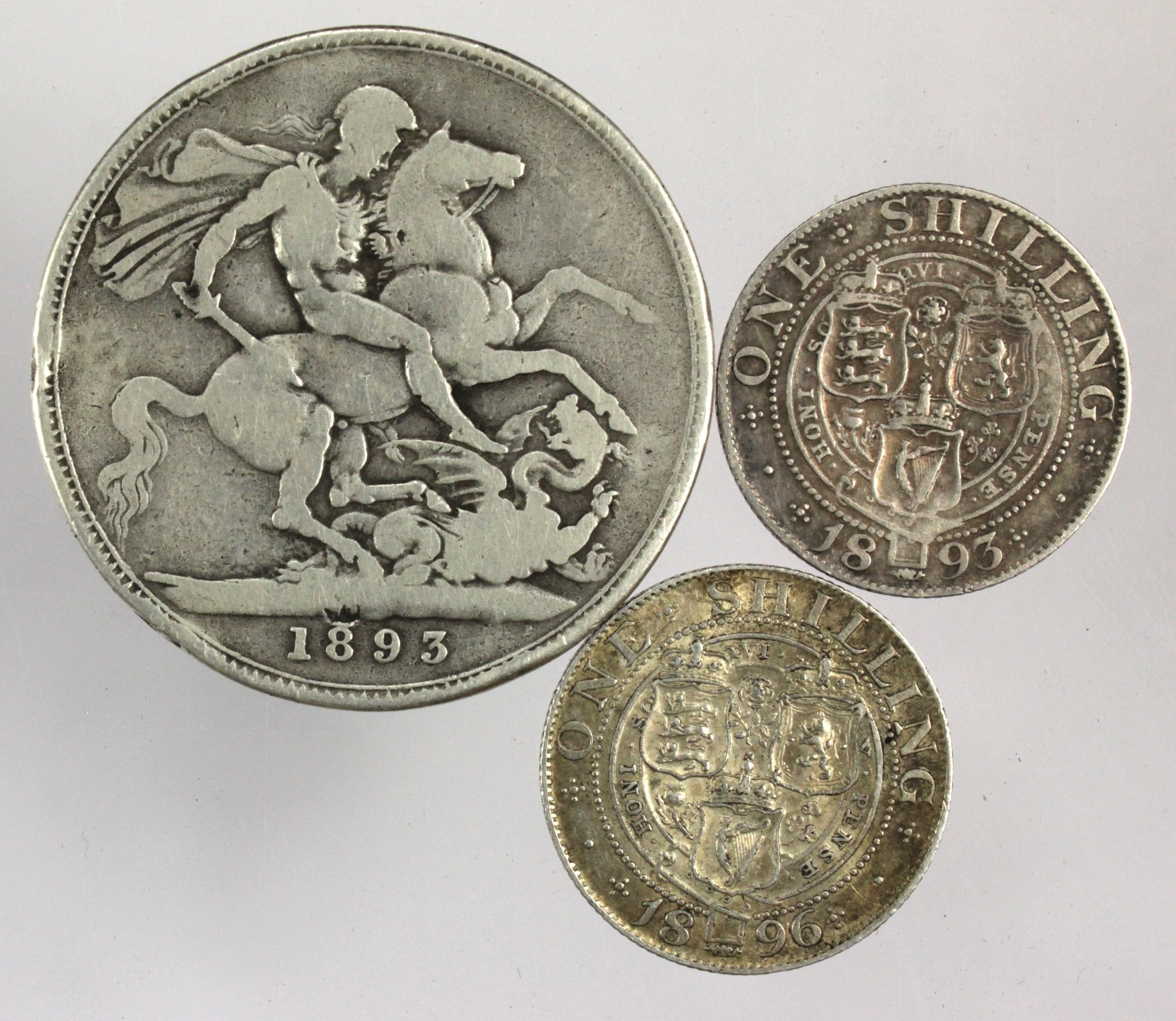Victorian silver (3) veiled hd: Crown 1893 fair; Shilling 1893 Davies 1011A 2 C ('very rare') F/GF, and Shilling 1896 small rose, Davies 1019 ('rare') GVF.