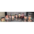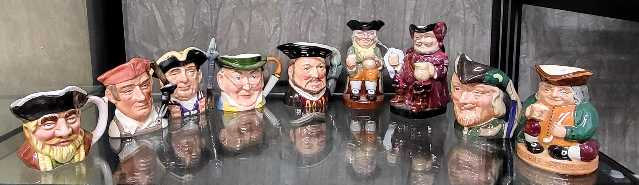 Royal Doulton character jugs including Henry VIII, Blacksmith, Robin Hood, Honest Measure, Guardsman, Fallstaff and Happy John; Sylvac Mr Pickwick (slight chip to underside), and one other. 9cm to 14cm. (9)
