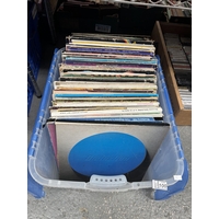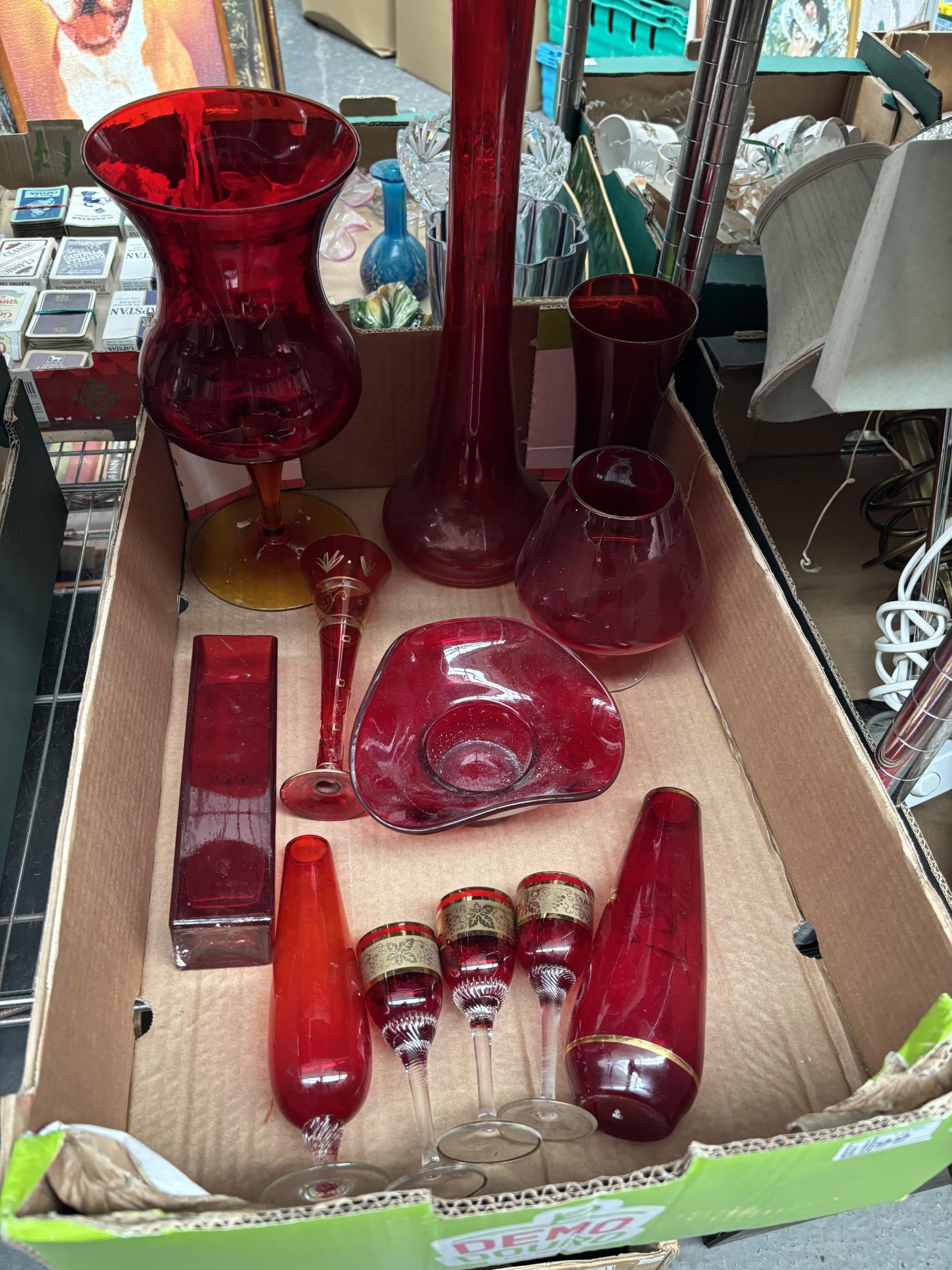 Box containing ornate red art glass vases etc