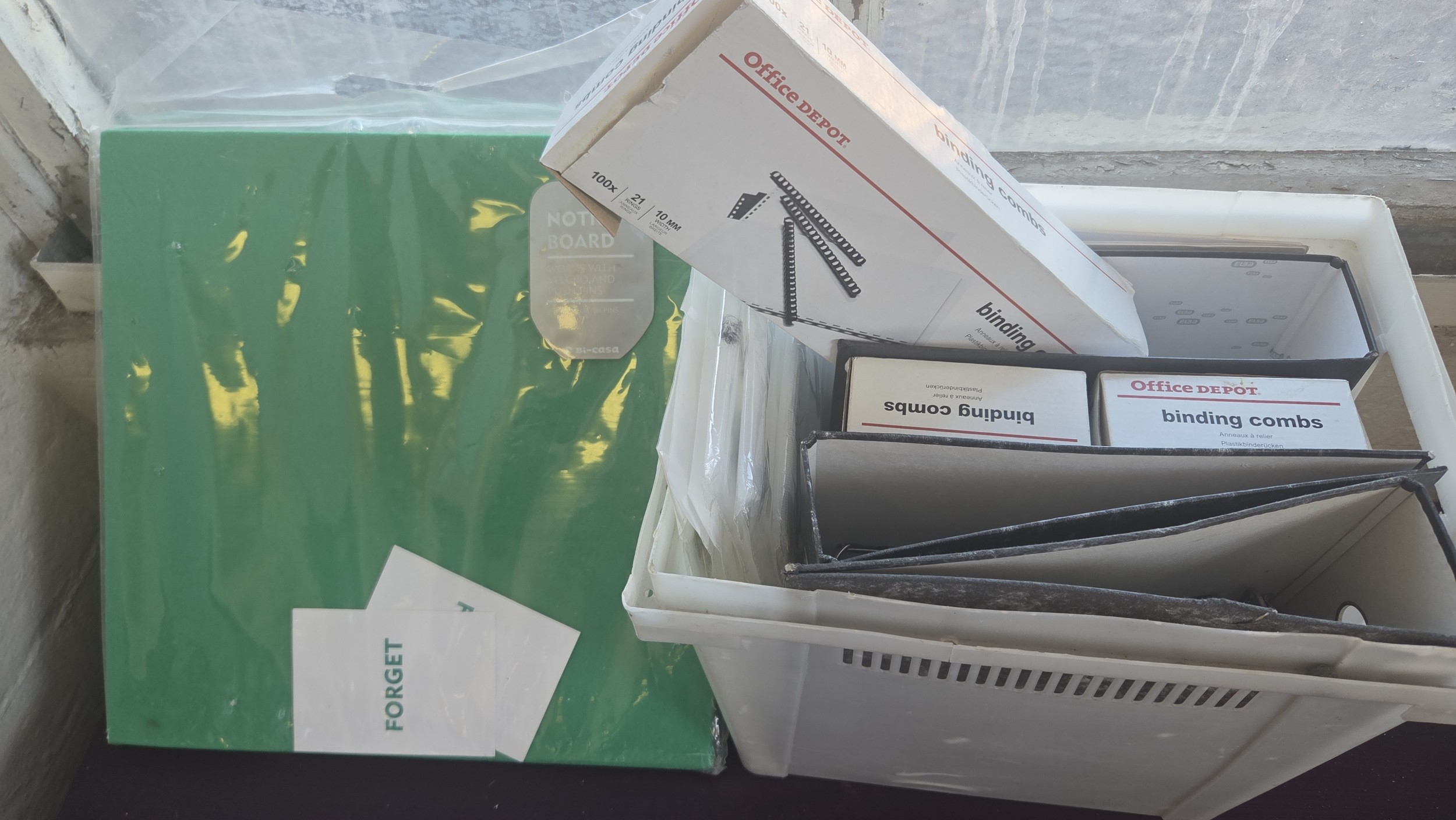 An Assortment of Office Stationery and Supplies Including Office Depot Binding Combs and bi-casa Notice Board