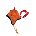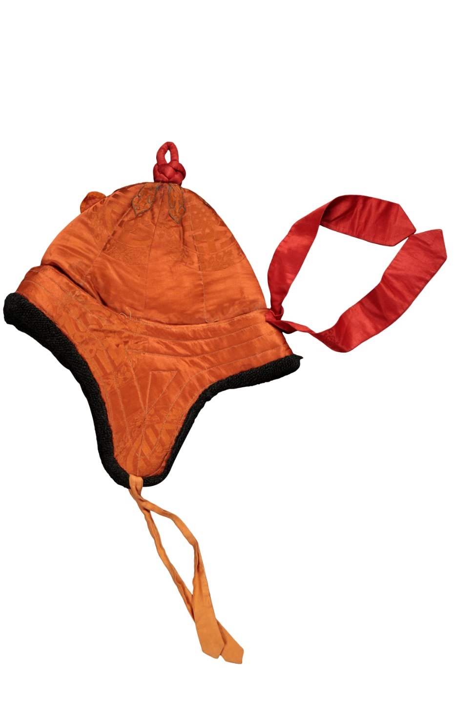 A TIBETAN WARRIORS ORANGE ROBE buttoned at the side and with flared cuffs, 195cm wide across the shoulders; together with a winter hat decorated with auspicious symbols in silk damask with a black lining (2)