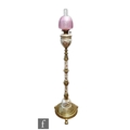 A late 19th Century Royal Worcester blush ivory floor standing oil lamp, the reservoir with sprays of flowers and foliage within a moulded border, raised to turned and cast brass fittings with three blush ivory sections leading to a bowl section base, all to a cast brass circular foot with three scroll feet, the reservoir with puce mark for circa 1891, stamped Hinks and Son Patent 4334-89, total height 173cm