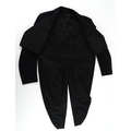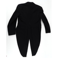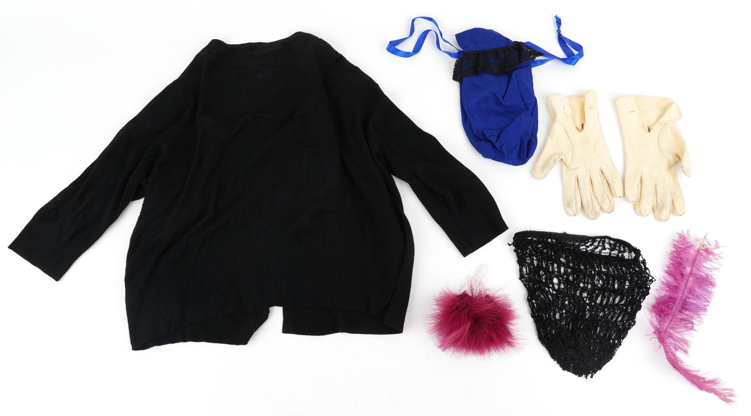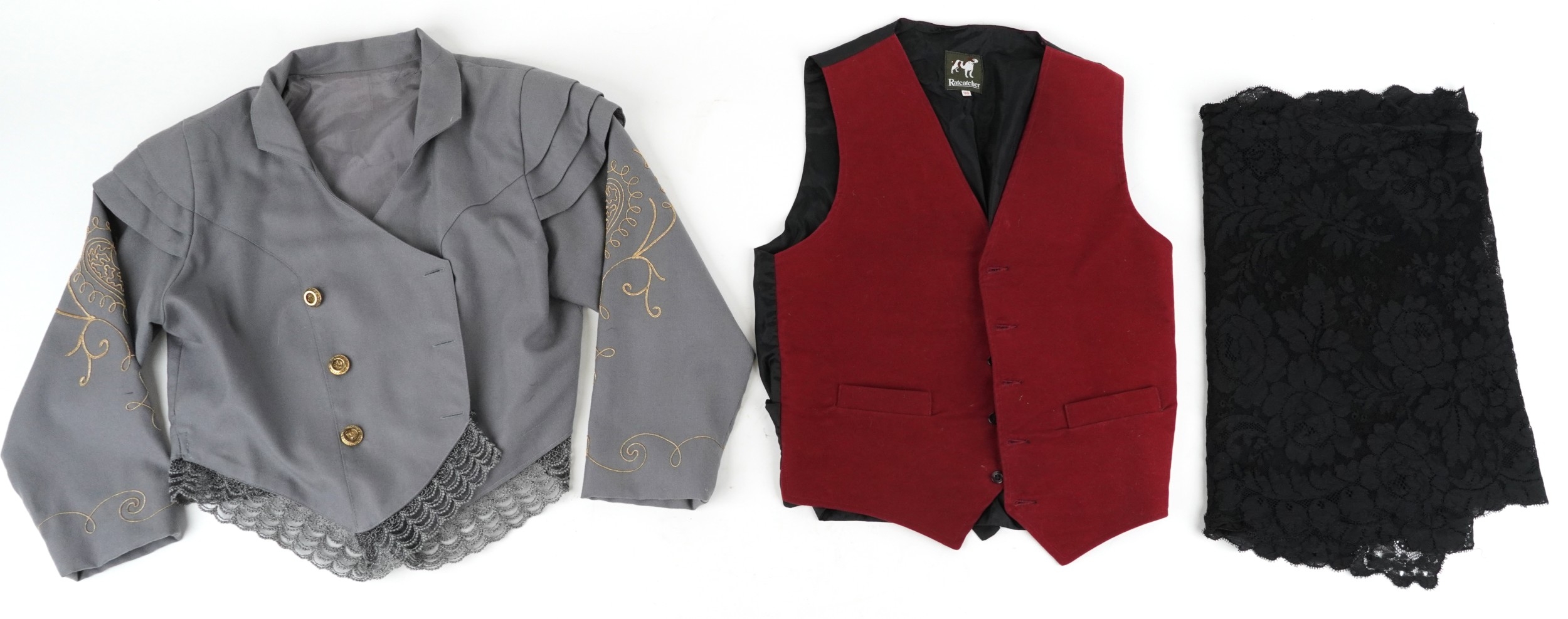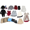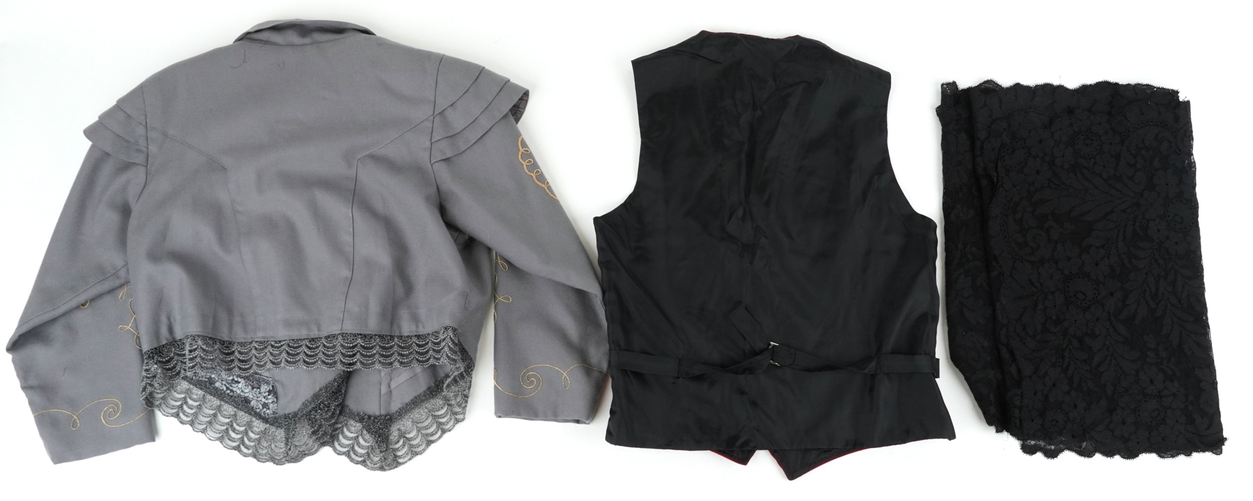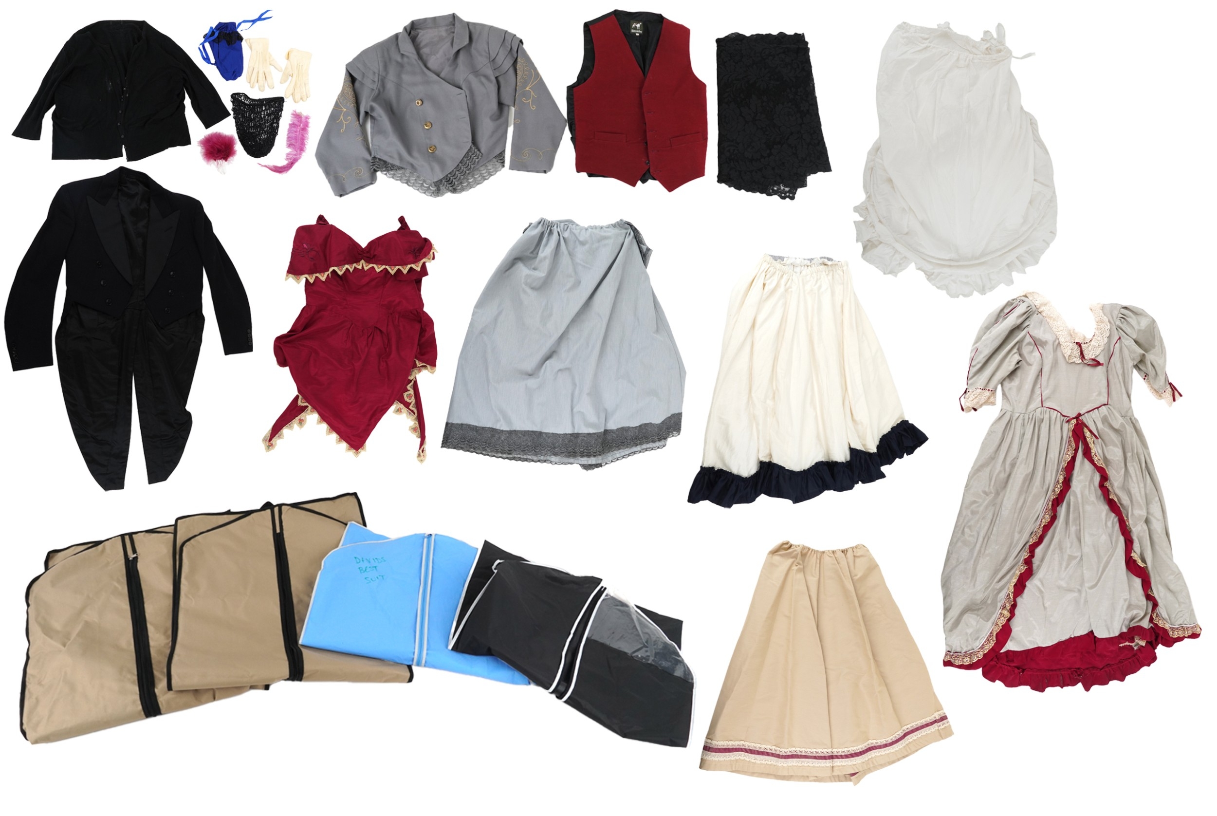 A collection of theatre costumes including a boned petticoat skirt, a tail coat, ladies dresses and accessories.