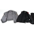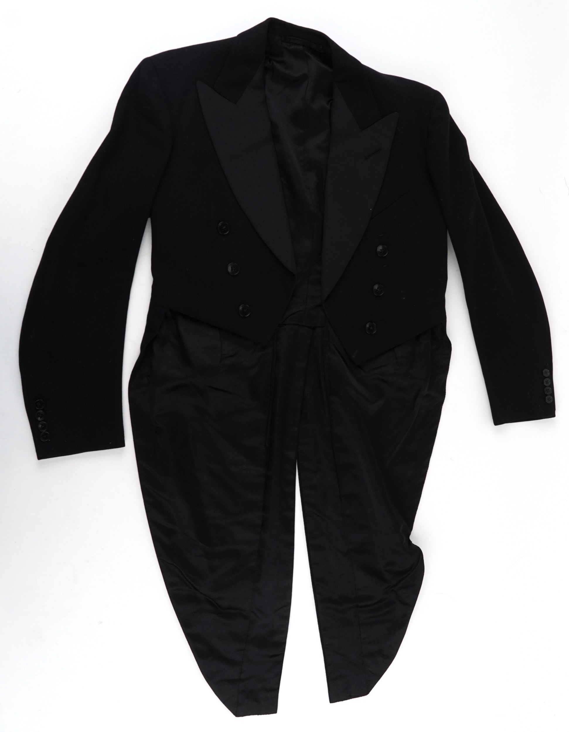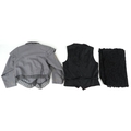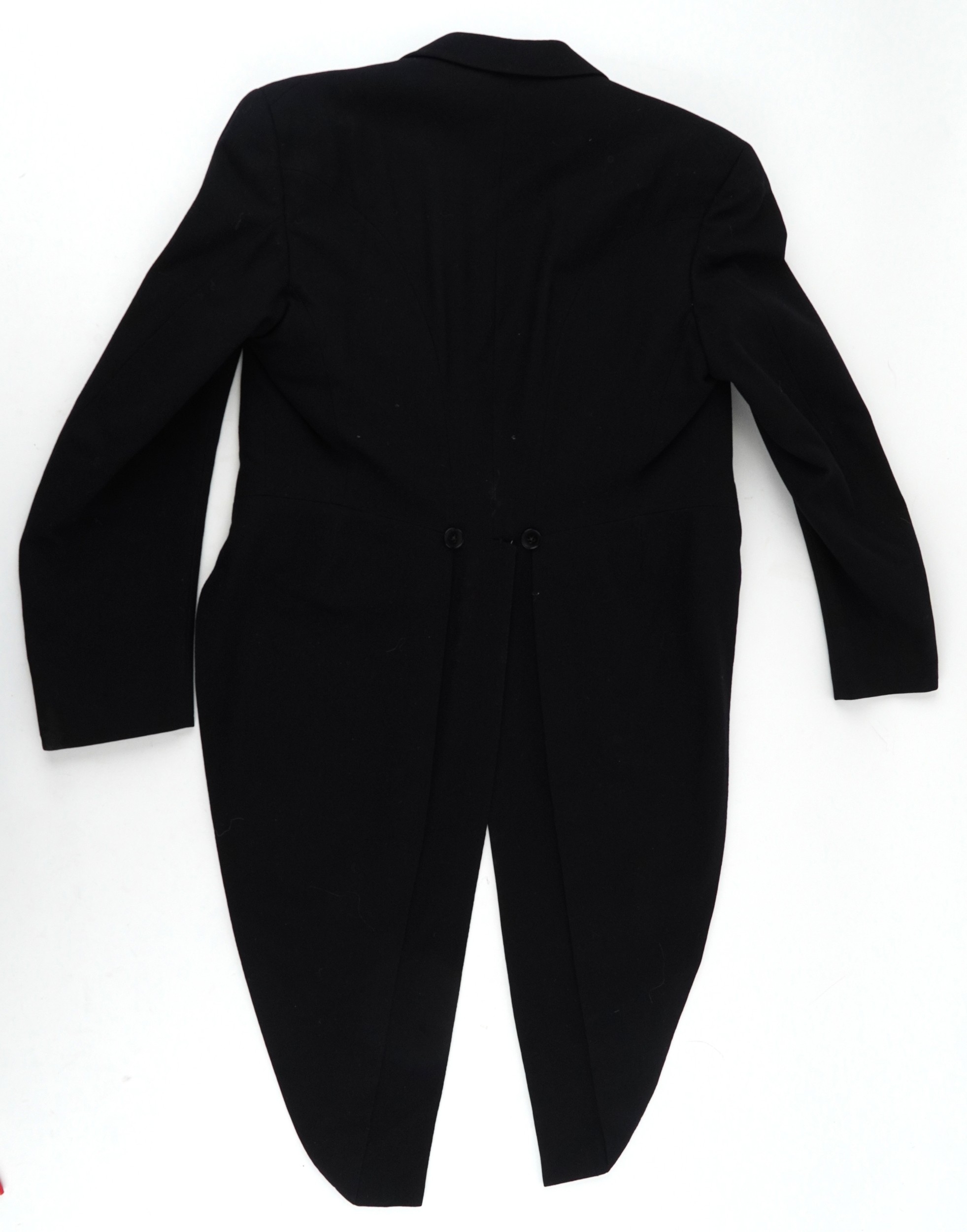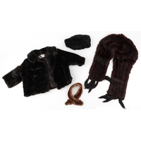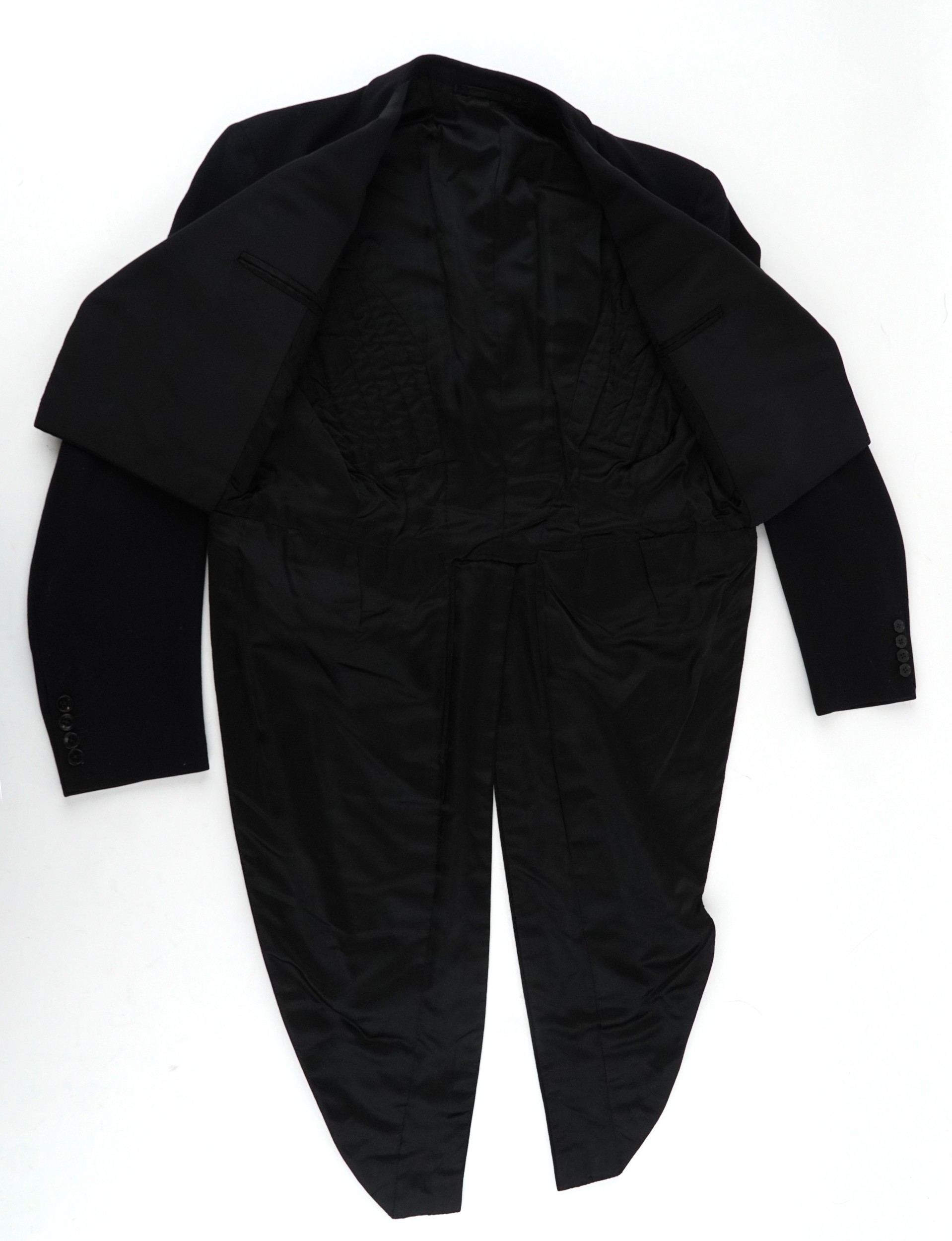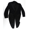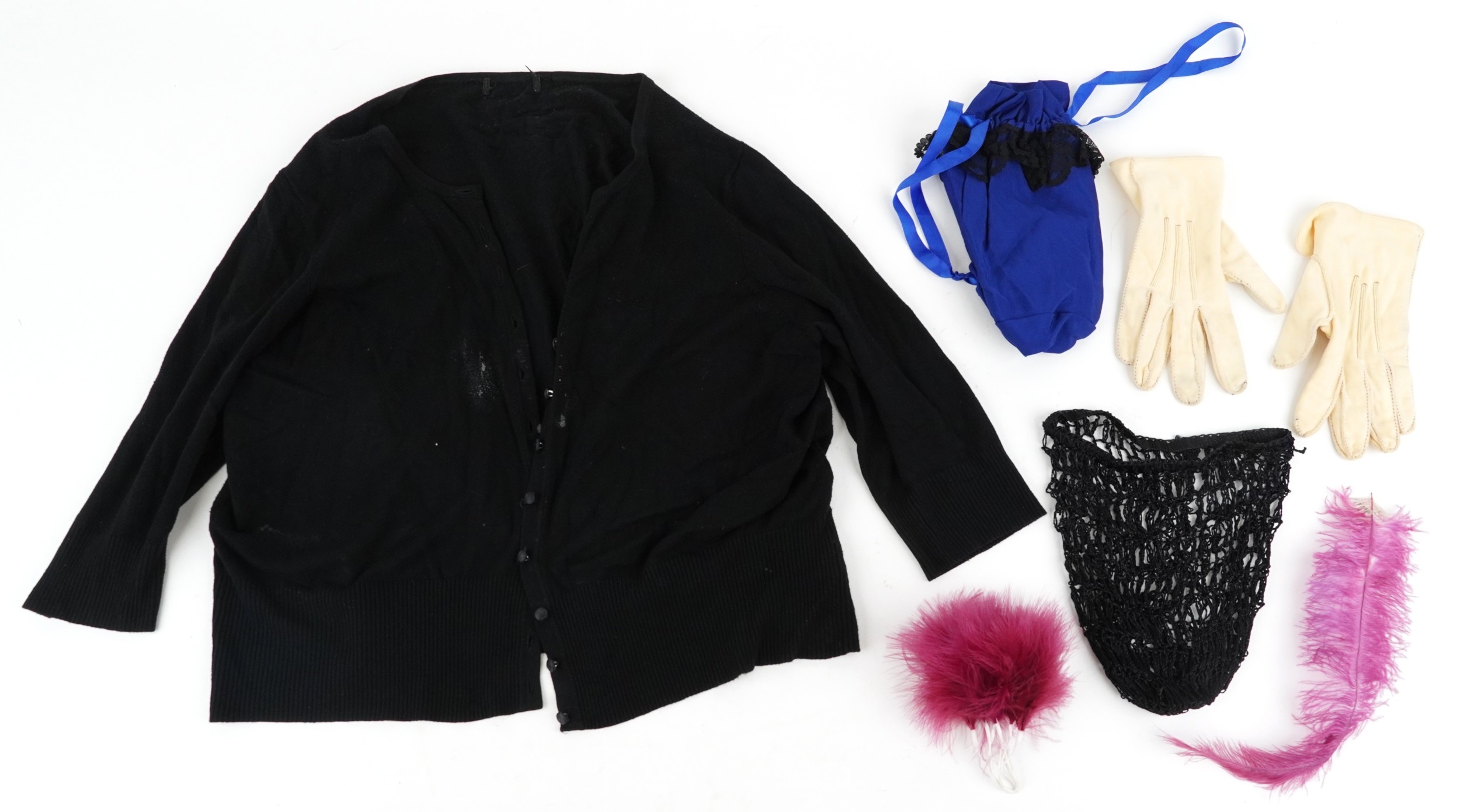 A collection of theatre costumes including a boned petticoat skirt, a tail coat, ladies dresses and accessories.