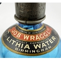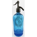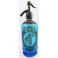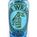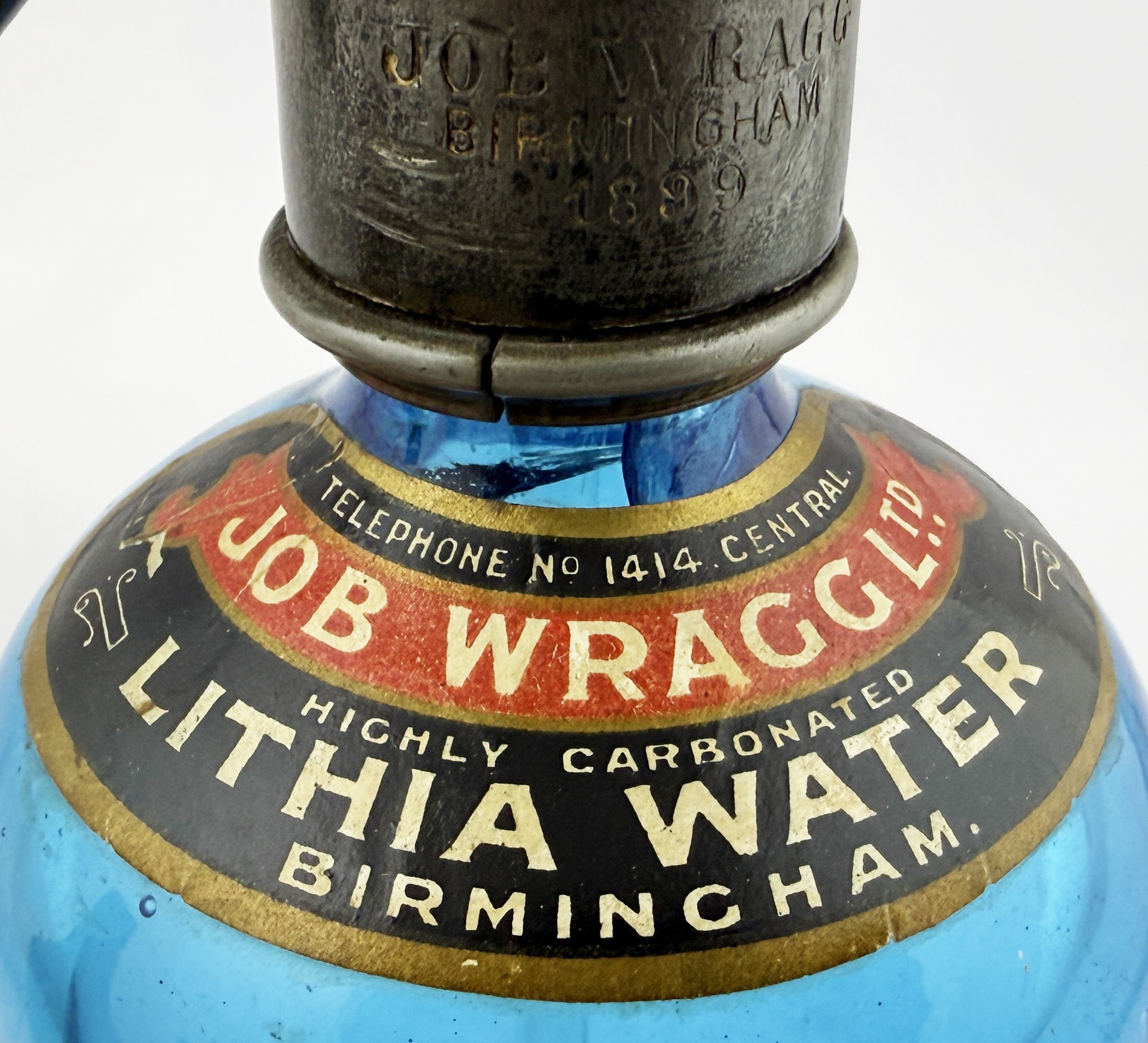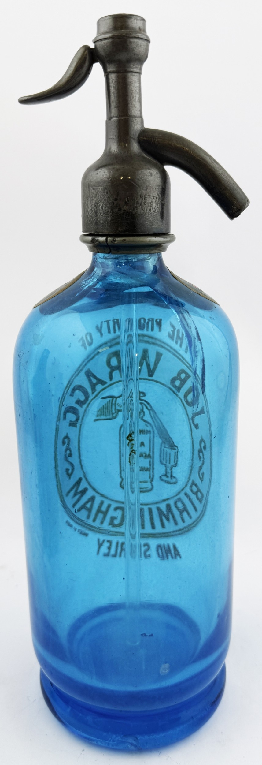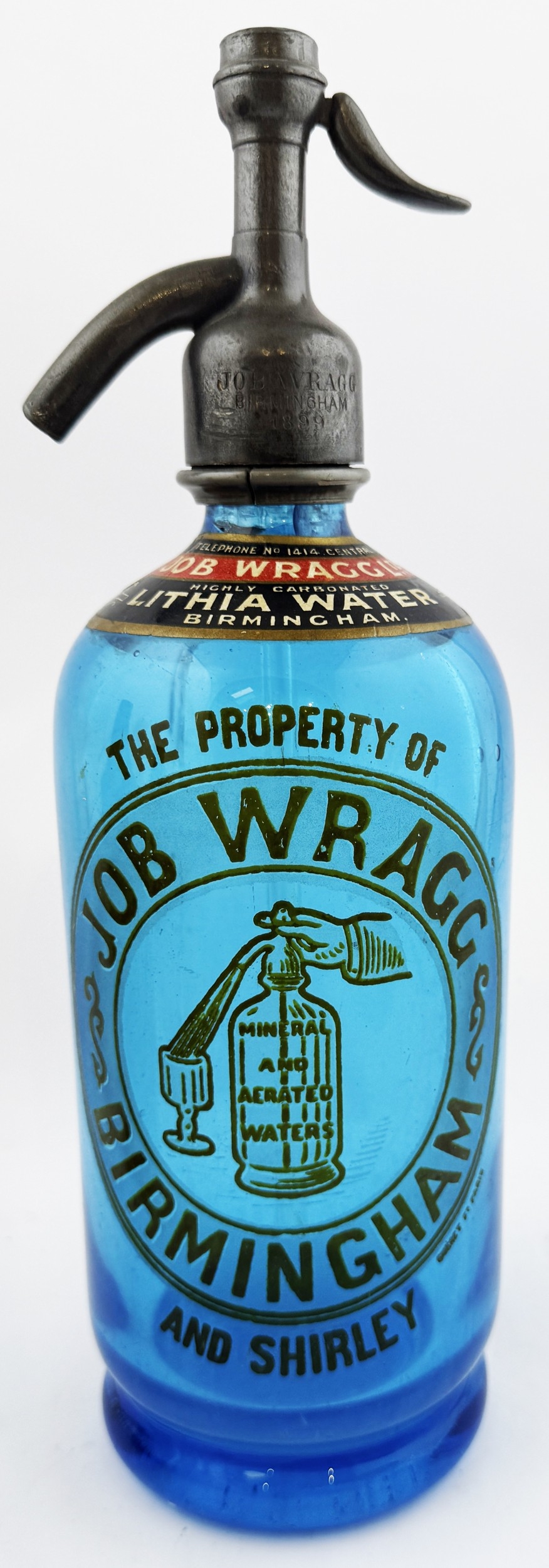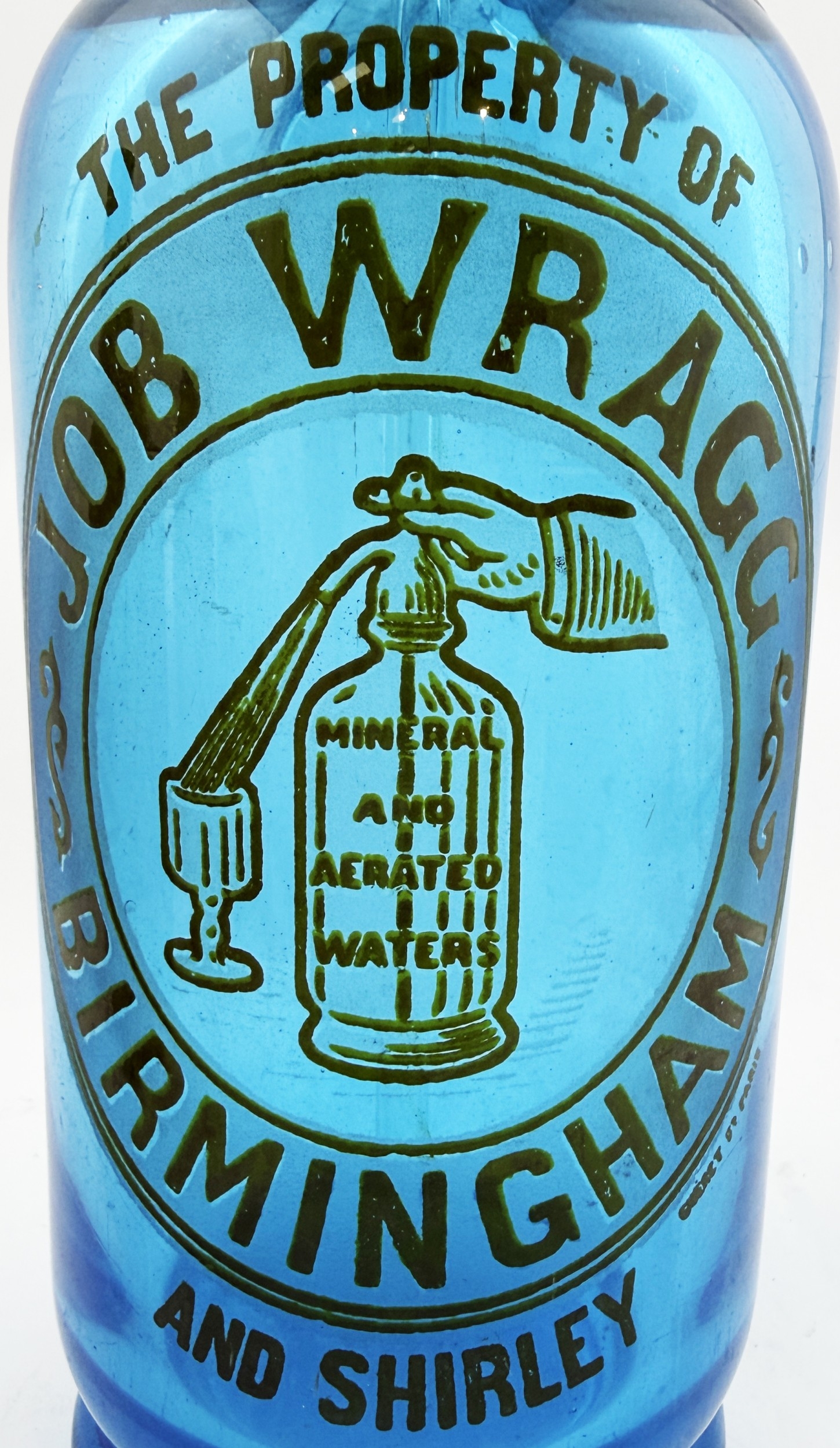 BIRMINGHAM SODA SYPHON. 11.75ins. Electric blue soda syphon JOB WRAGG/ BIRMINGHAM? AND SHIRLEY.Pict. t.m. of hand squirting soda into glass. Original marked top & shoulder label. Neck cracks & a few fish eyes to base area