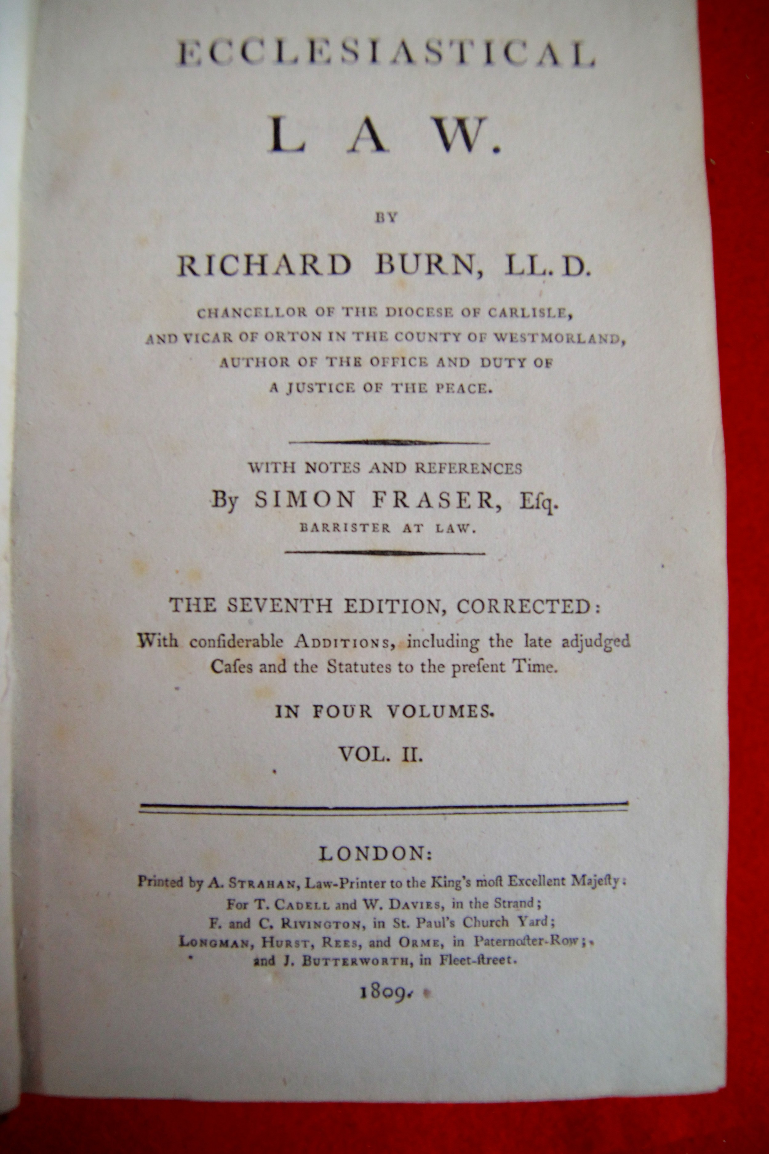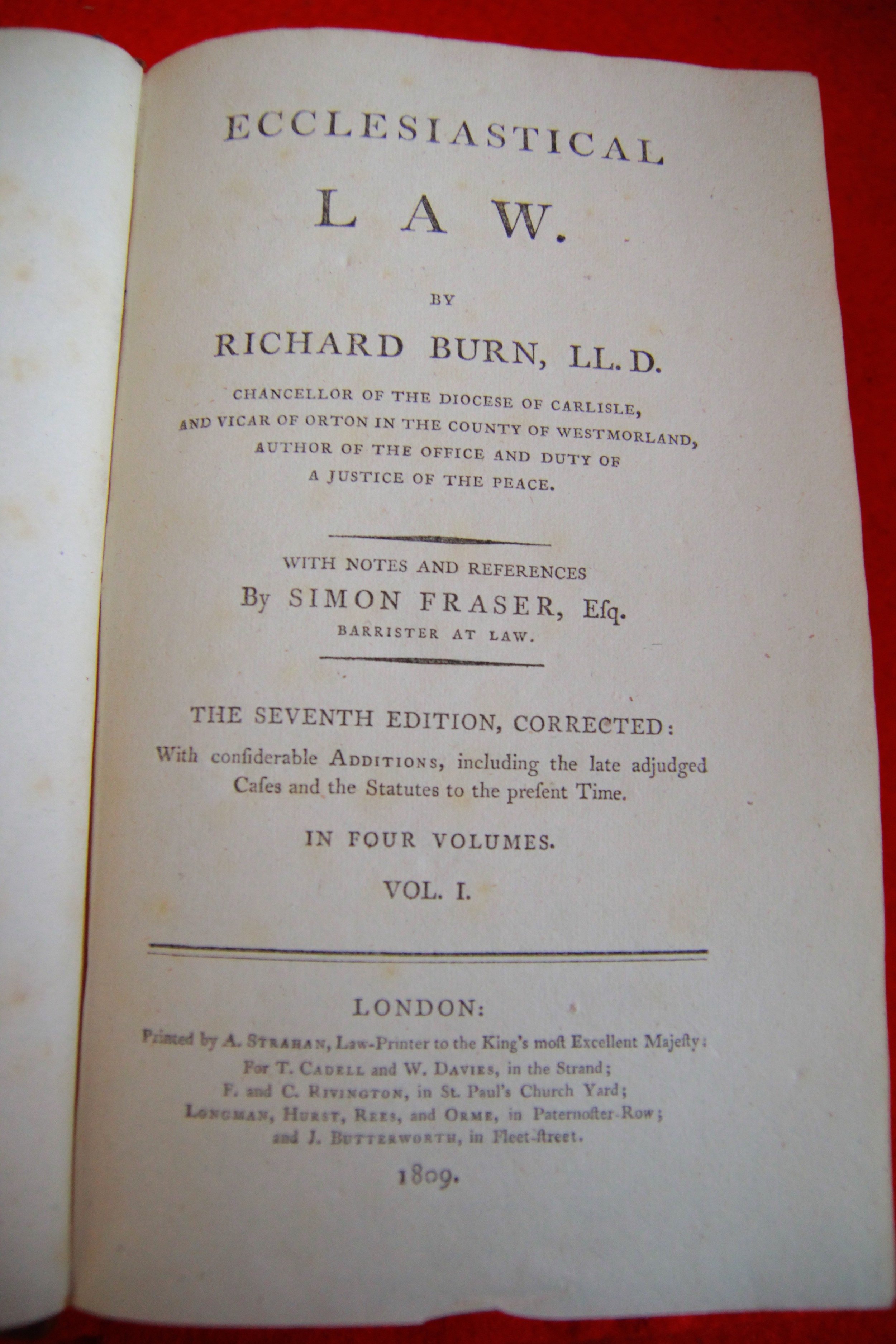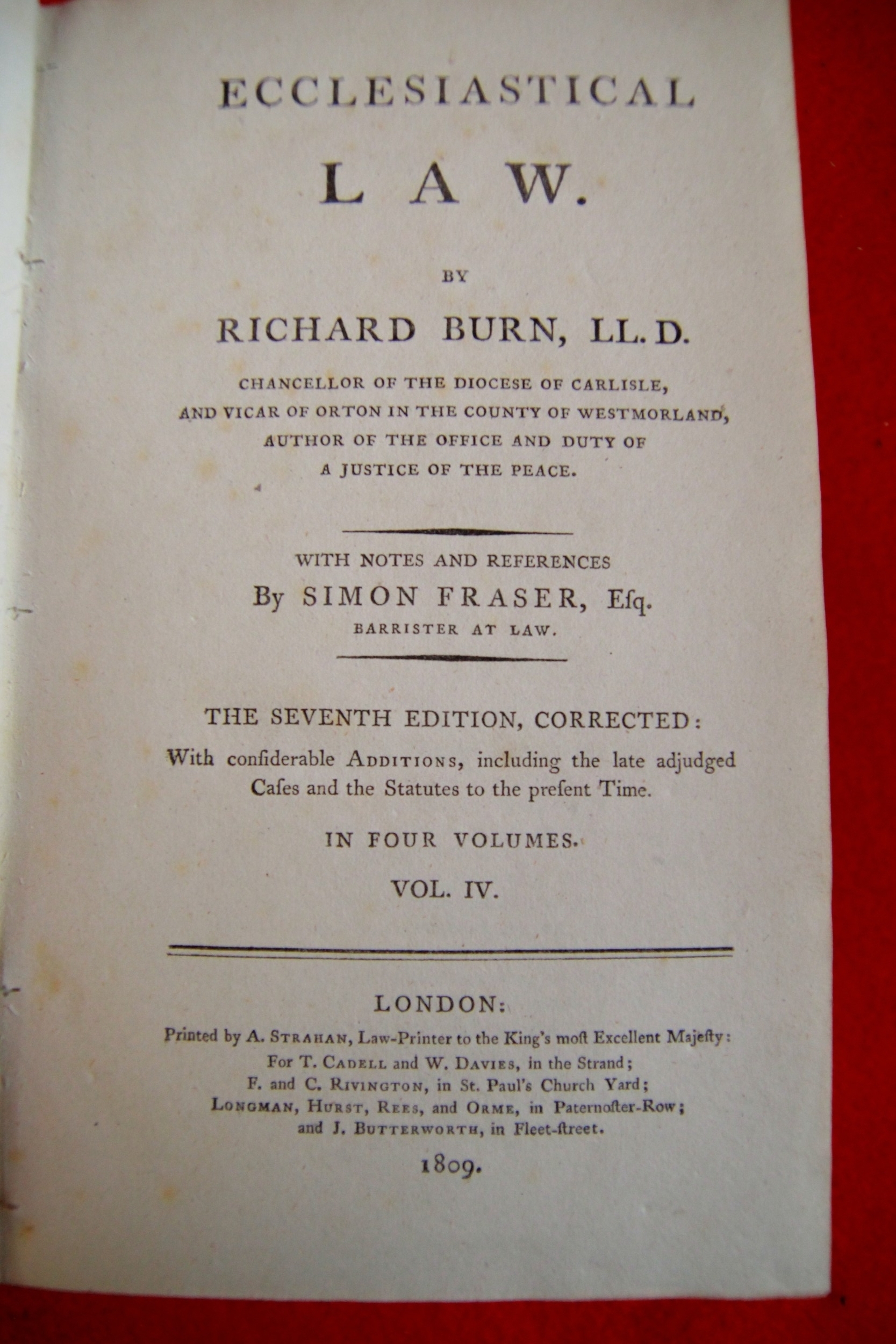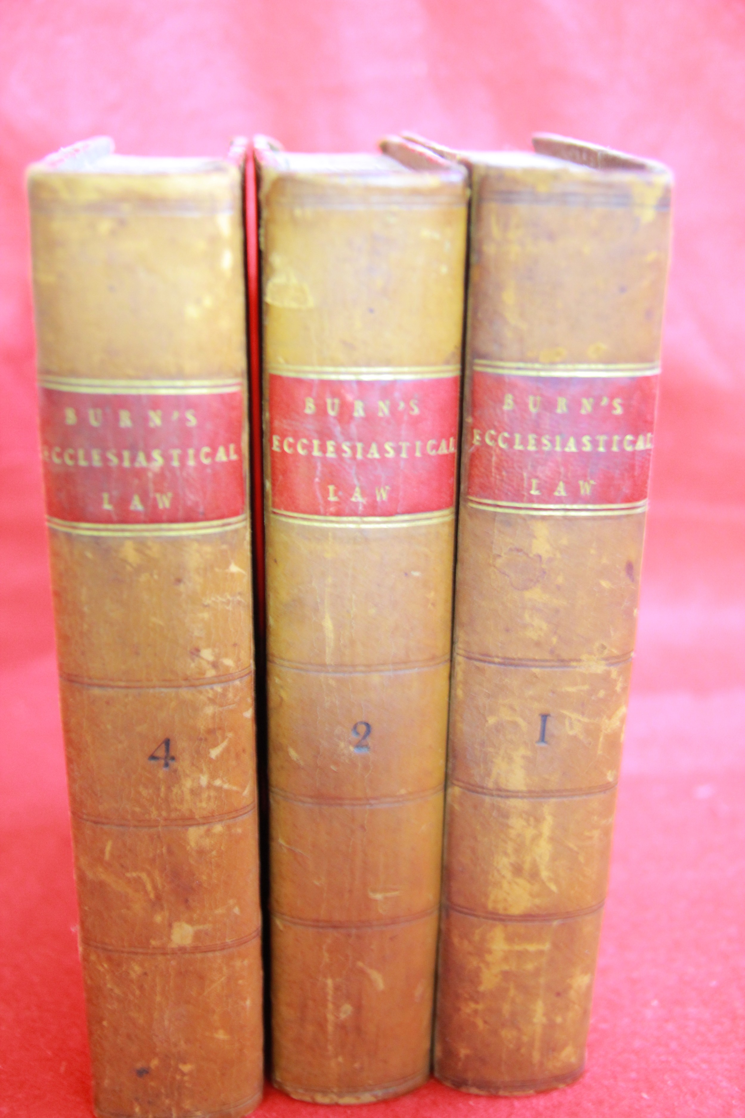 Burn LLD, Richard: Ecclesiastical Law, 7th Ed, London 1809, Vols 1, 2 & 4 only. Leather bound, all in good order, spines good, bindings tight, minimal foxing.