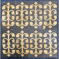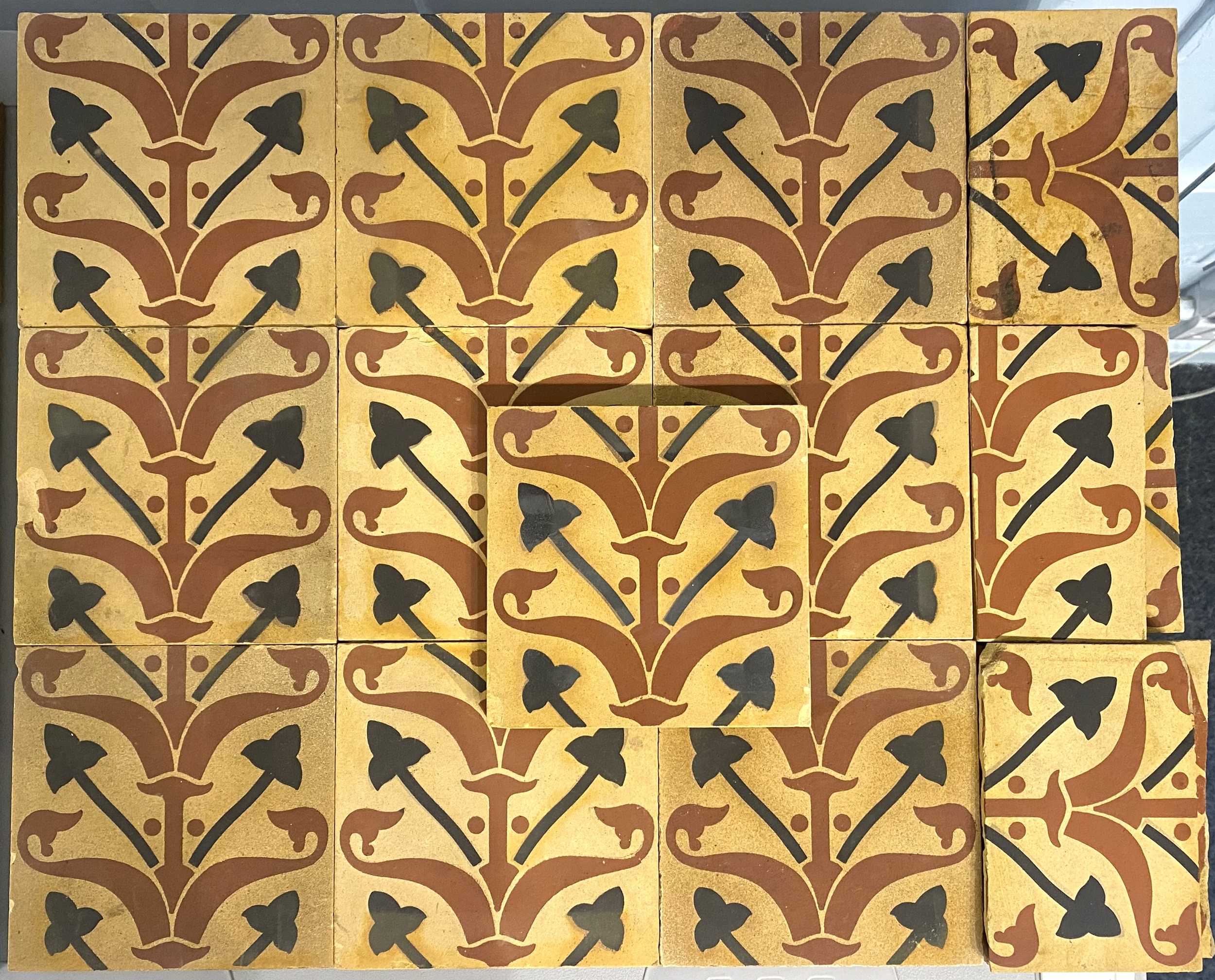 Nineteen Malkin & Co Burslem encaustic tiles and six part sections, with repeating foliate design in terracotta and black on buff ground, 15.2cm by 15.5cm