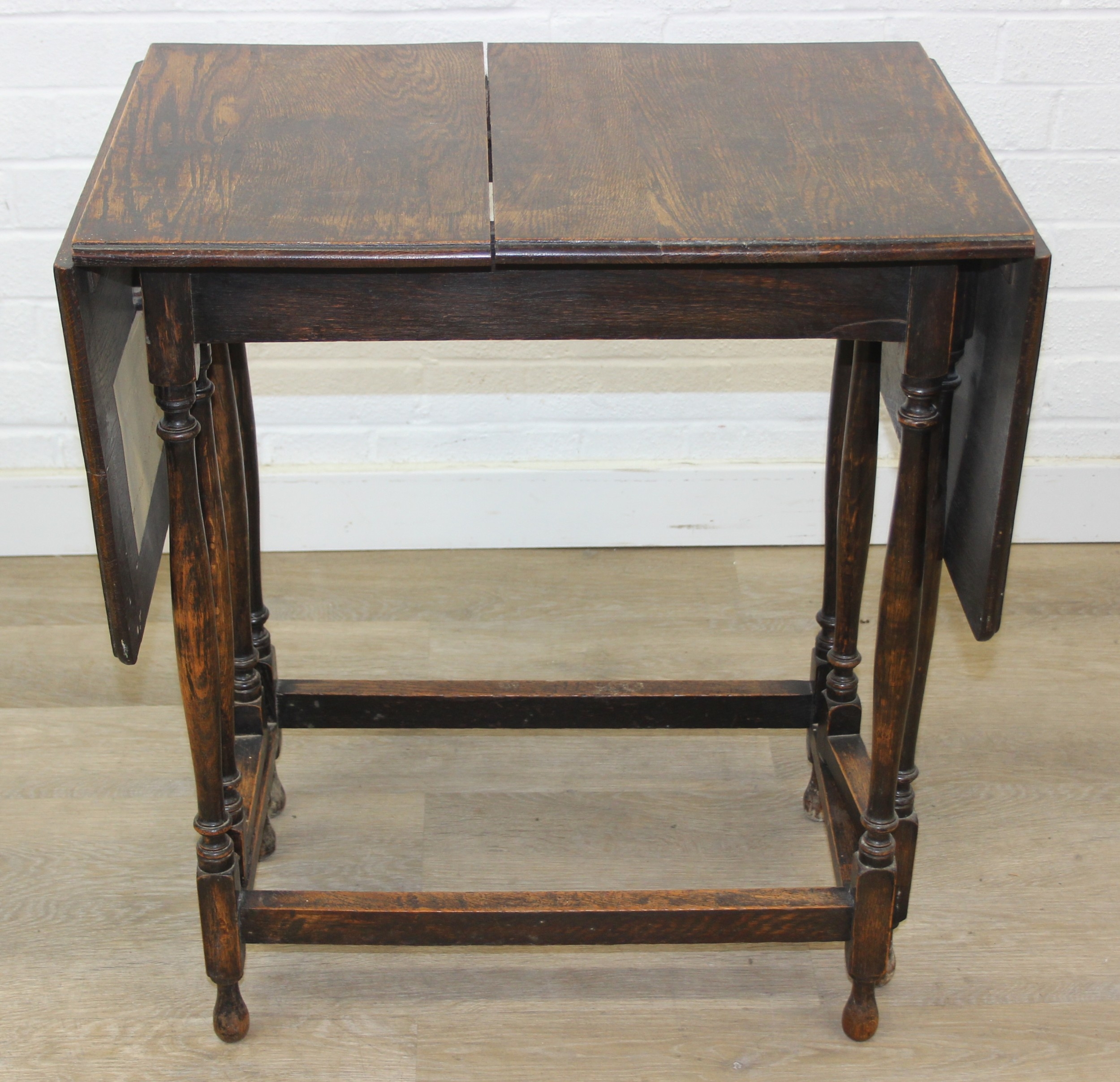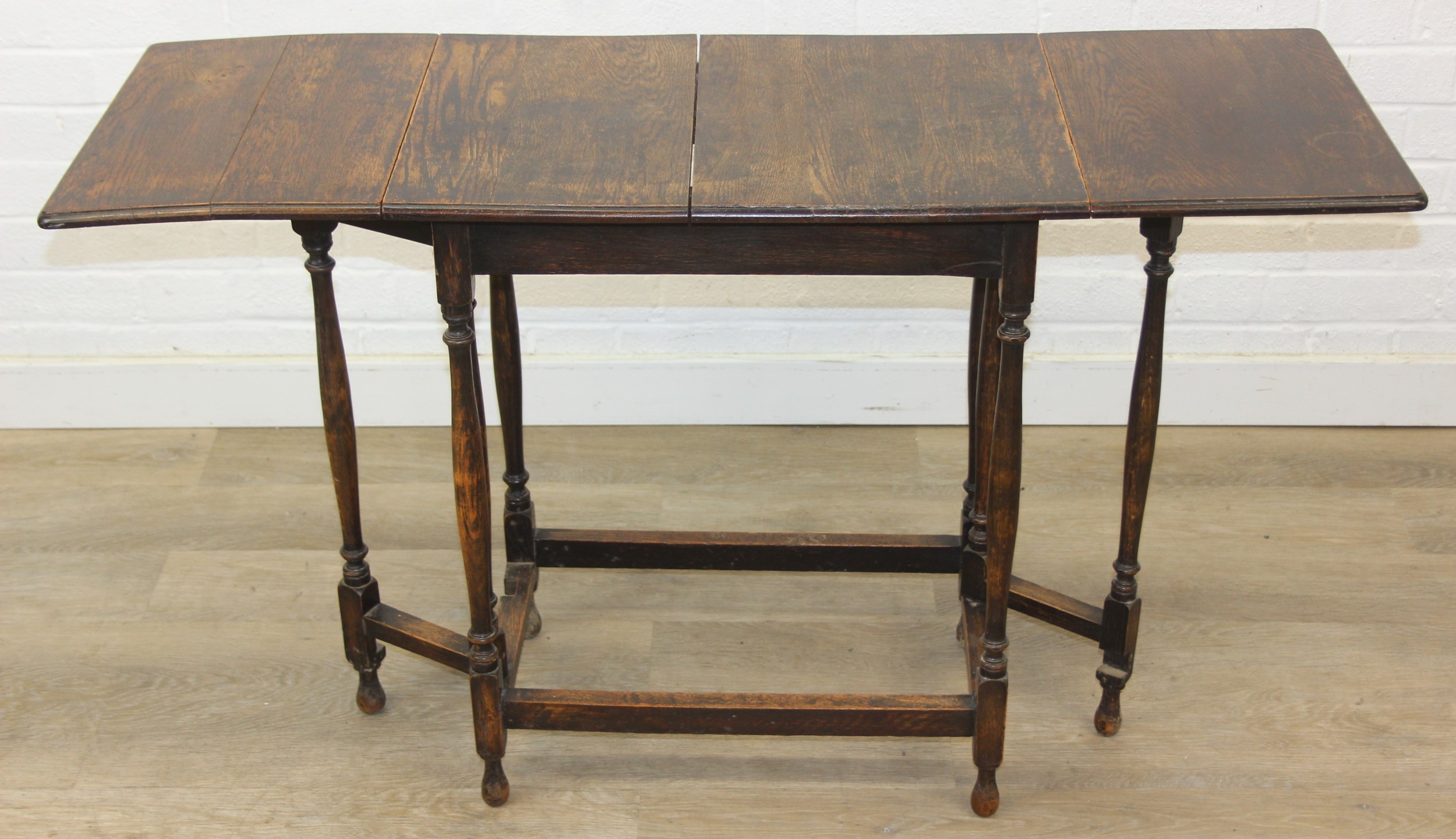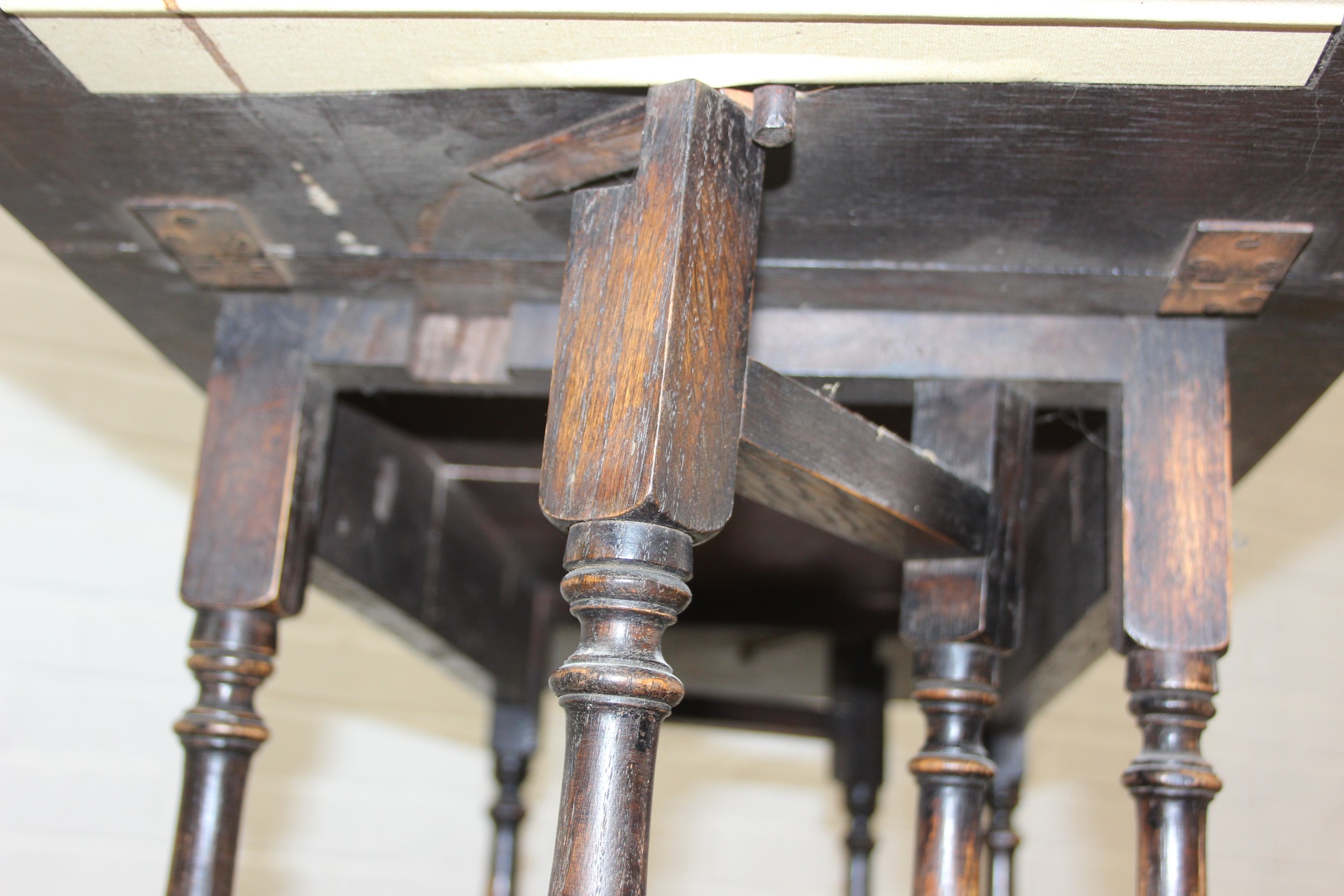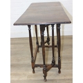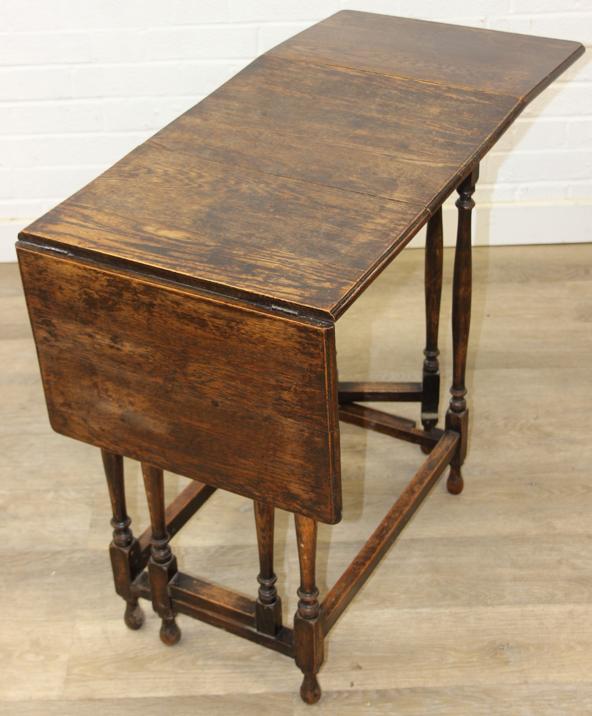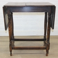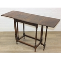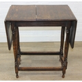 An early 20th century oak drop leaf table of unusual design with turned supports, 63cm (opening to 123cm) x 43cm x 69cm