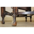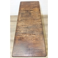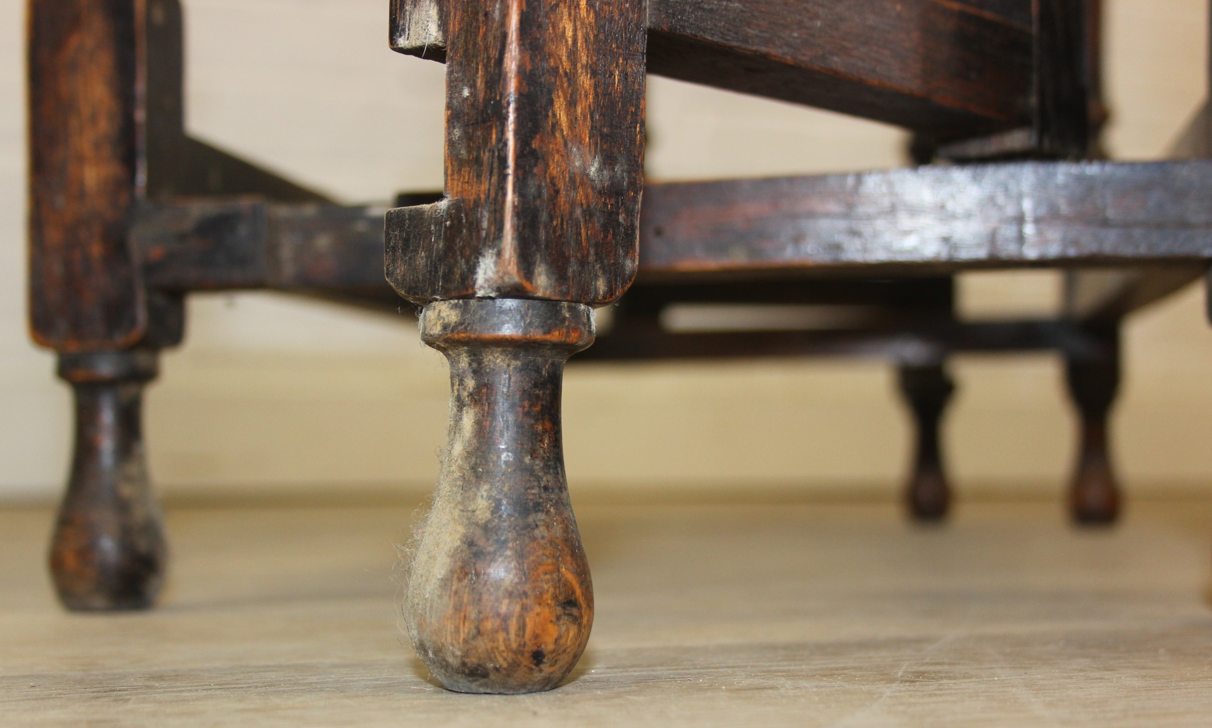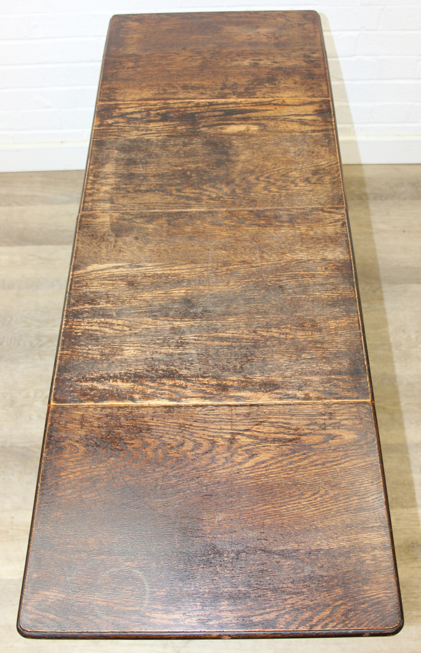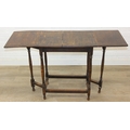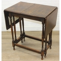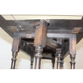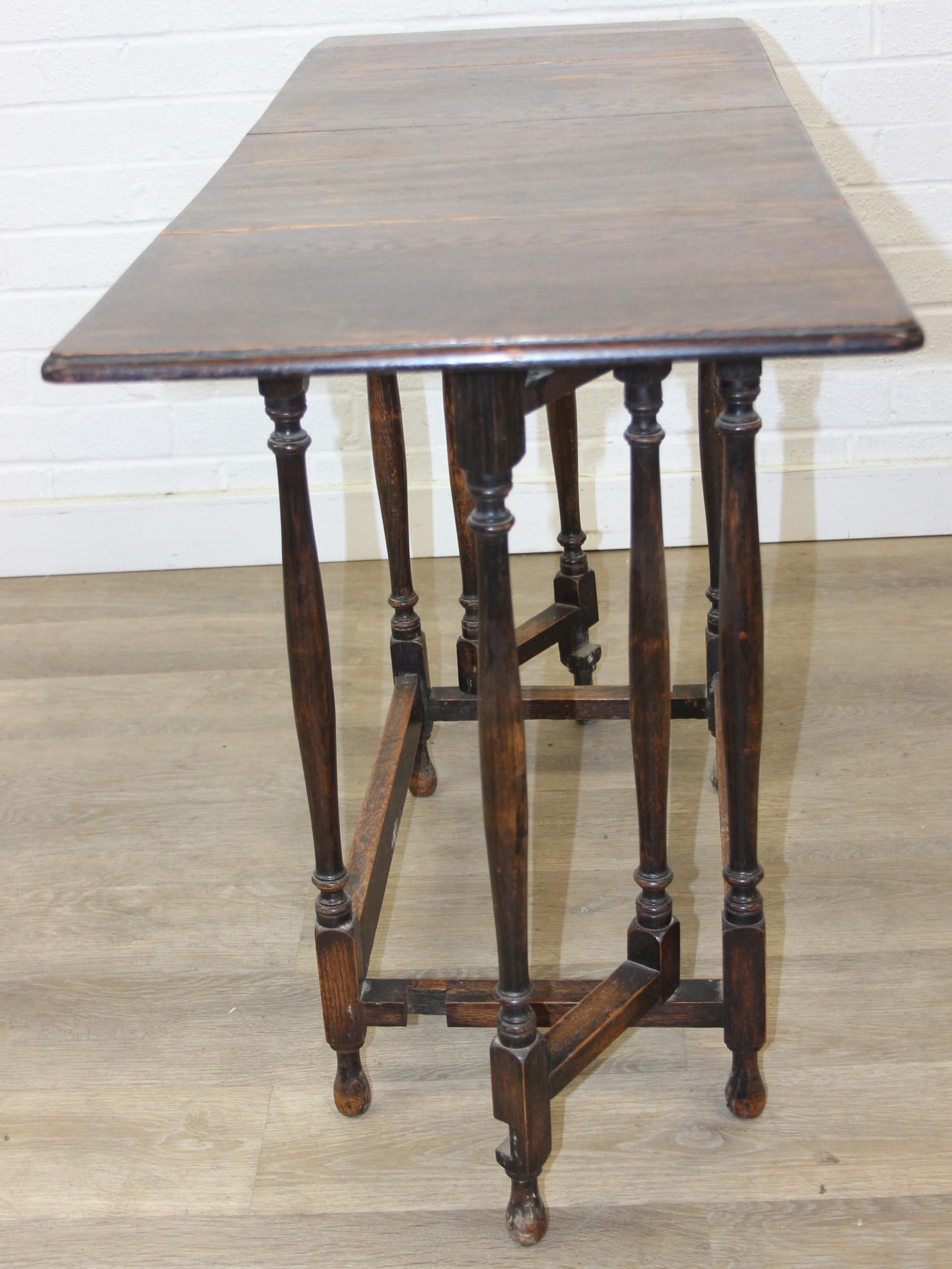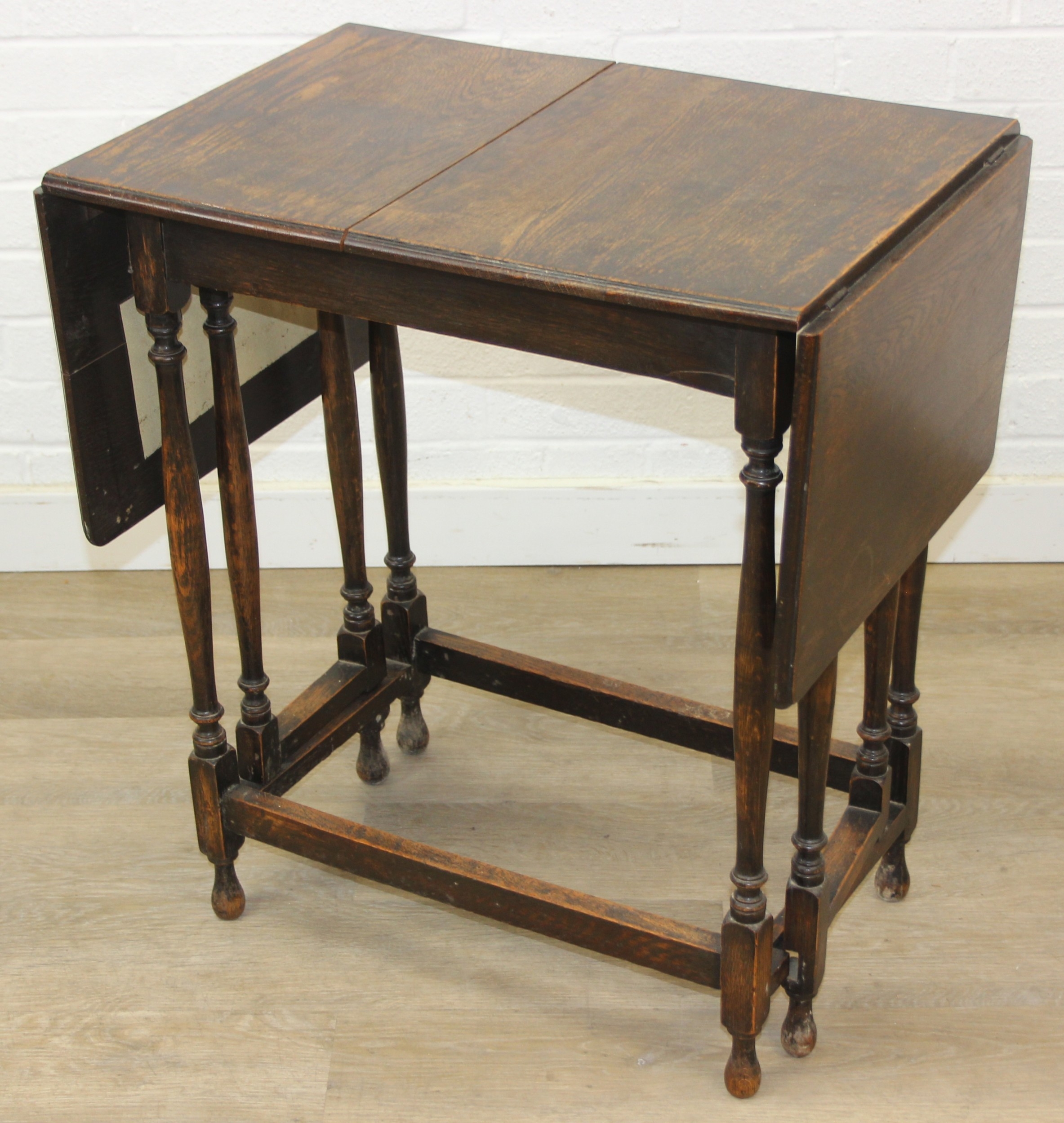 An early 20th century oak drop leaf table of unusual design with turned supports, 63cm (opening to 123cm) x 43cm x 69cm