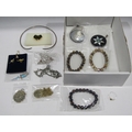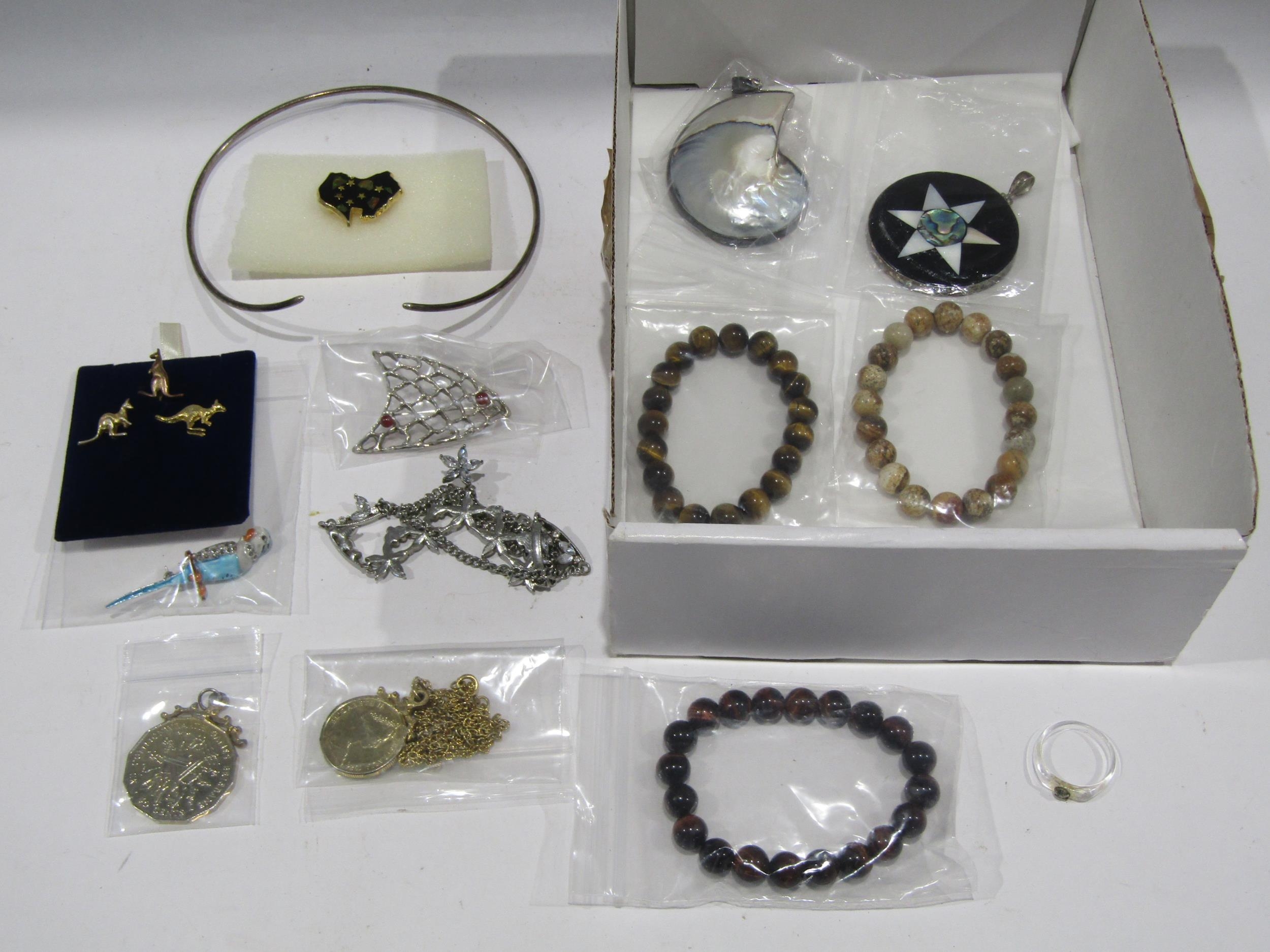 A box of bijouterie to include choker with shell pendant, stamped 925, brooches, Kangaroo stick pins, expanding hardstone bracelets etc.