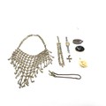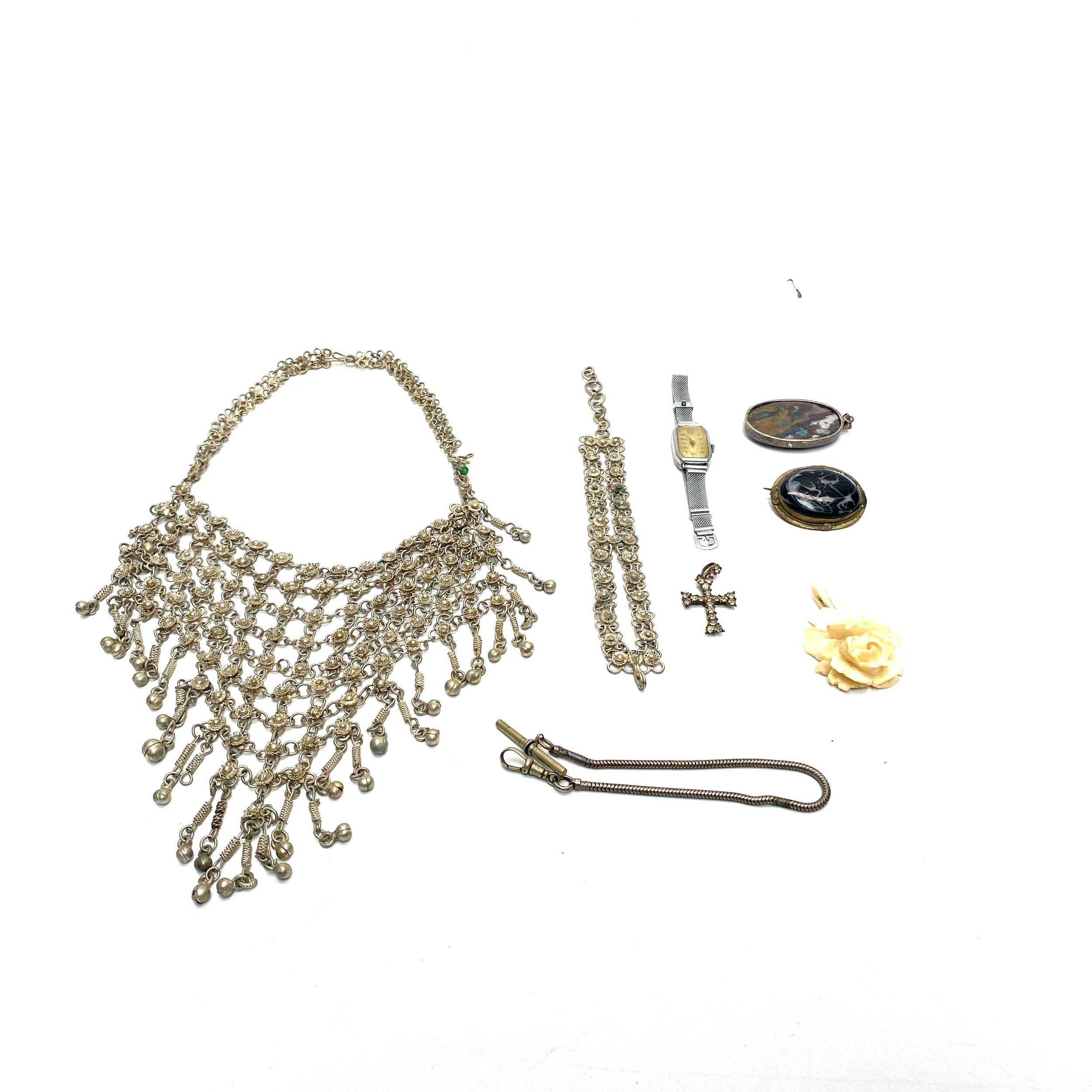 White metal french art deco style choker, vintage cross, agate stone pendant, moosachat semi precious stone, agate brooch, vintage watch, white metal watch chain and a pendant.