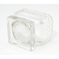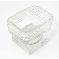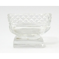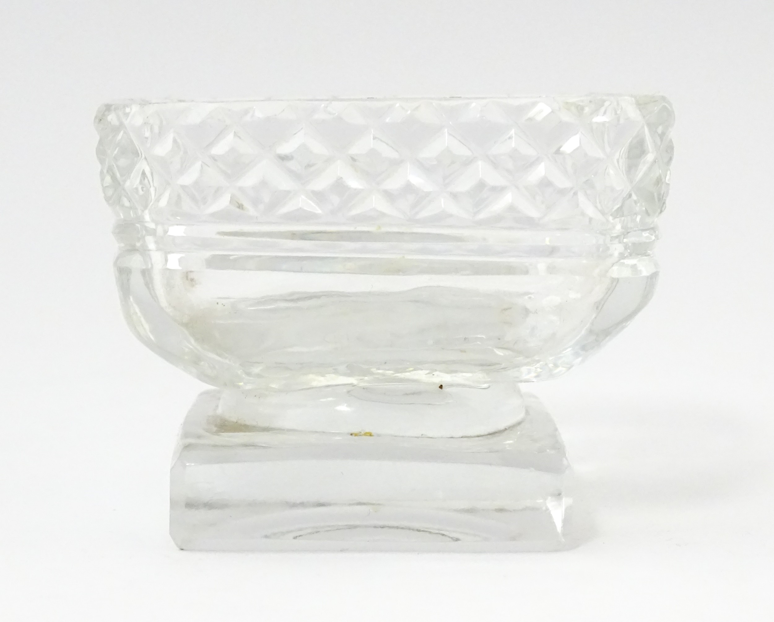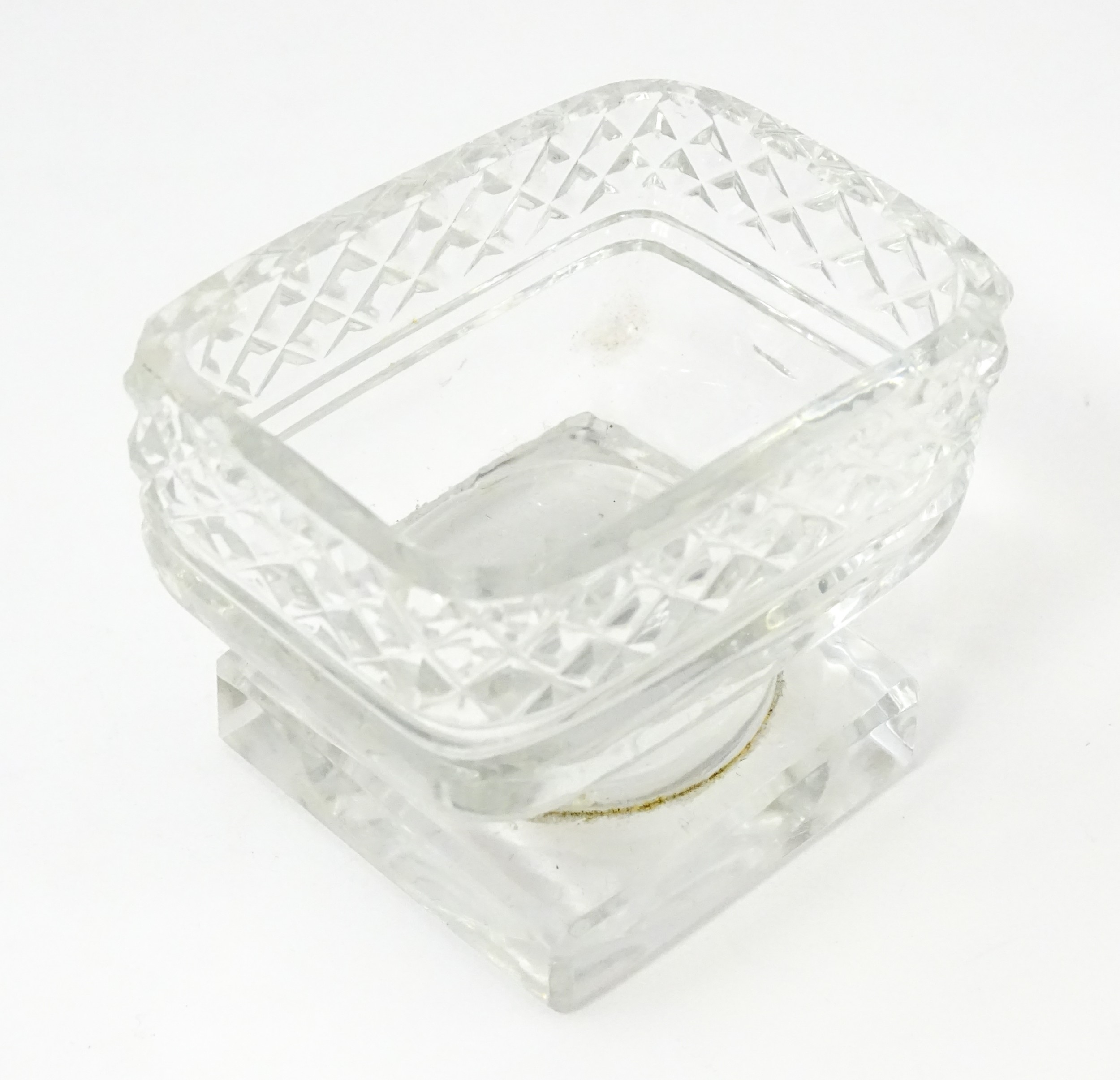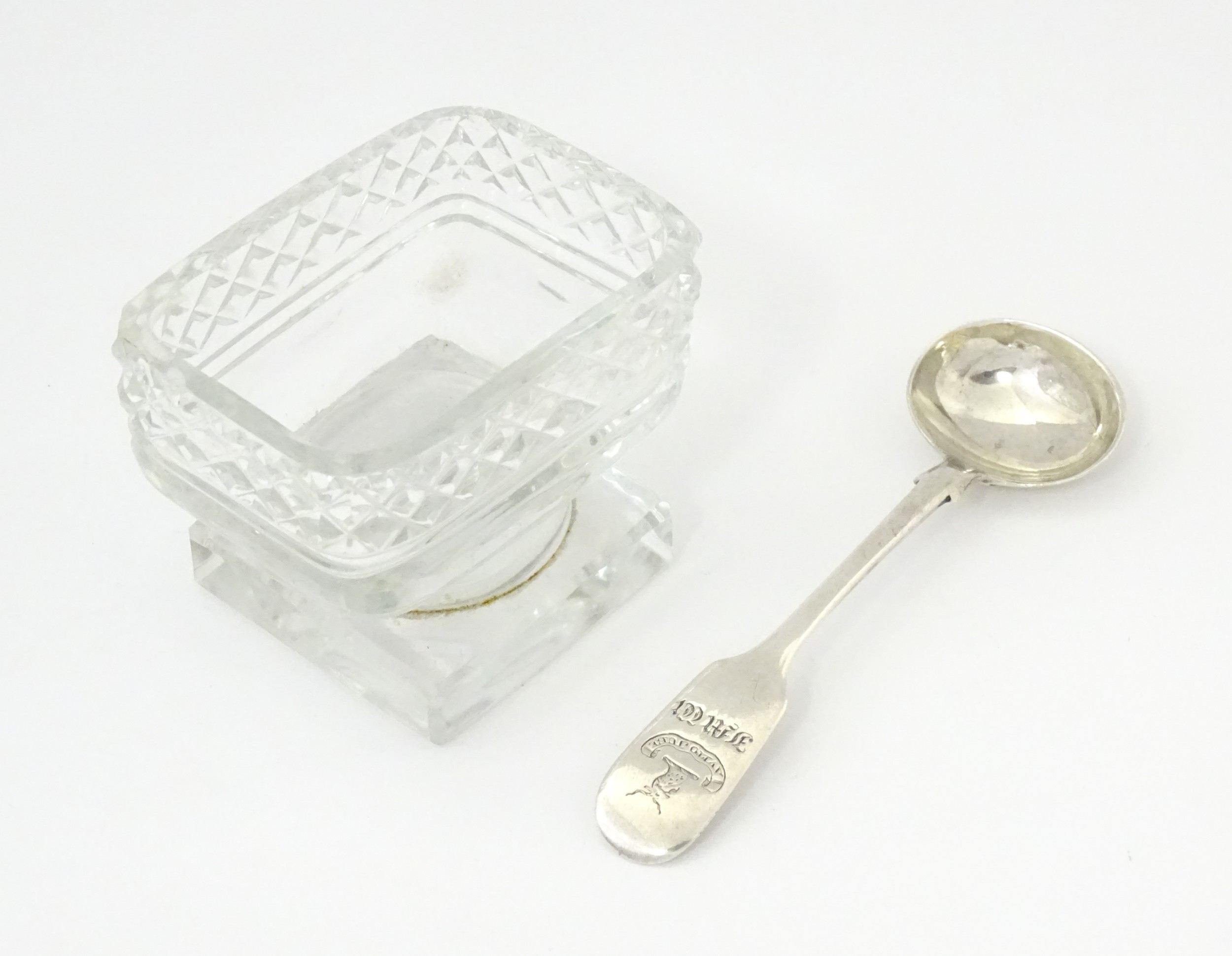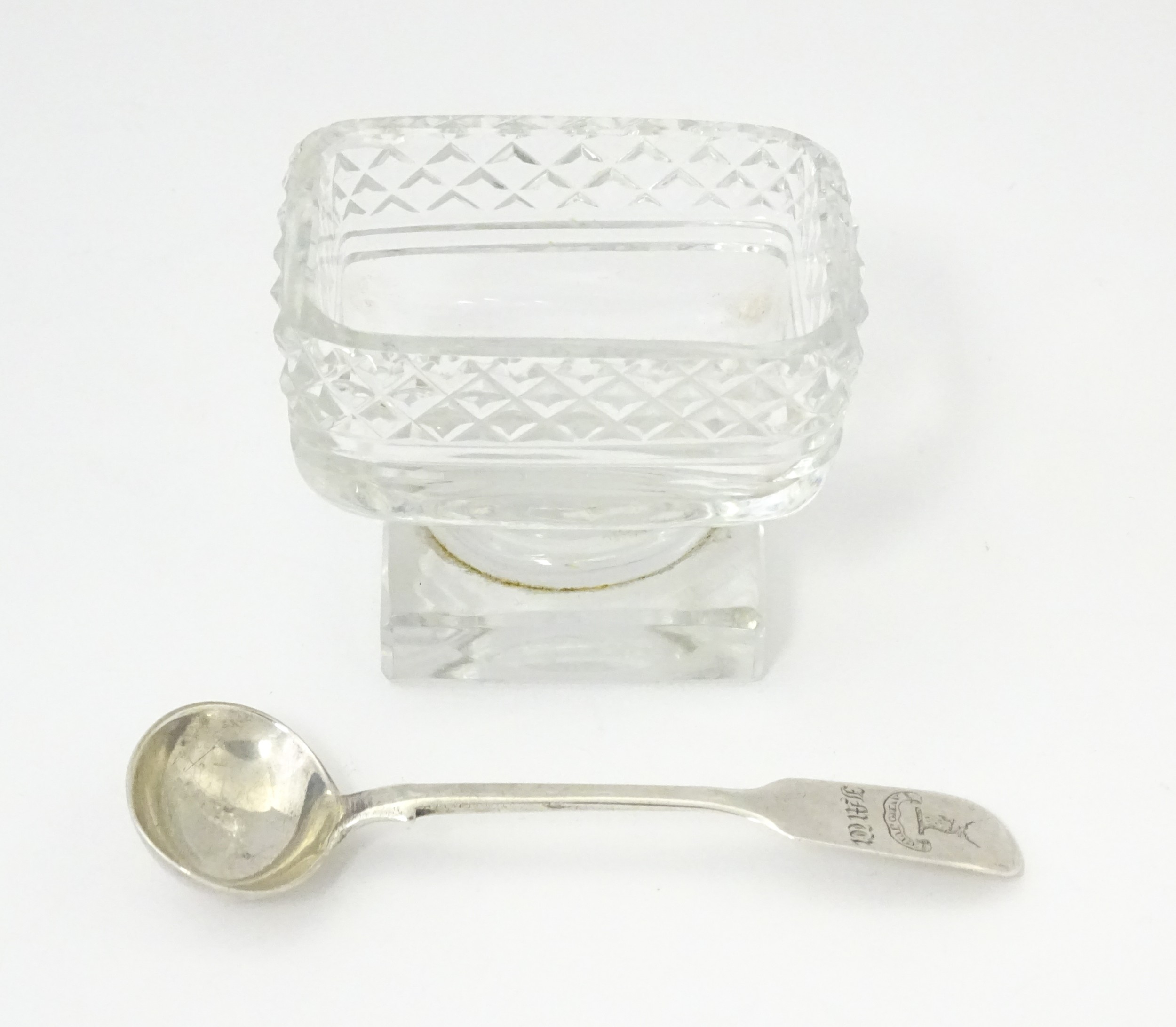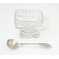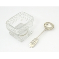 A glass pedestal table salt of oblong form. Together with a Victorian silver Fiddle pattern salt spoon hallmarked Exeter 1842, maker Williams Rawlings Sobey. Salt approx. 2" high (2)