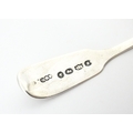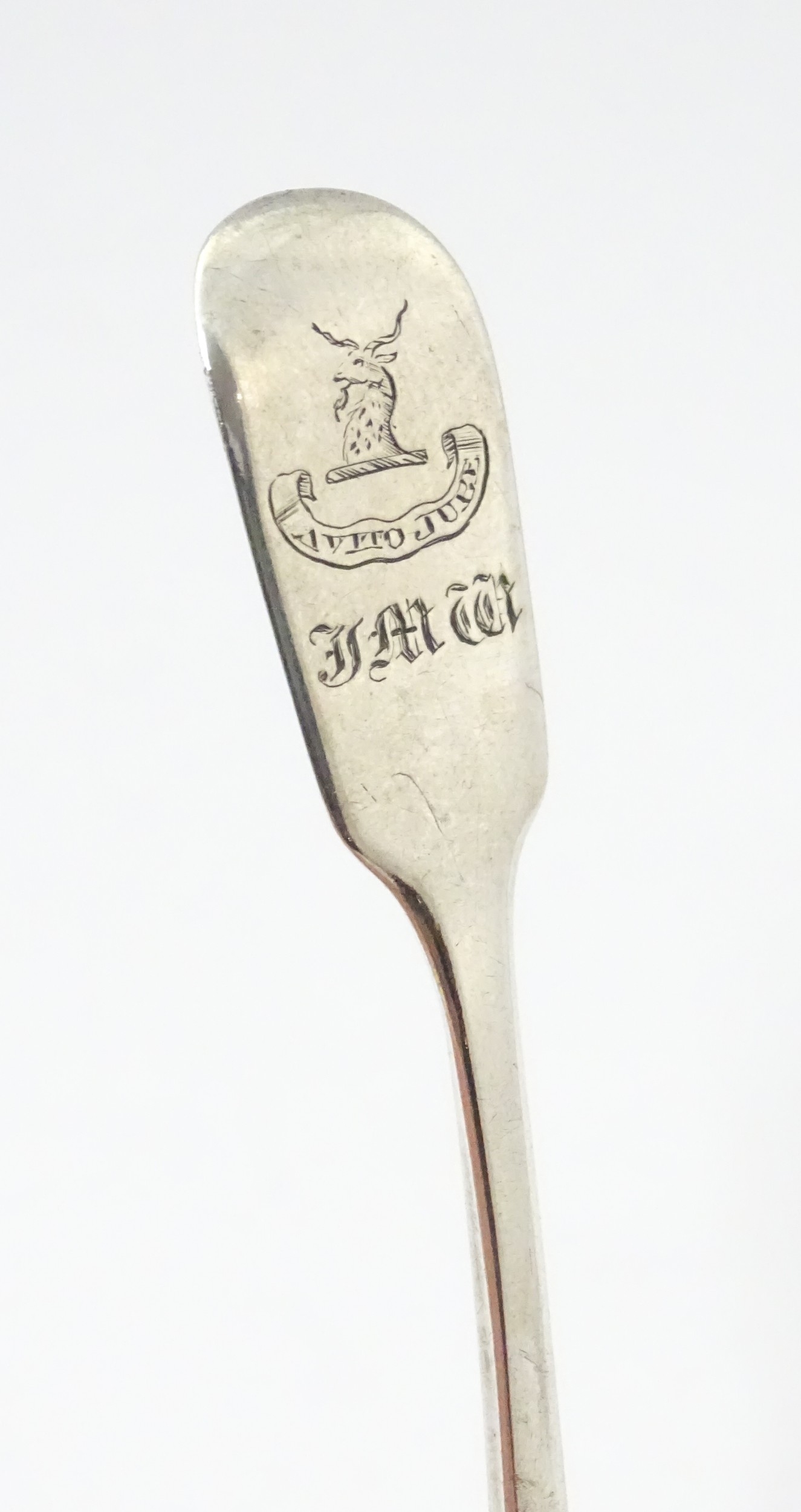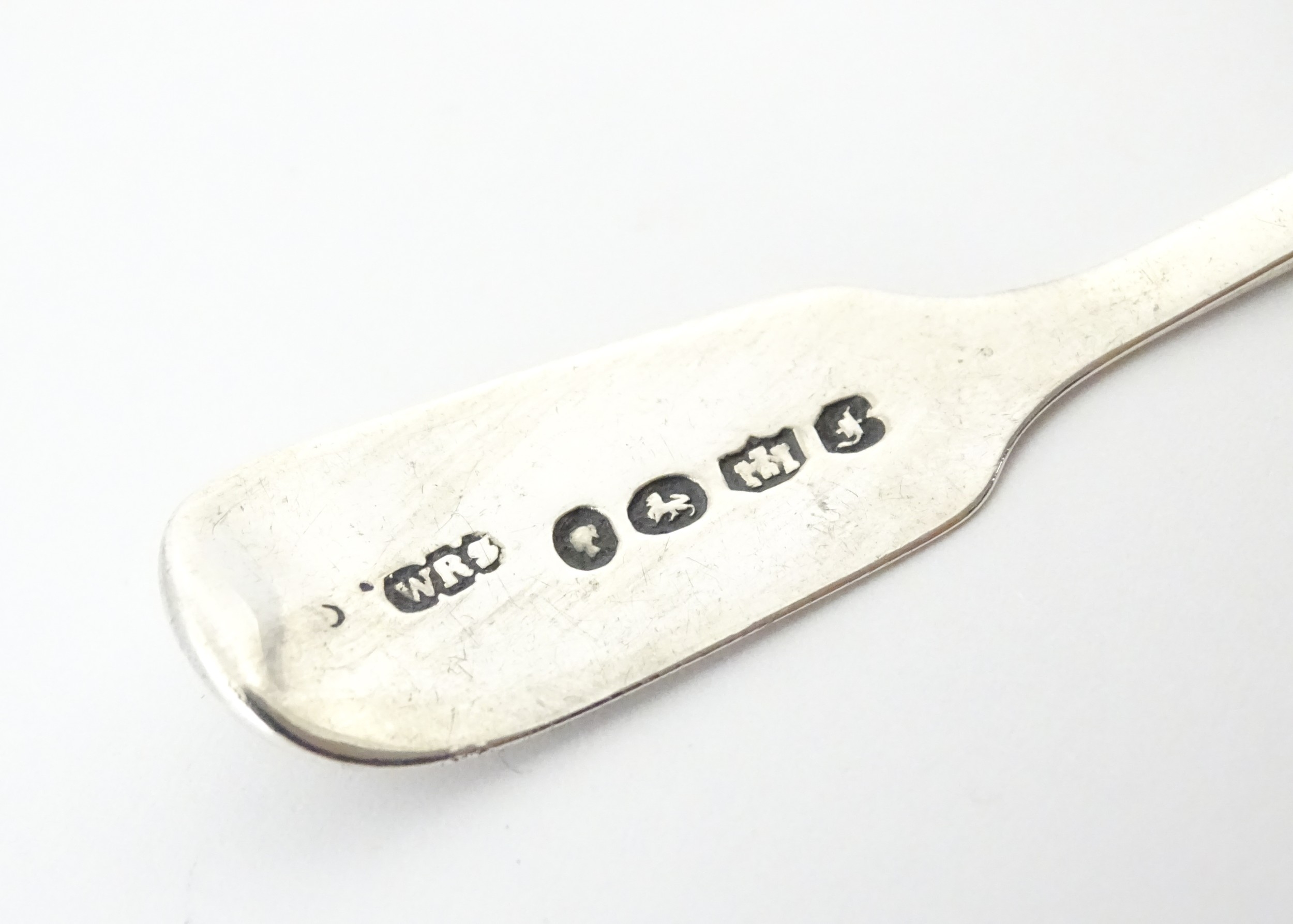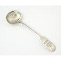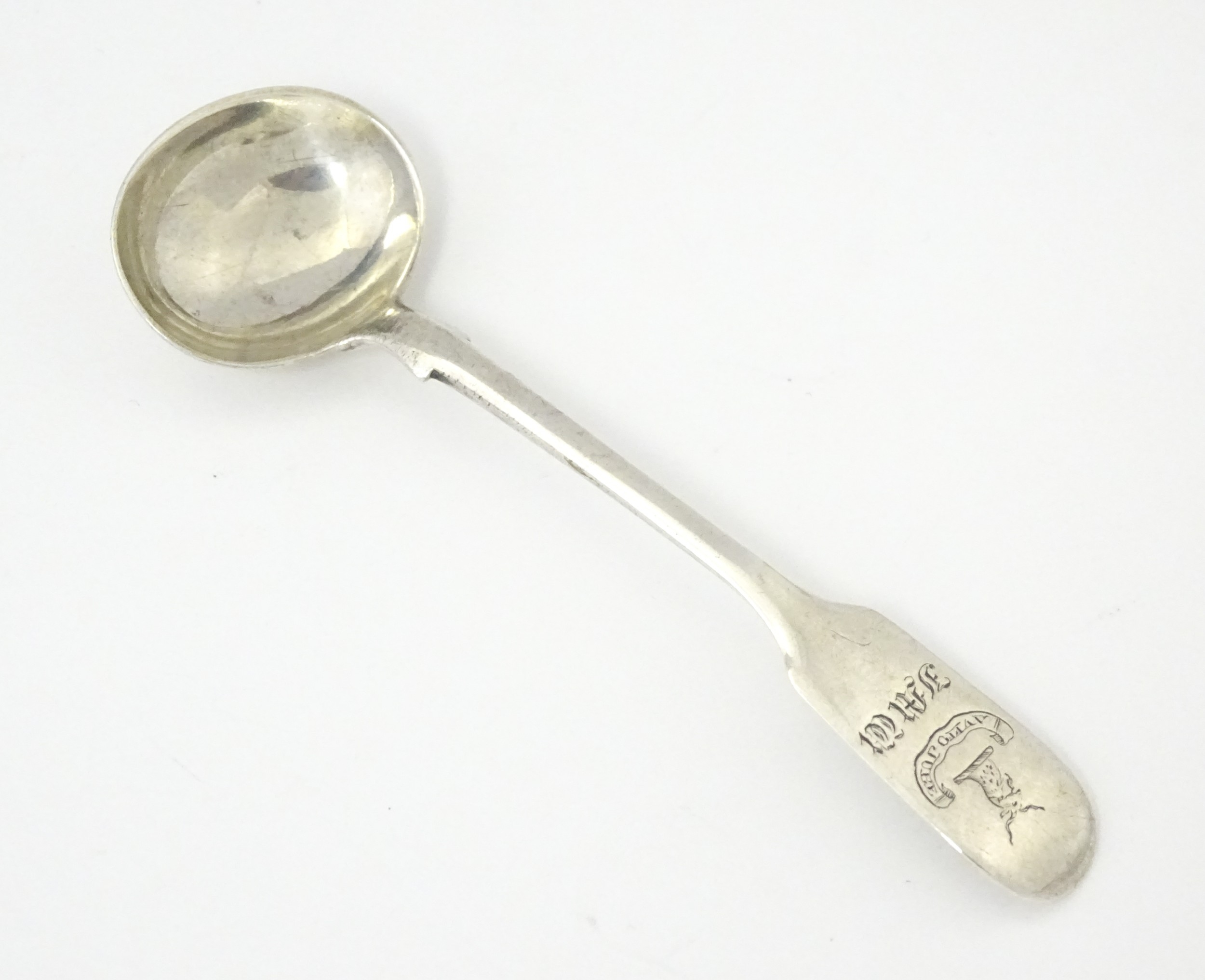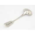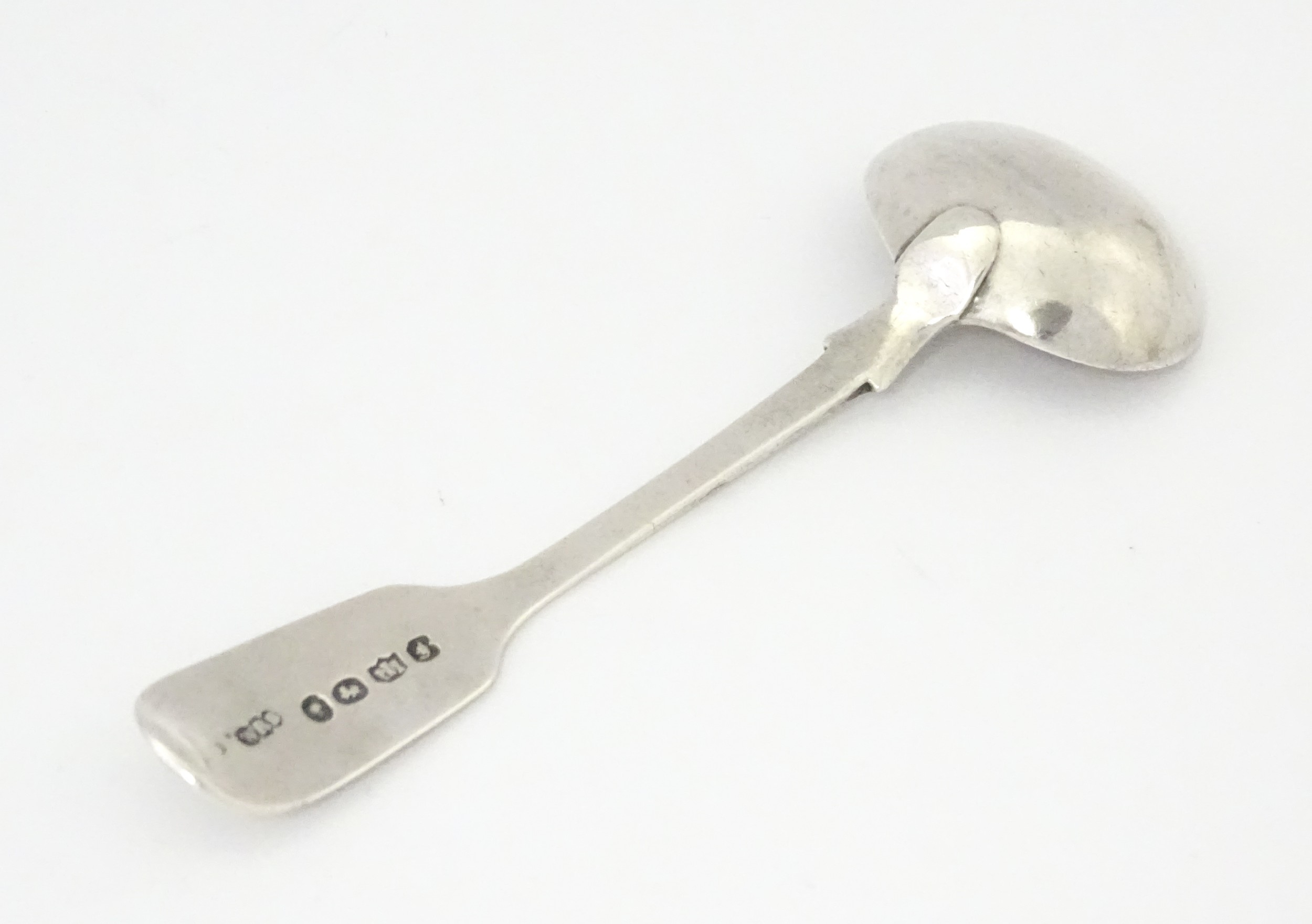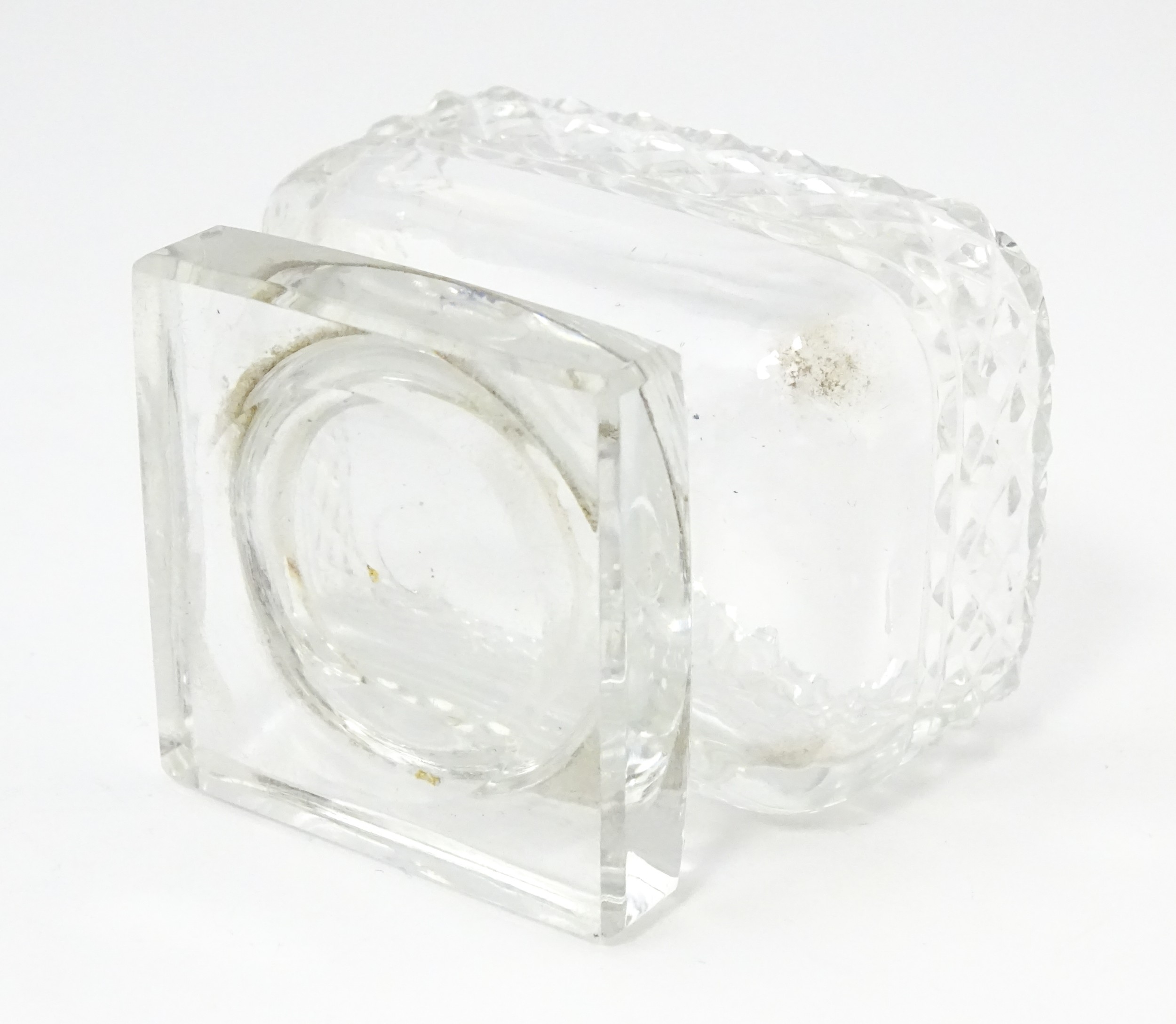 A glass pedestal table salt of oblong form. Together with a Victorian silver Fiddle pattern salt spoon hallmarked Exeter 1842, maker Williams Rawlings Sobey. Salt approx. 2" high (2)