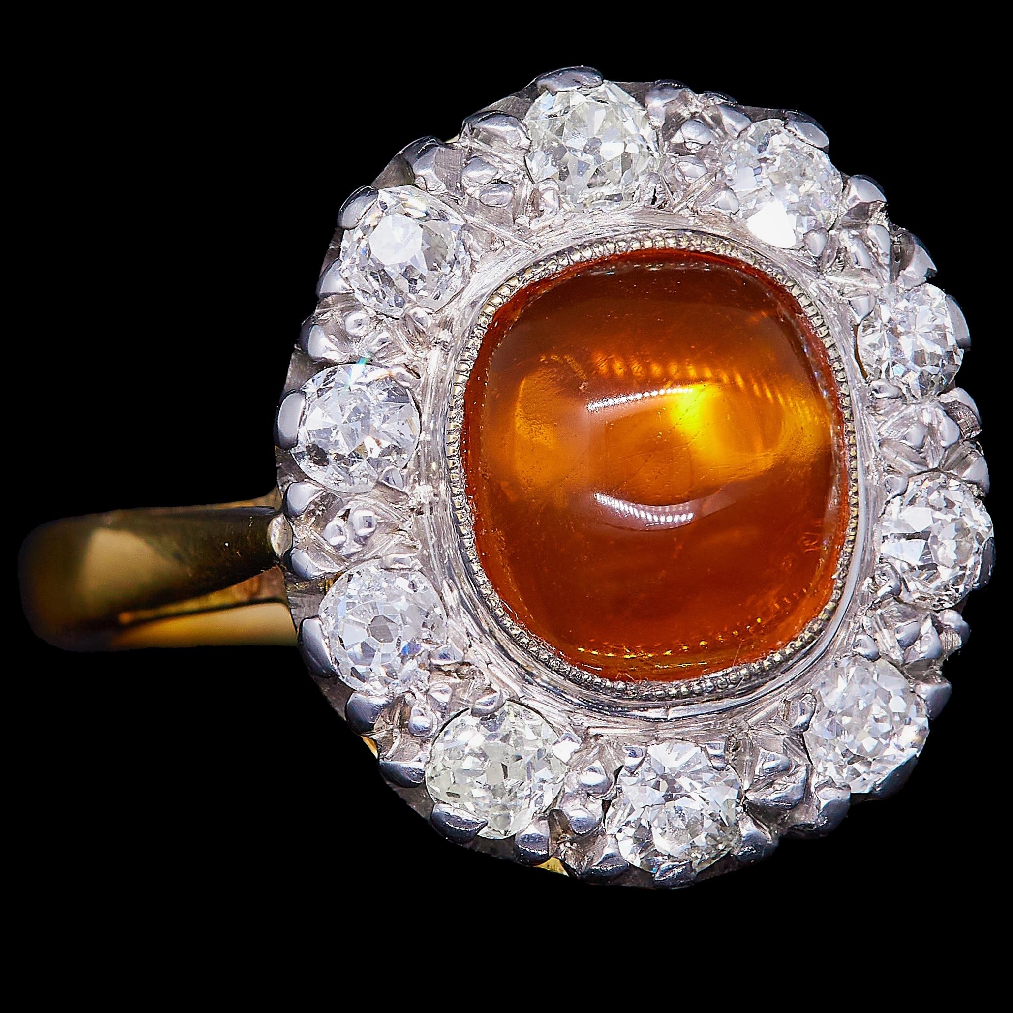 ANTIQUE OPAL AND DIAMOND CLUSTER RING, set with a central cabochon cut opal of approx. 1.24 ct. Surrounded by diamonds totalling approx. 0.80 ct. Size L 1/2. 5.5 grams.