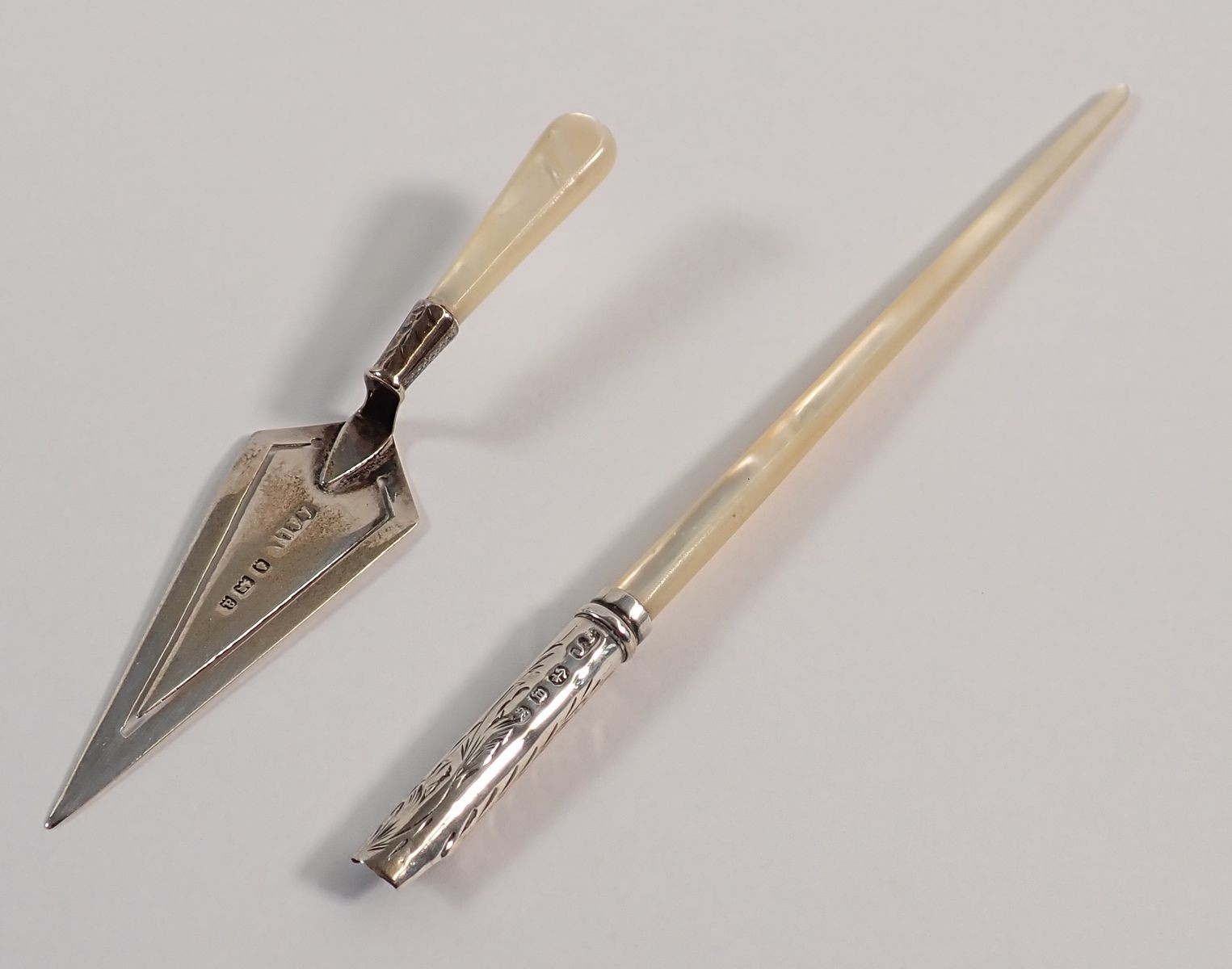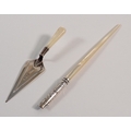 A silver trowel form bookmark, 11cm long and dip pen with mother of pearl handle